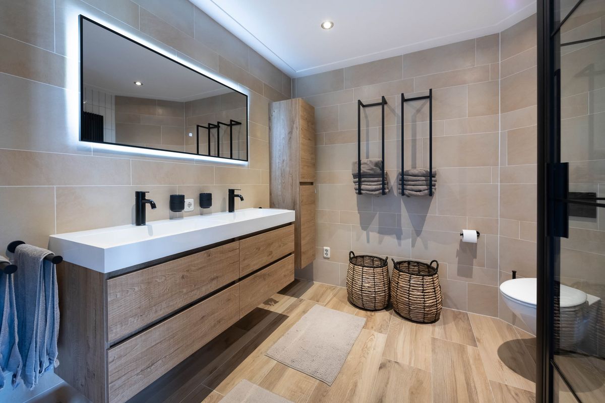 De luxe badkamer, vernieuwd in 2021, is uitgerust met een brede wastafel met twee waskommen, een ruime douche met regendouche en een modern toilet. De ruimte is geheel betegeld.