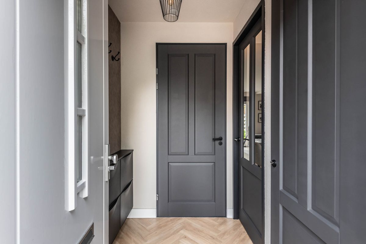 Via de voortuin bereikt u de entree. Bij binnenkomst voelt u meteen de luxe sfeer, dankzij de visgraatvloer en de fraaie hoge paneeldeuren. In de hal treft u de meterkast en het moderne toilet met fonteintje.