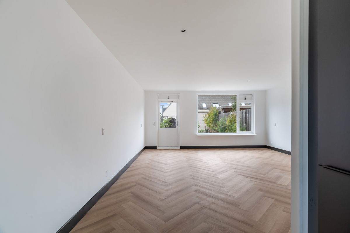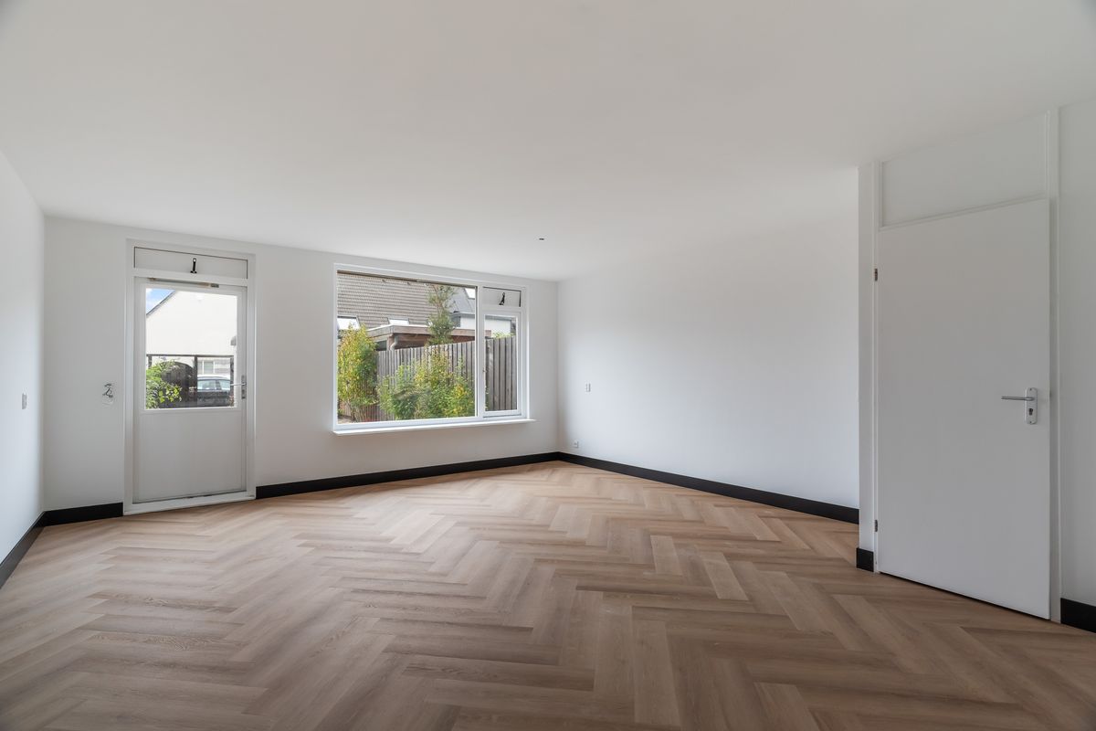 Entree met hal, meterkast, vernieuwd toilet met fonteintje en trapopgang naar de eerste verdieping. De woonkamer is sfeervol en licht, met glad gestucte wanden en een moderne pvc-visgraatvloer die naadloos overloopt in de keuken. De keuken in L-opstelling (2025) bevindt zich aan de voorzijde en is uitgerust met diverse inbouwapparatuur: koel-vriescombinatie met oven, inductiekookplaat, afzuigkap, vaatwasser en spoelbak. Via de loopdeur in de woonkamer stap je de zonnige achtertuin in.