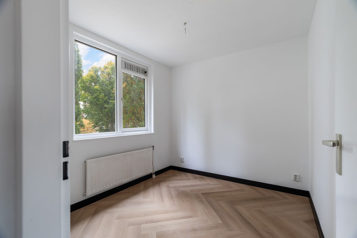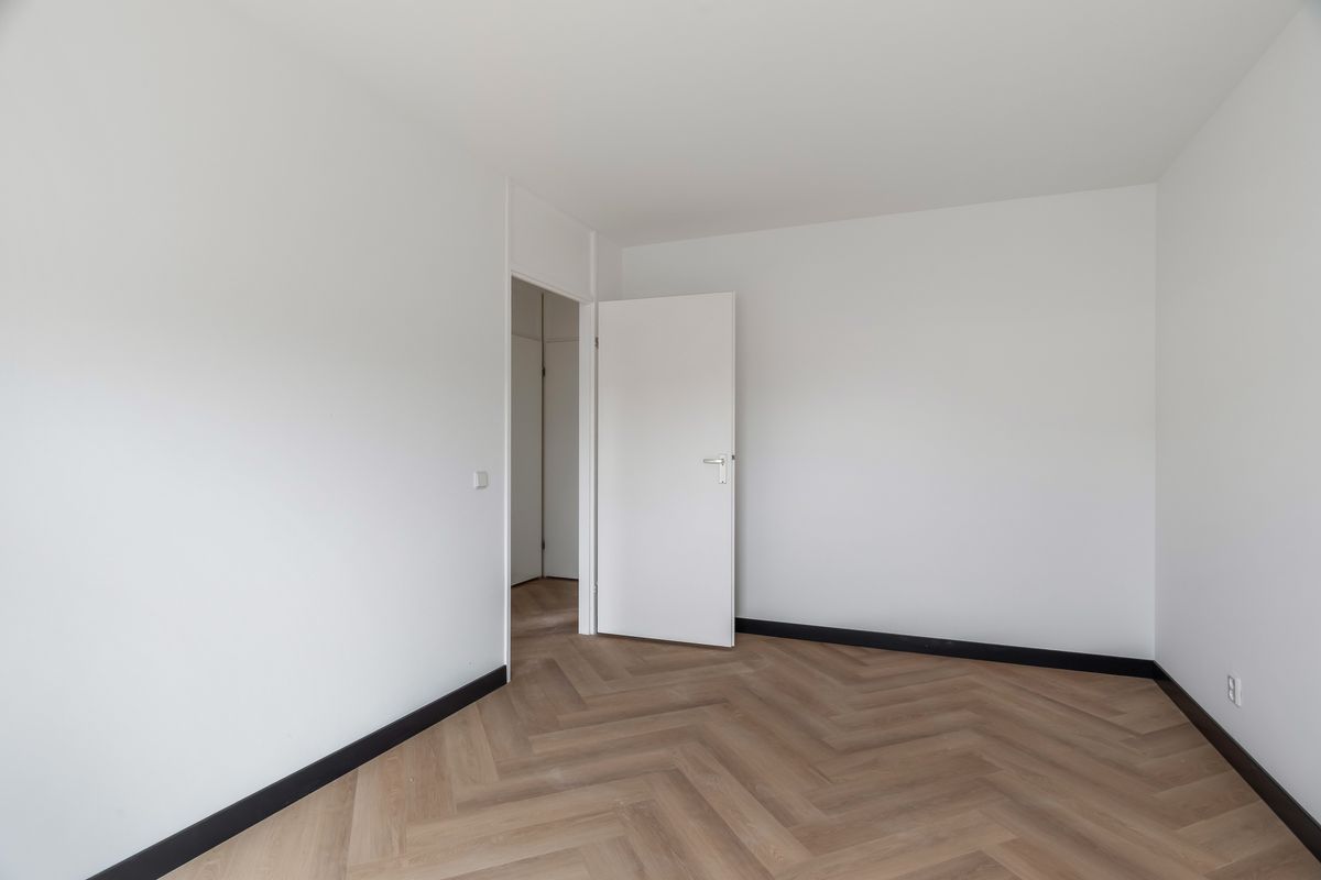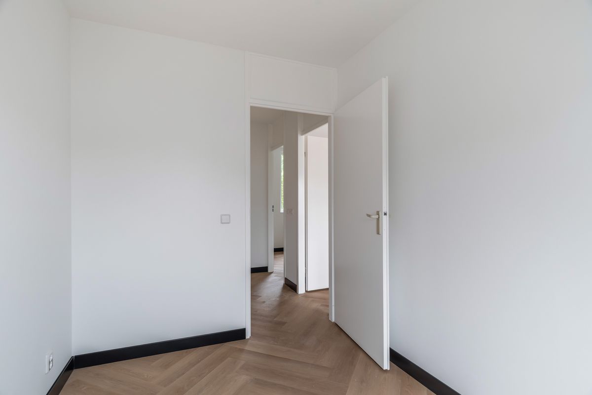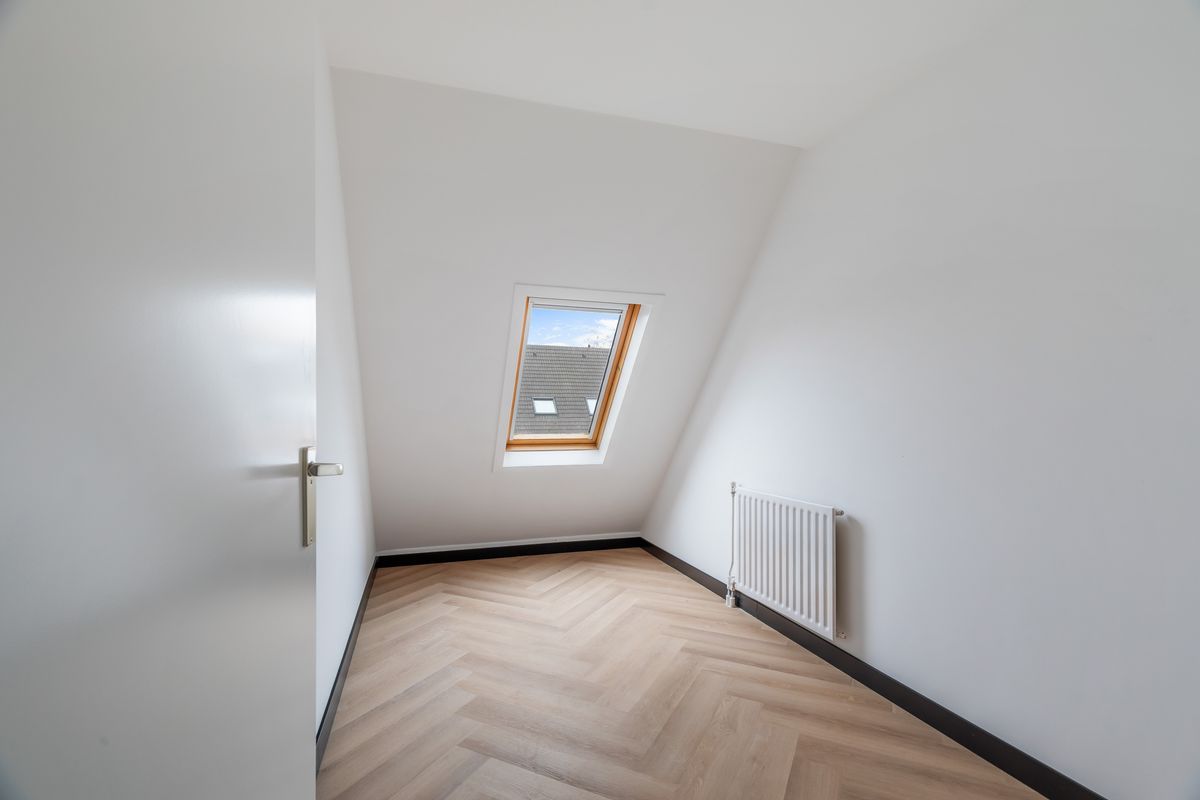 Overloop met toegang tot drie slaapkamers en de recent vernieuwde badkamer (2025), uitgevoerd in moderne stijl met douche, wastafelmeubel en tweede toilet. Ook op deze verdieping zijn de vloeren voorzien van pvc-visgraat en de wanden strak gestuct. Aan de achterzijde ligt de grootste slaapkamer met daarnaast de derde slaapkamer. De badkamer en tweede slaapkamer liggen aan de voorzijde.