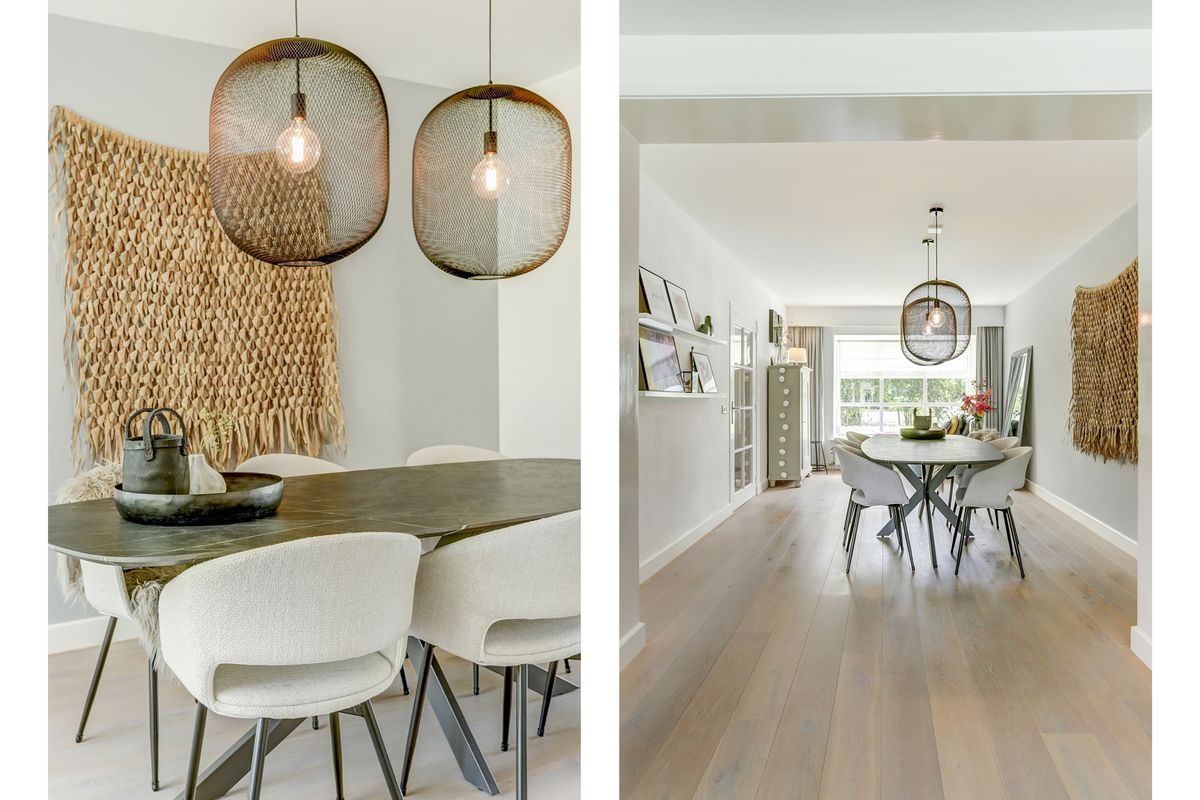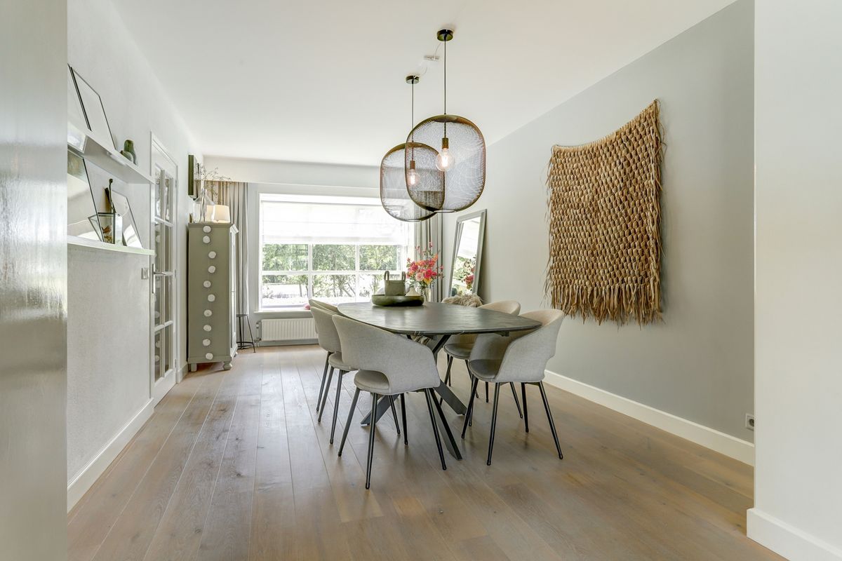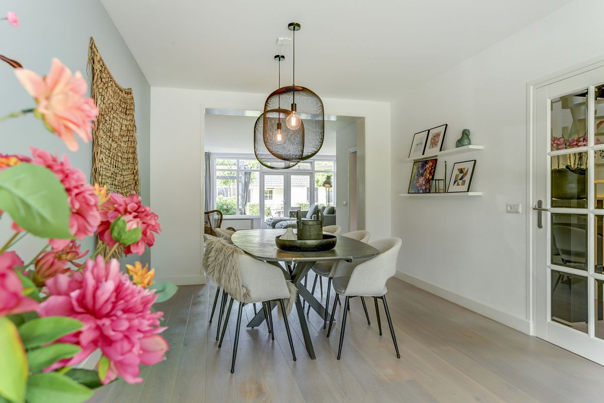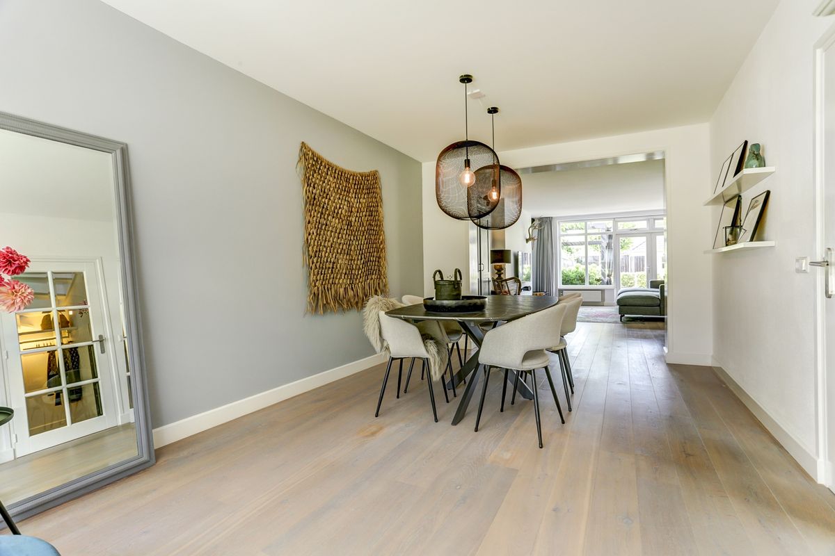 Wat een heerlijke ruimte om te verblijven. De woonkamer is fraai afgewerkt met een houten vloer met vloerverwarming, strakke wanden en strak gestucte plafonds. Aan de voorzijde is een prachtige erker geplaatst, een sfeervolle eyecatcher die niet alleen zorgt voor extra licht, maar ook een sfeervol hoekje biedt, ideaal om 's ochtends een kop koffie te drinken in de ochtendzon. De eetkamer biedt volop plek voor een eethoek. Hier kun je met het hele gezin genieten van lange diners en spelletjesavonden.
