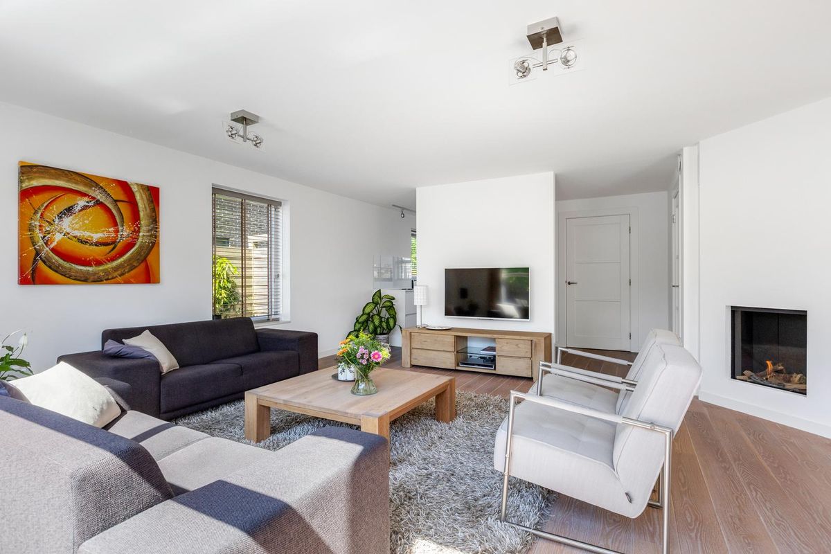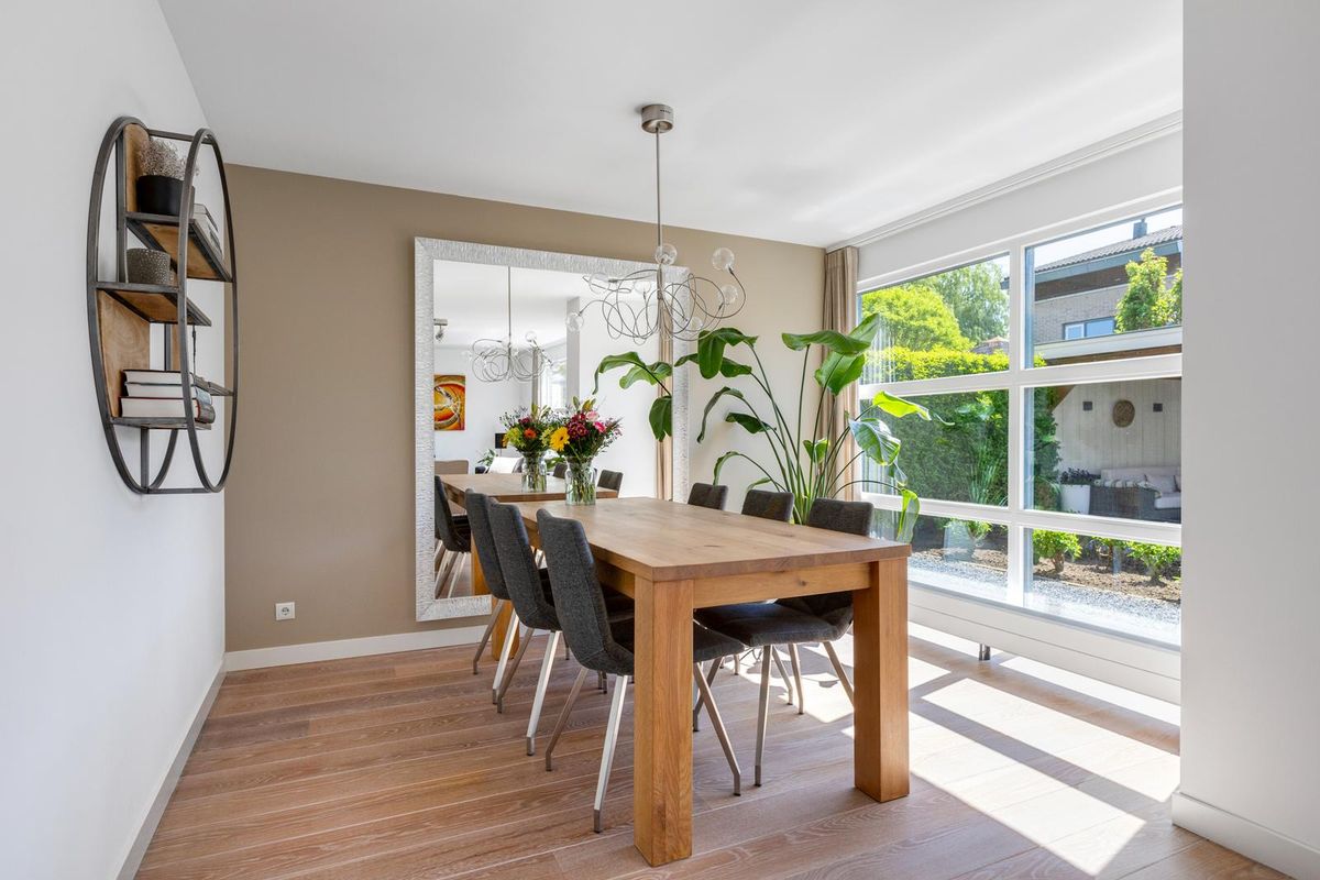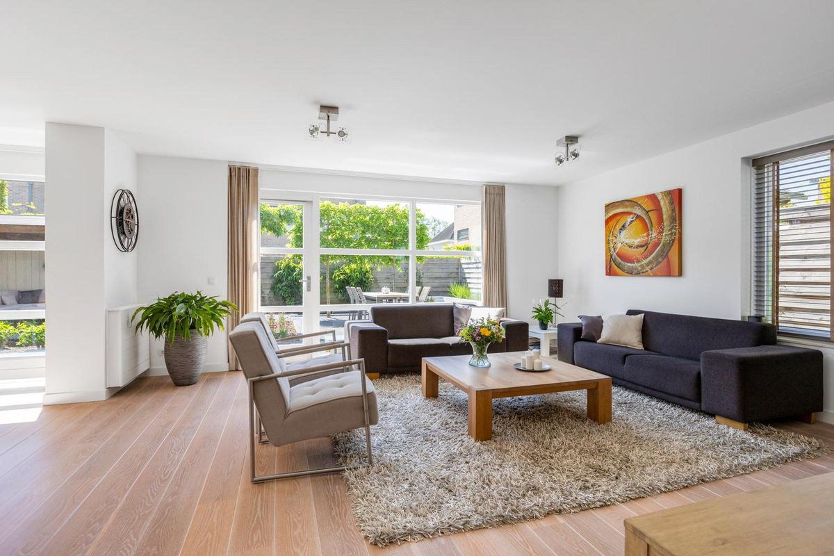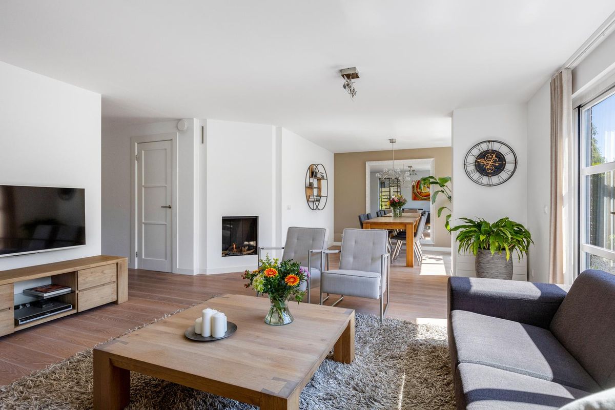 Via de hal kom je binnen in de living, het hart van de woning. Het vele daglicht, strak gestucte wanden en een natuurlijke eikenhouten vloer vormen samen de ideale basis voor het creëren van een gezellige zithoek. Dankzij een uitbouw is er ook ruimte voor een eethoek. Samen uitgebreid tafelen, een spelletje spelen of ’s avonds languit op de bank, het kan hier allemaal!