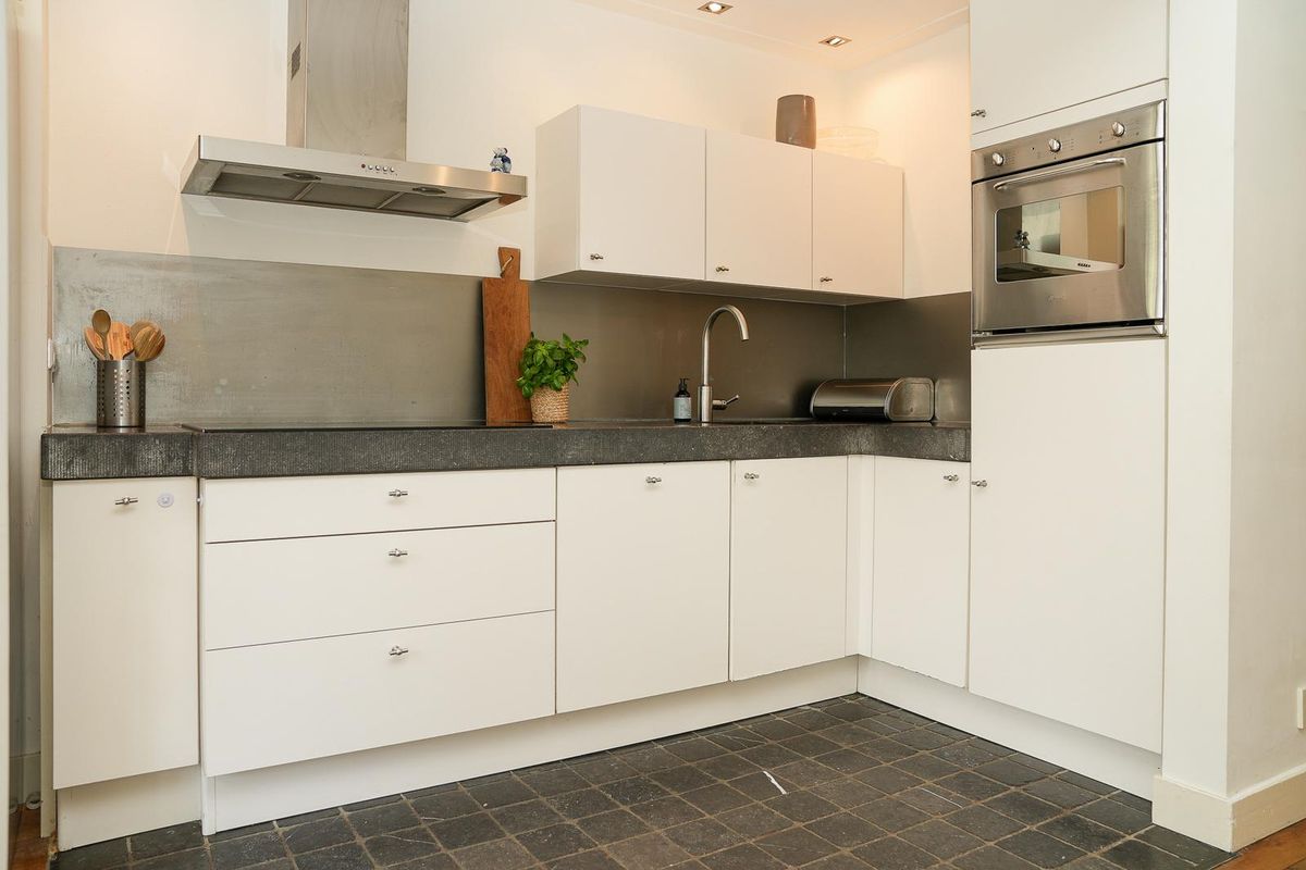 Entree, ruime hal met toilet en fonteintje. Vanuit de hal stap je de lichte woonkamer in, voorzien van erker en doorloop naar de royale open leefkeuken. De keuken is uitgerust met een dik aanrechtblad en diverse inbouwapparatuur (spoelbak, kookplaat, afzuigkap, vaatwasser en combi-oven). Via de hoge openslaande deuren bereik je de zonnige achtertuin, gelegen op het westen en voorzien van een praktische berging.
