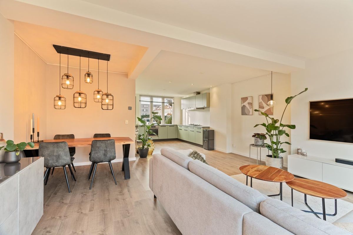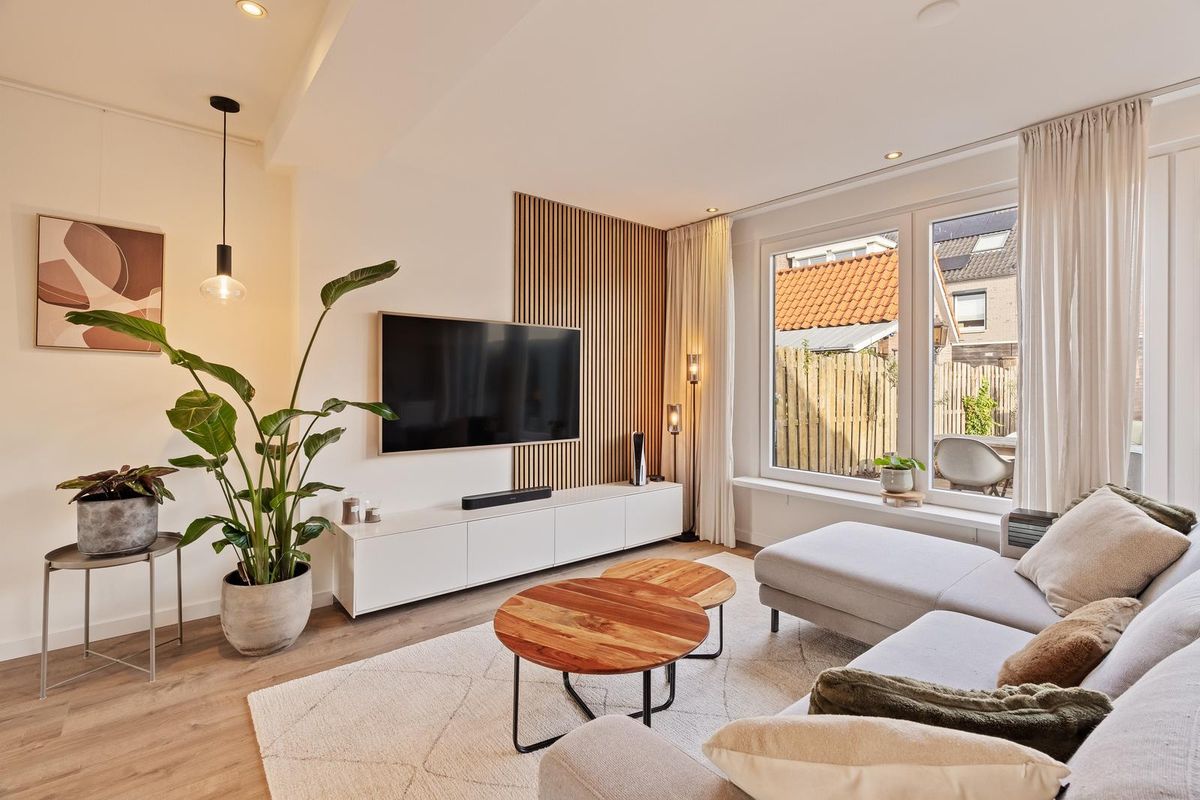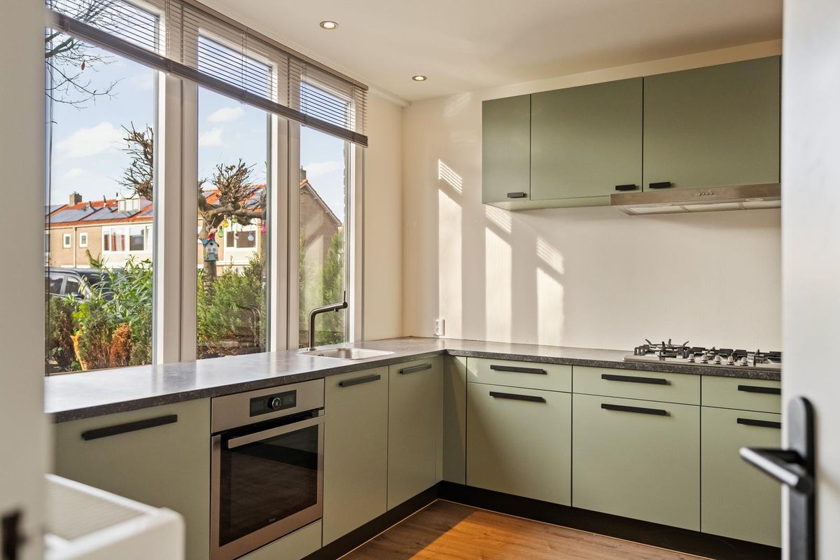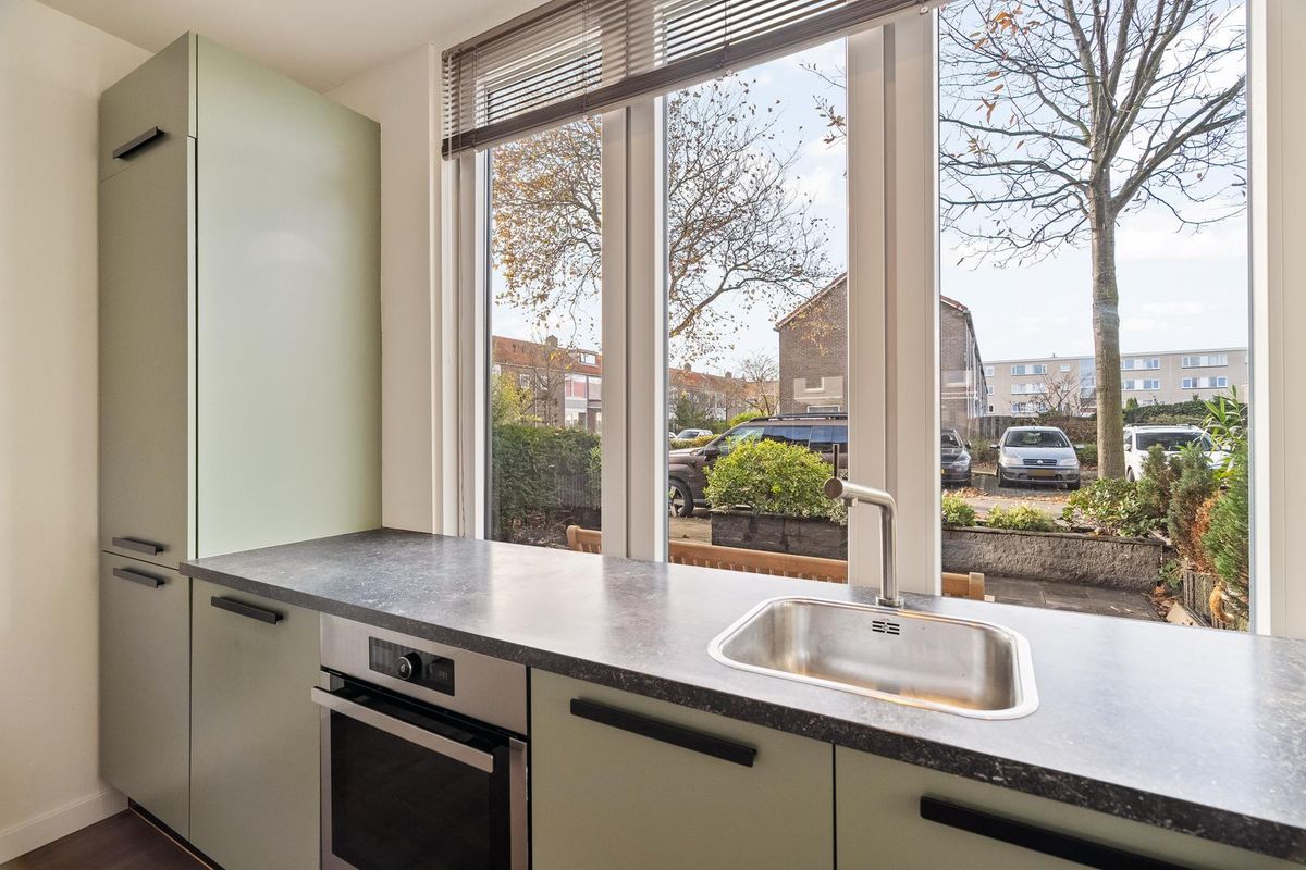 De lichte woonkamer valt direct op door de glad gestucte wanden en plafonds, de zeer nette vloerafwerking, de sfeervolle inbouwspots en de grote raampartijen. In 2015 is de woning uitgebouwd, waardoor er een royale leefgedeelte is ontstaan. De moderne open keuken aan de voorzijde van de woning is voorzien van diverse inbouwapparatuur, waaronder een koel-vriescombinatie, 5-pits gaskookplaat, RVS-afzuigschouw, vaatwasser en combi-oven, en is eveneens fraai afgewerkt met inbouwspots. Via de loopdeur is de zeer zonnige en ruim 11 meter diepe tuin te bereiken met vrijstaande stenen berging en achterom.