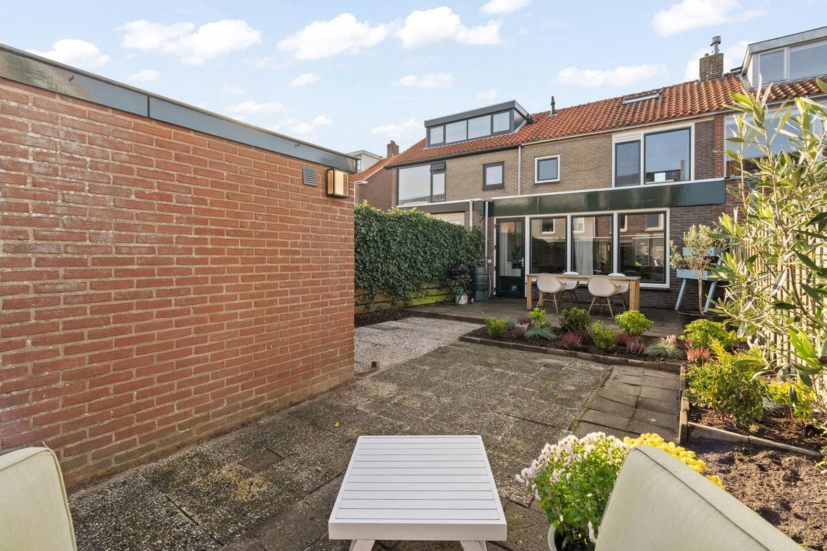 De achtertuin is diep en biedt meerdere zithoeken, een stenen berging met elektra en een achterom. De diepte van de tuin maakt het een prettige plek om te ontspannen, te spelen of te tuinieren.