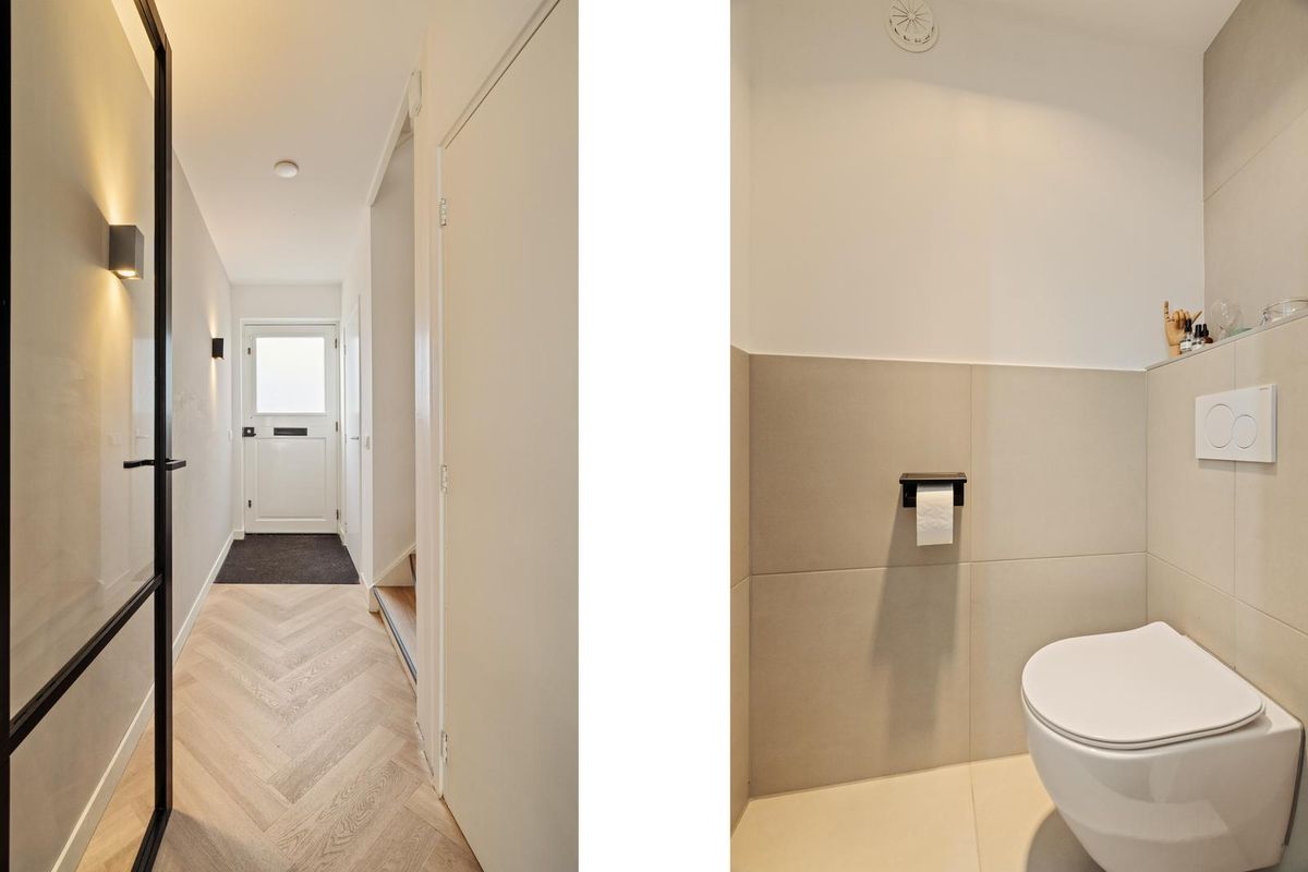 Via de strakke en onderhoudsvrije voortuin bereik je de entree van de woning. In de hal bevinden zich de moderne toiletruimte met vrijdragend toilet en de stijlvolle zwarte deur naar de woonkamer. Aan de voorzijde tref je een gezellige zithoek; aan de achterzijde ligt de prachtige moderne open woonkeuken met kookeiland, barfunctie en luxe inbouwapparatuur. De begane grond is voorzien van vloerverwarming.