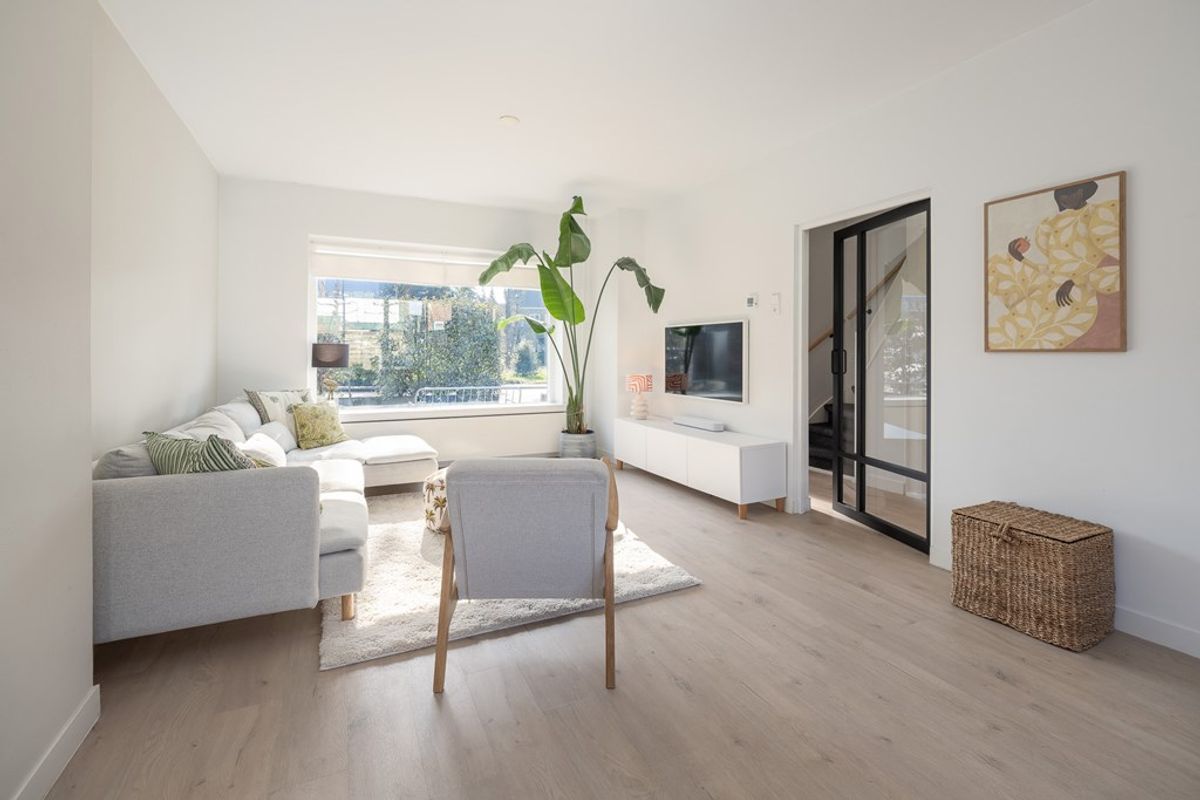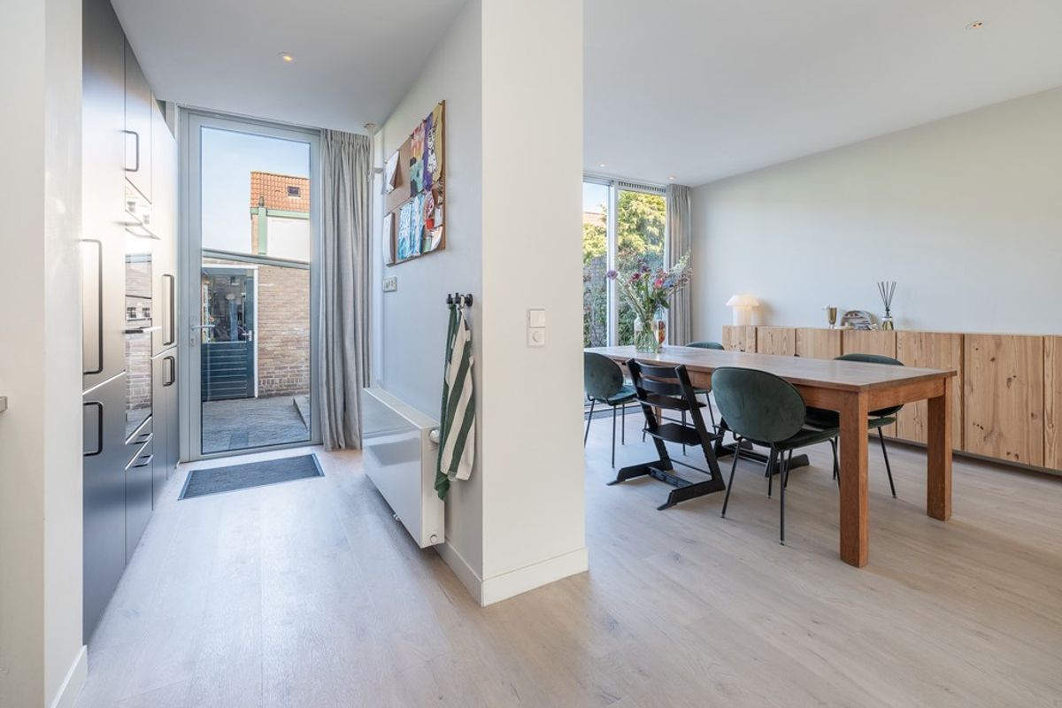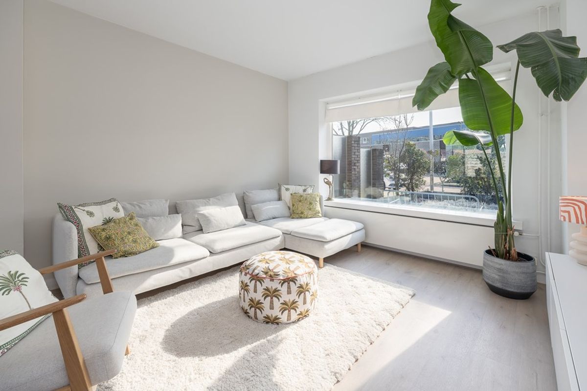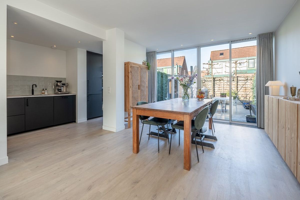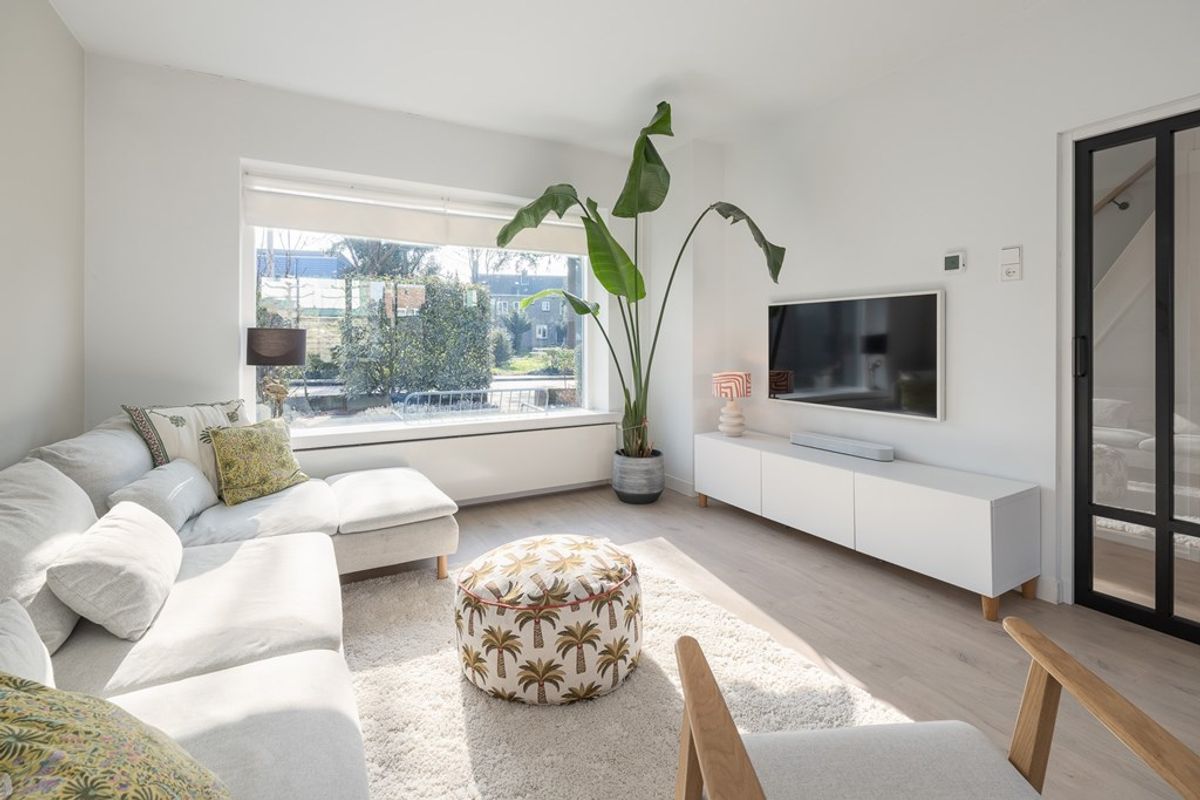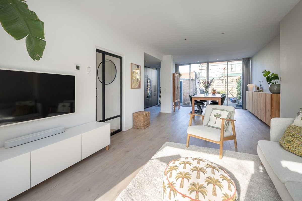 De uitgebouwde woonkamer is voorzien van een klik PVC vloer, glad gestuukte wanden en keurig net gestuukt plafond. De gedeeltelijke tussenmuur naar de keuken geeft een speels effect met een praktische doorgang. Een grote schuifpui geeft toegang tot de besloten tuin.