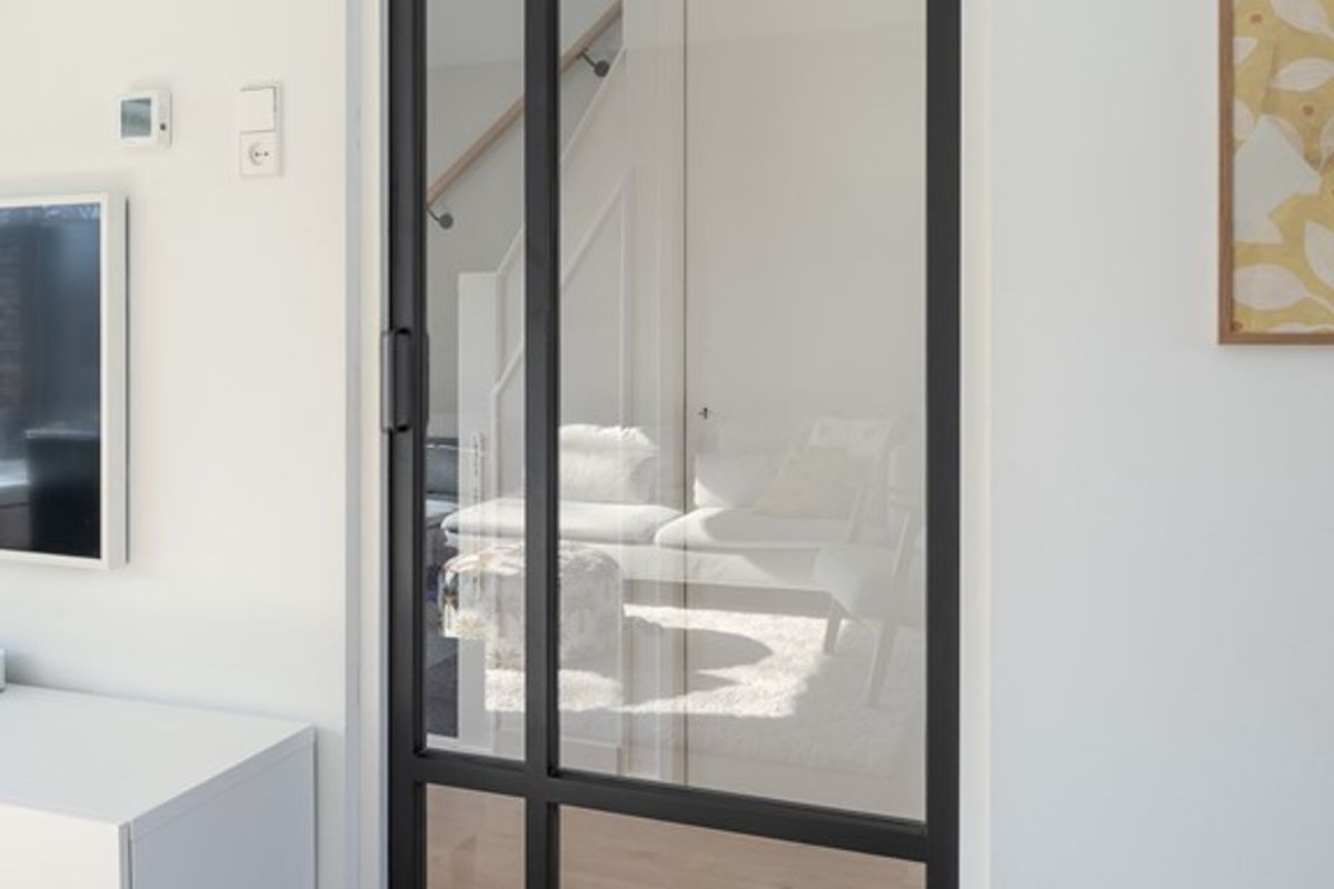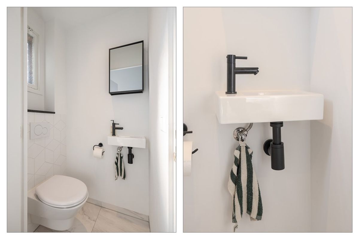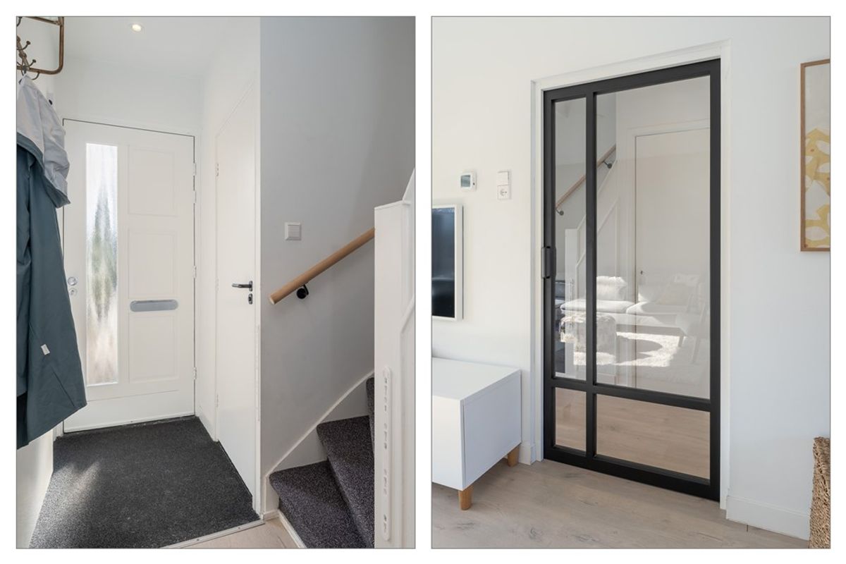 De entree met hal, trapopgang naar de verdieping, trapkast met bergruimte, moderne meterkast, en luxe toiletruimte met fonteitje, geeft via een op maat gemaakte zwarte tussendeur toegang tot de lichte woonkamer met open keuken.