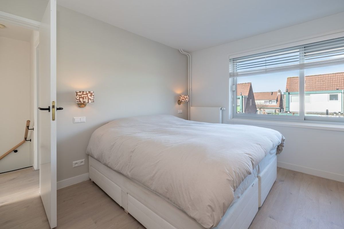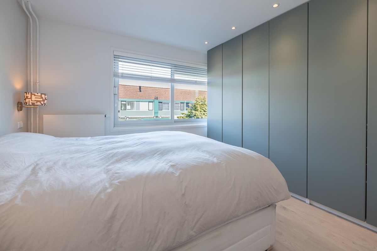 De ouder slaapkamer van ca. 14 m2 en de kleinere slaapkamer liggen aan de achterzijde. De derde slaapkamer ligt aan de voorzijde en beslaat ca. 9 m2. De ruime badkamer, met elektrische vloerverwarming, is betegeld met zowel vloer als wandtegels, is voorzien van een inloopdouche, 2e toilet, vaste wastafel in een modern open meubel. Alle leidingen zijn netjes ingefreesd en onzichtbaar.