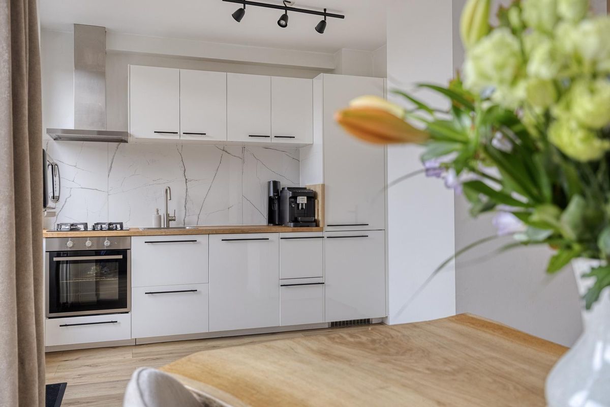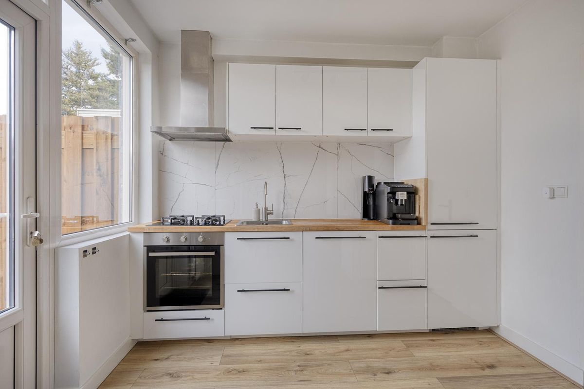 De open, moderne keuken bevindt zich aan de rechterachterzijde van de woning en is voorzien van een 4-pits gasfornuis, oven, afzuigkap, koelkast, vaatwasser en diverse kasten. Een praktische én stijlvolle plek om te koken en samen te genieten.