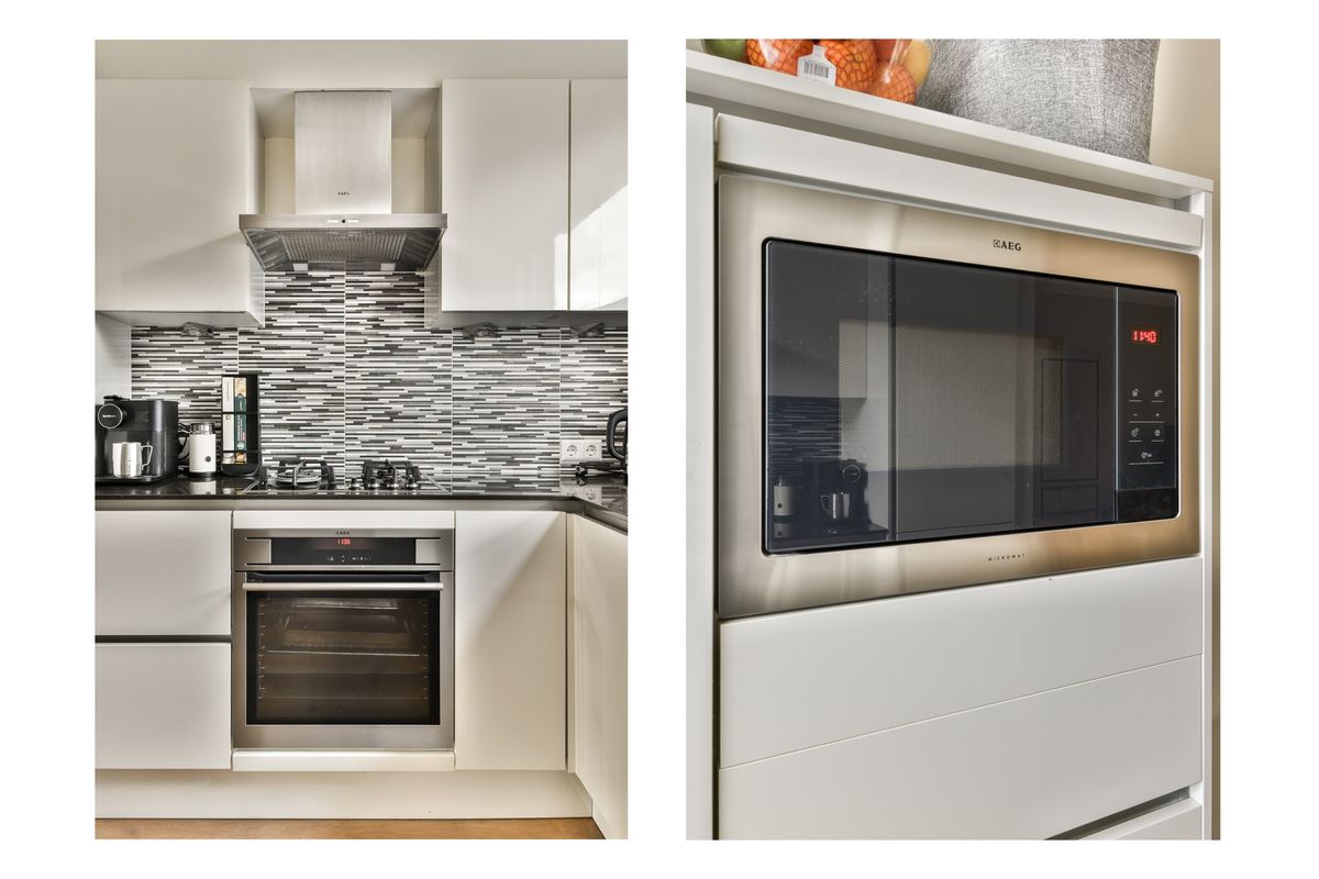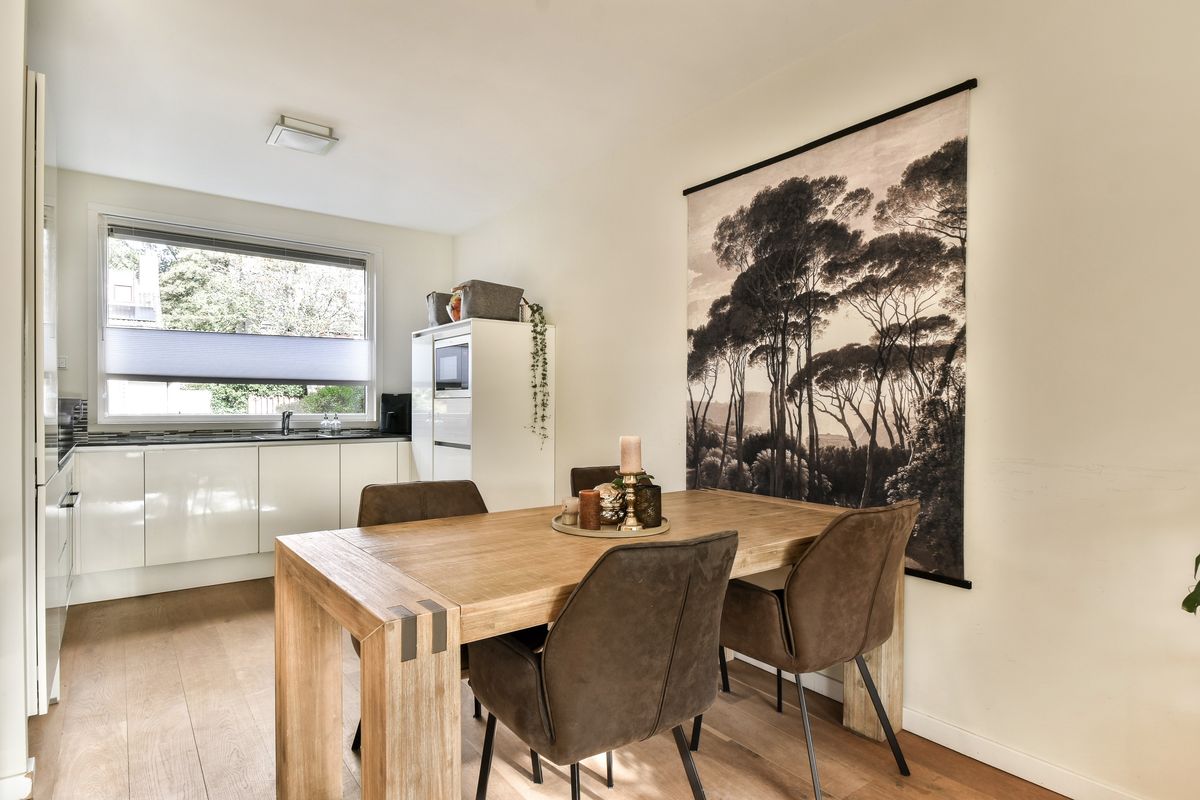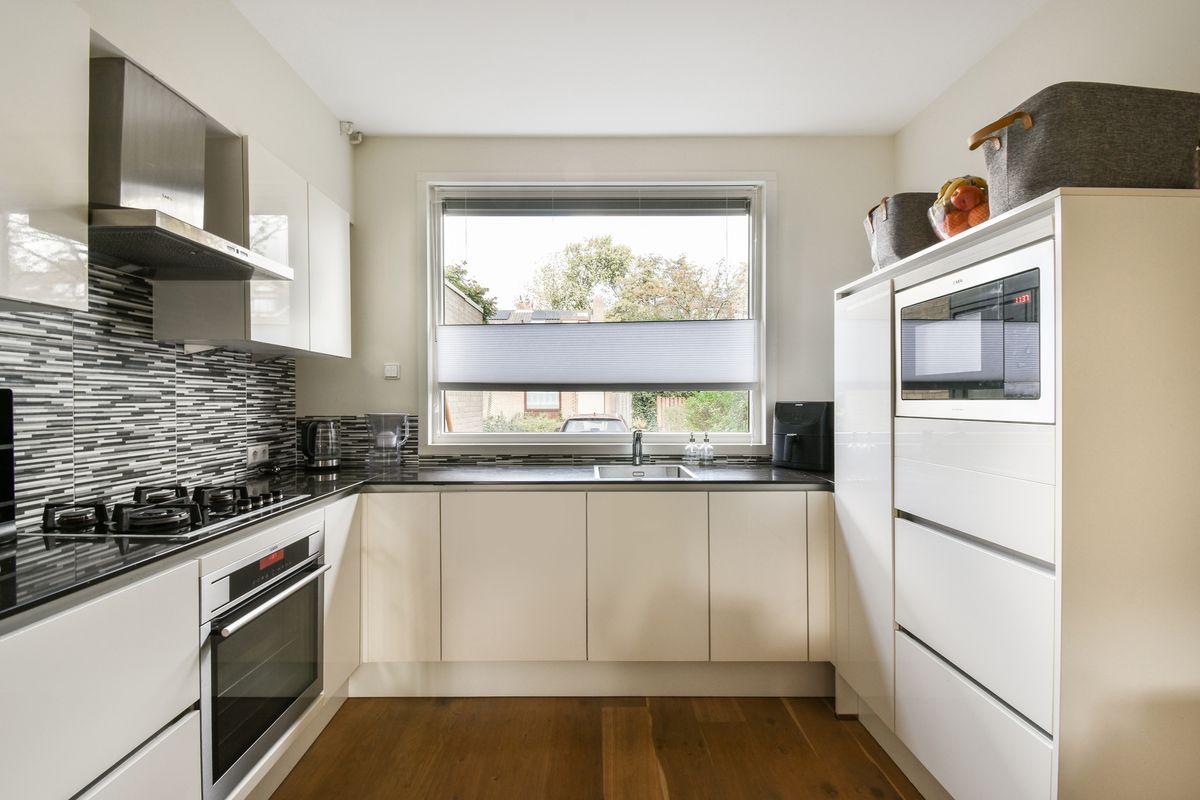Aan de voorzijde bevindt zich de moderne keuken uit 2017, die volledig is uitgerust met onder meer een koel-vriescombinatie, oven, magnetron, 4-pits gaskookplaat, afzuigkap, apothekerskast, close-in boiler en een vaatwasser uit 2025. De keuken biedt niet alleen alle praktische voorzieningen, maar kijkt ook fraai uit over de voortuin waardoor het een rustige en prettige plek is om te koken.