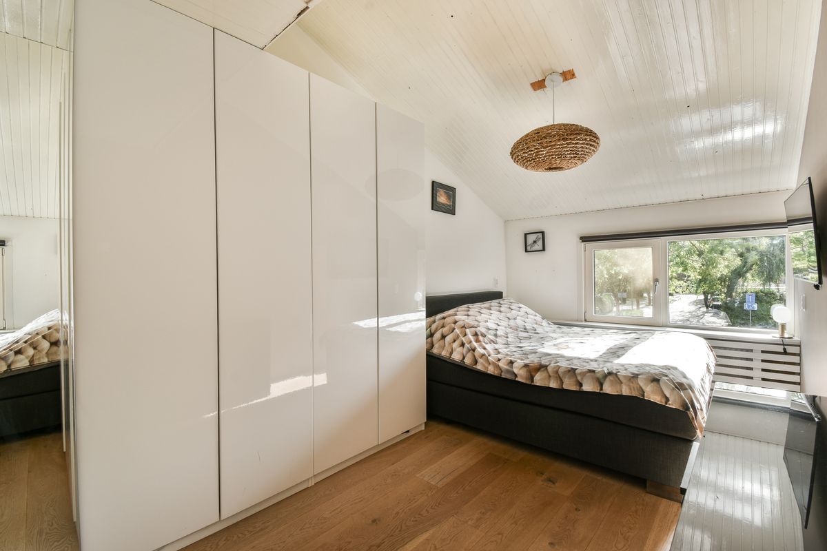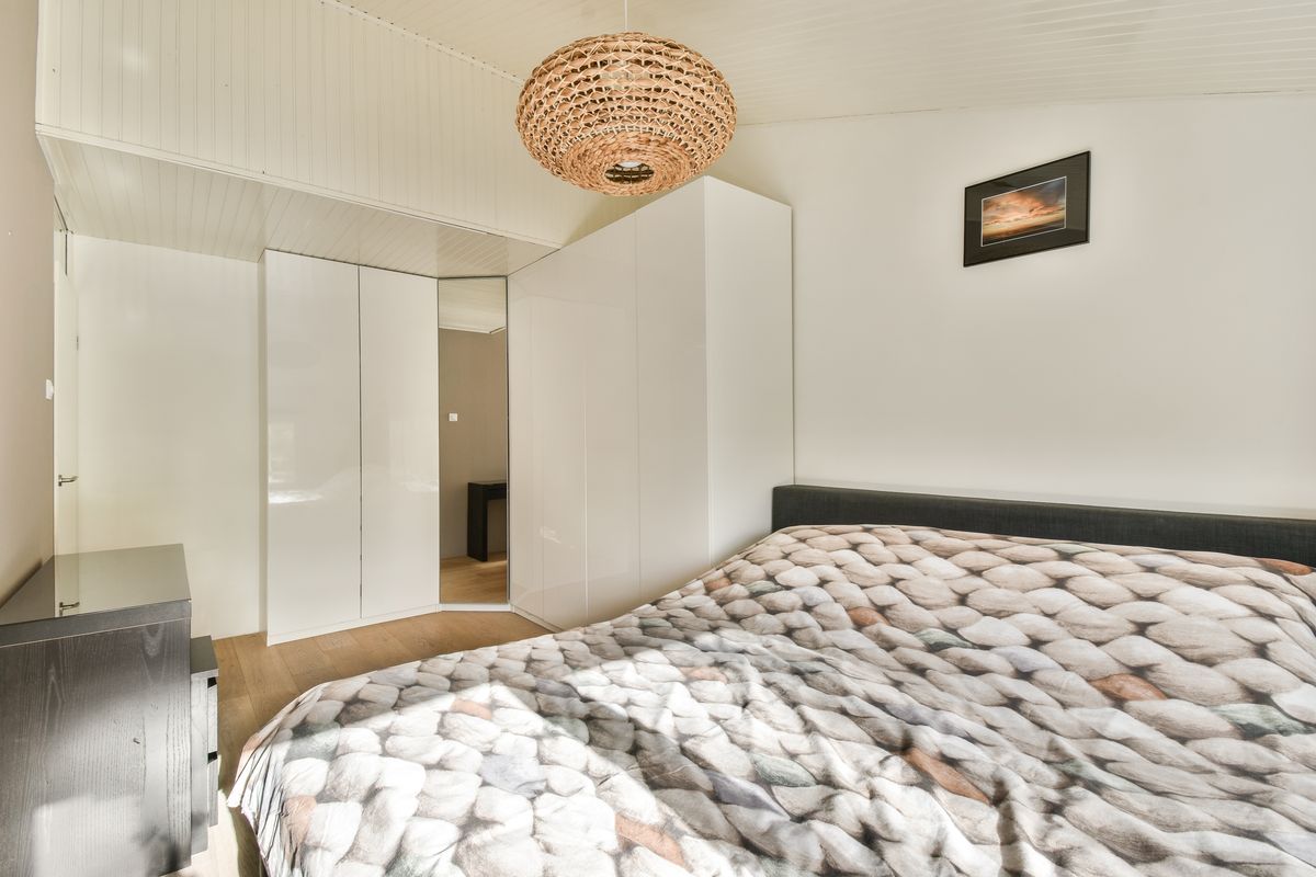 Op de eerste verdieping loopt de eikenhouten vloer moeiteloos door in alle ruimtes. Hier bevinden zich drie lichte slaapkamers, waarvan één met royale vaste kasten, en een moderne badkamer met inloopdouche, hangend toilet, wastafelmeubel, handdoekradiator en mechanische ventilatie. De afwerking is stijlvol en neutraal, waardoor de ruimtes direct prettig aanvoelen.