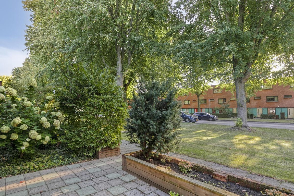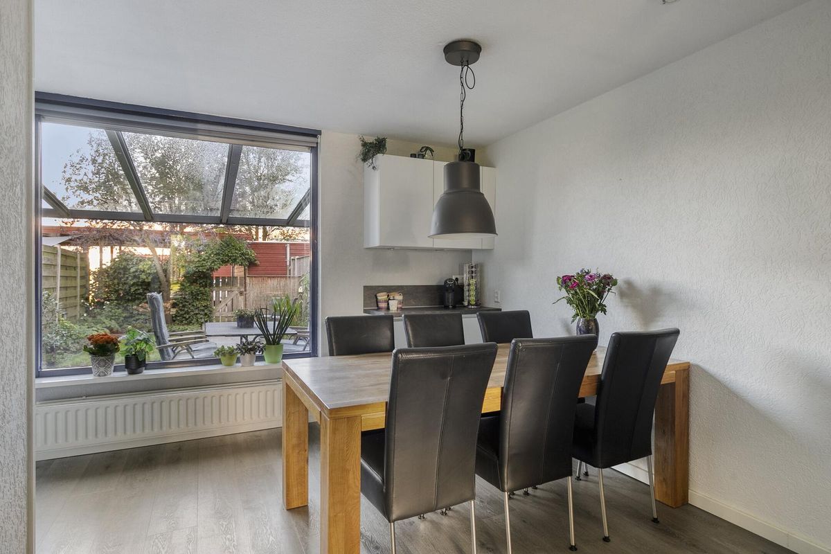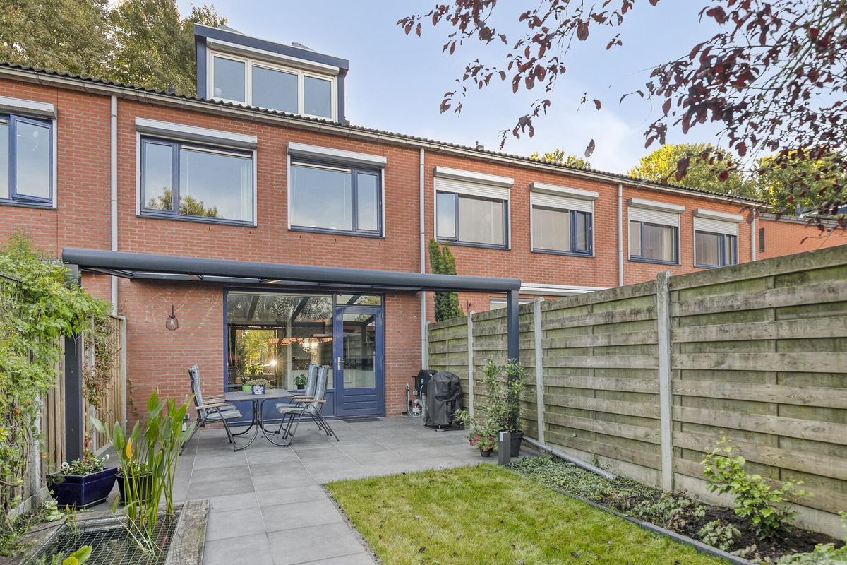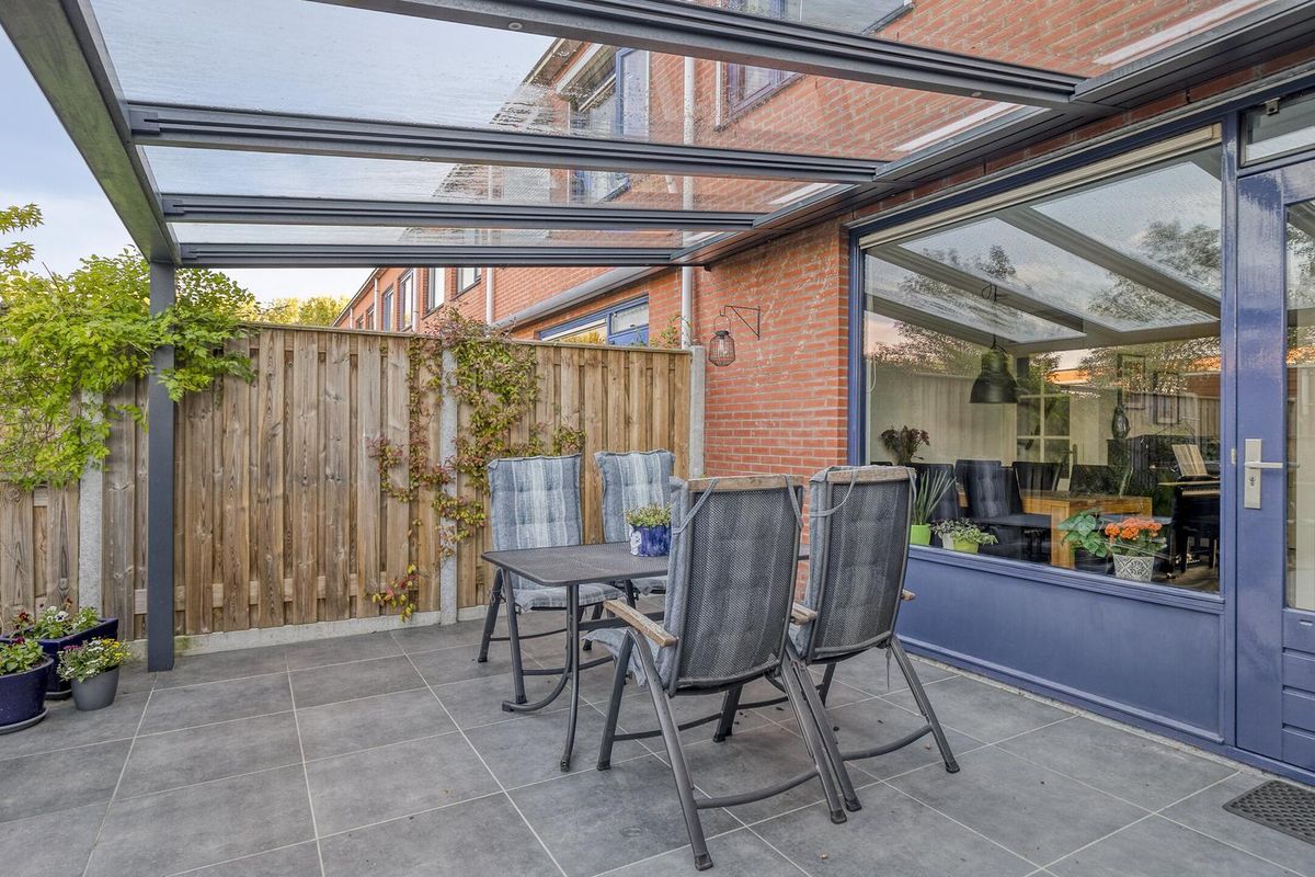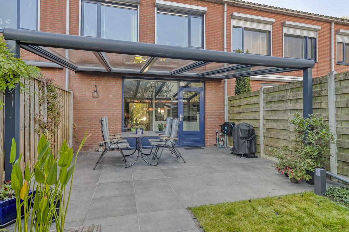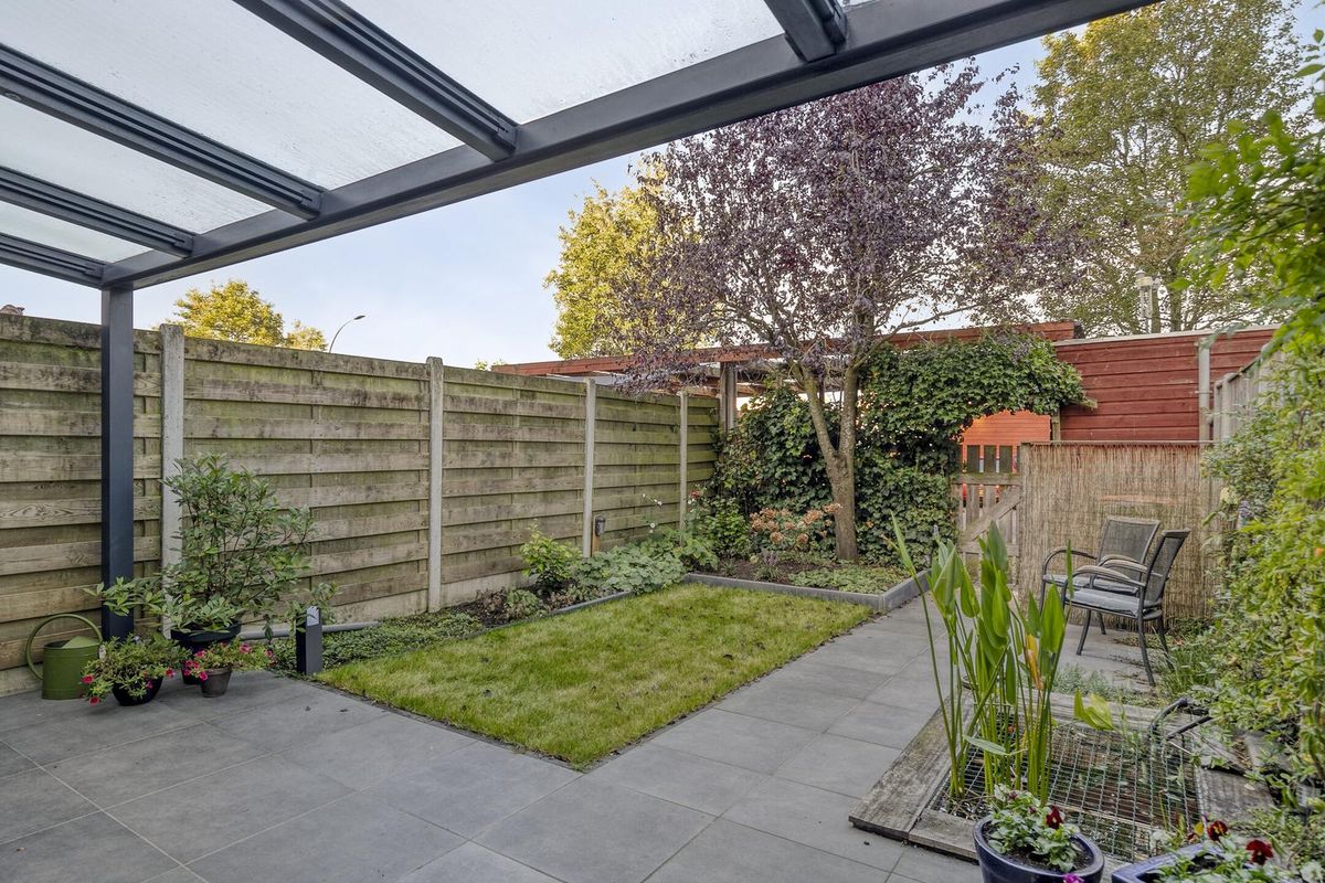 De achtertuin ligt op het noordwesten en daardoor kun je de hele dag genieten van zon of juist schaduw. De aangebouwde terrasoverkapping heeft een glazen daken dak en op afstand bedienbare zonwering en verlichting.