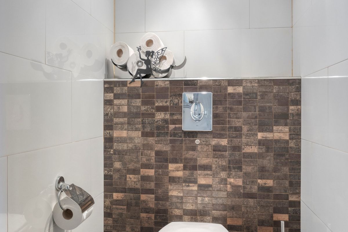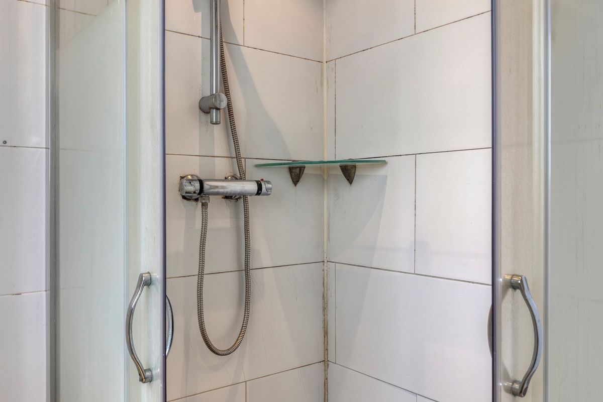 De badkamer is voorzien van een douche, toilet en badkamermeubel.