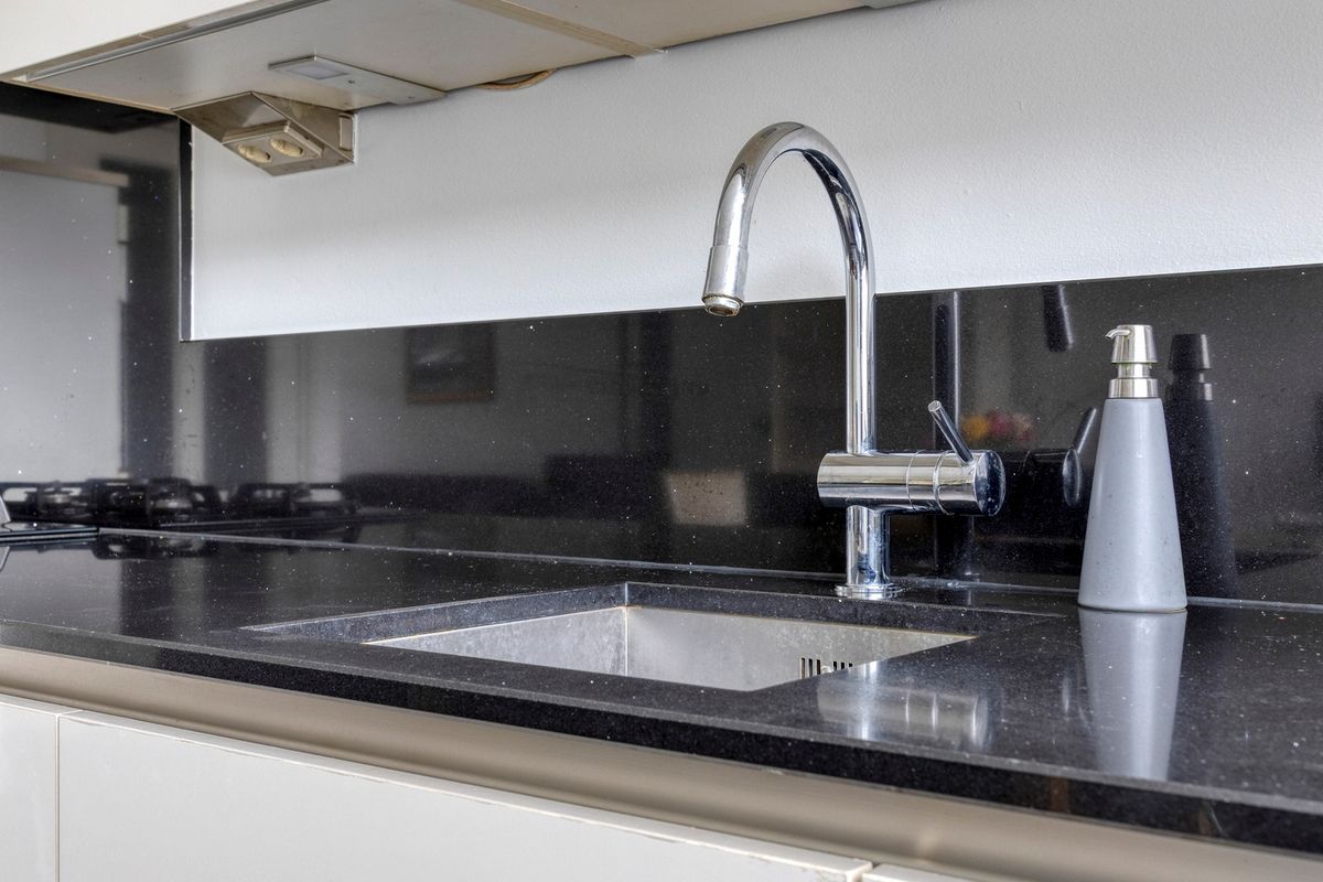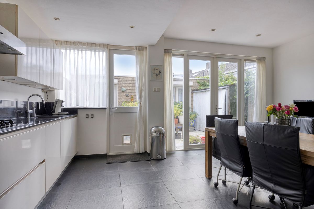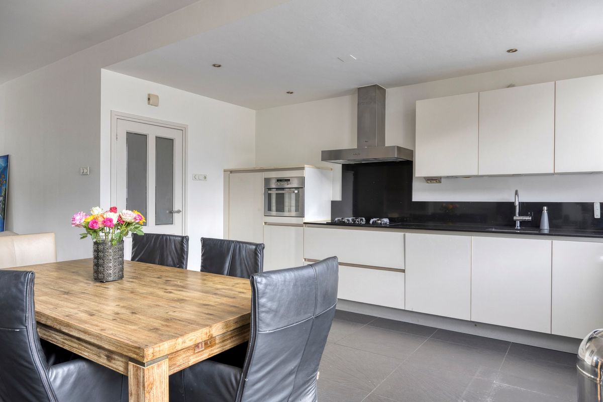 Binnen is het licht en modern. De woonkamer is strak afgewerkt met stucwerk wanden, pelletkachel, inbouwspotjes, antraciet vloertegels en vloerverwarming en openslaande tuindeuren. De open, crèmekleurige keuken past perfect bij de stijl van het huis en is voorzien van alle inbouwapparatuur die je nodig hebt – van oven tot koelkast, mét lekker veel opbergruimte.