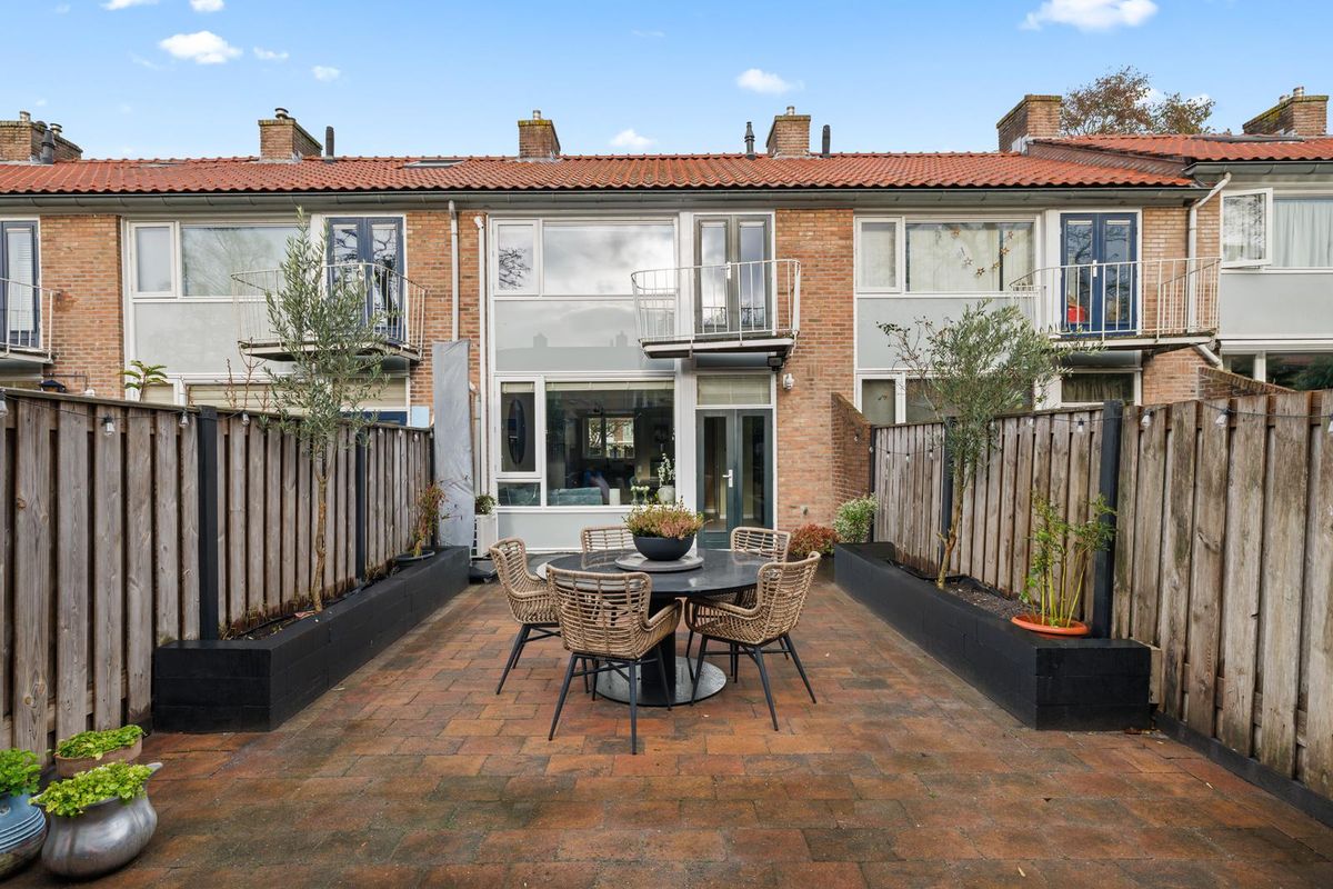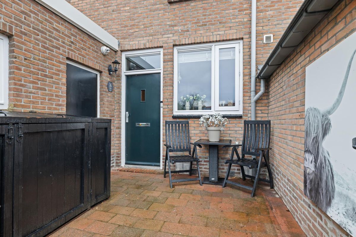 Vanuit de hal op de begane grond heb je toegang tot de berging die aan de voorzijde ligt. De berging is netjes afgewerkt met strakke wanden en spotjes. Aan de andere zijde bevindt zich een buitendeur waardoor je gemakkelijk met je fiets naar buiten kunt. De achtertuin is verzorgd en biedt twee groenbakken, een fijne zitplek en achterin een ruime veranda waar je heerlijk kunt loungen. Via de achterom bereik je eenvoudig de achterzijde van de woning.