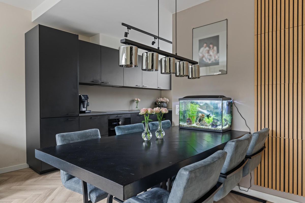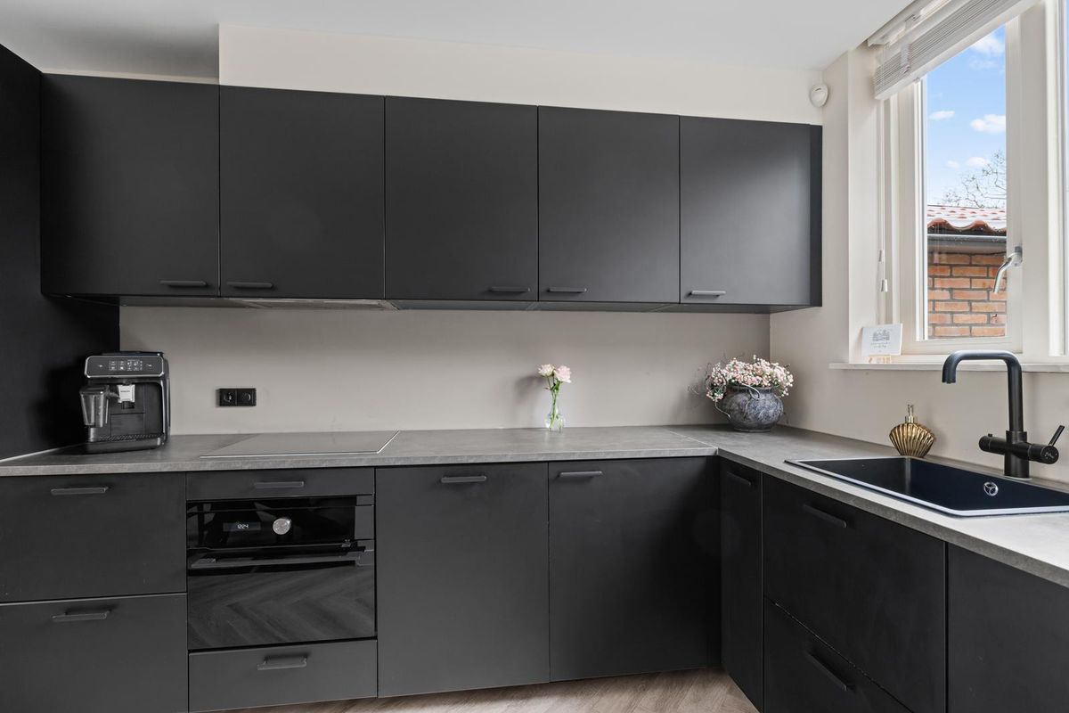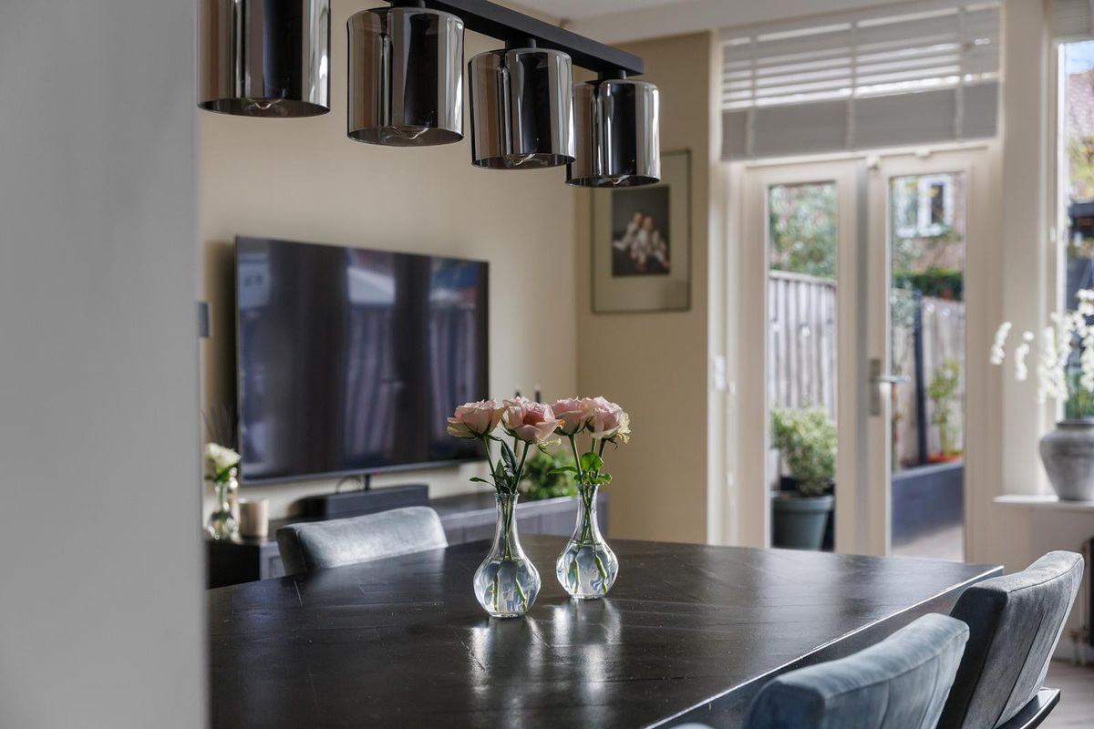 Je komt binnen in de hal waar je toegang vindt tot het toilet en de meterkast. Via een strakke stalen deur stap je de keuken in. De keuken is een praktische L keuken en strak afgewerkt in zwart. Deze moderne keuken uit 2020 is voorzien van diverse inbouwapparatuur zoals een inductiekookplaat met afzuigkap, een koel vriescombinatie, een vaatwasser, een combioven en een Quooker. De keuken ligt aan de voorzijde waardoor je prettig naar buiten kijkt. In het midden van de woning bevindt zich het eetgedeelte. Aan de achterzijde vind je een uitnodigende zithoek waar je heerlijk tot rust komt. De dubbele openslaande deuren zorgen voor veel licht en geven toegang tot de achtertuin. Achter het eetgedeelte vind je een ruime trapkast die ideaal is voor extra opbergmogelijkheden.