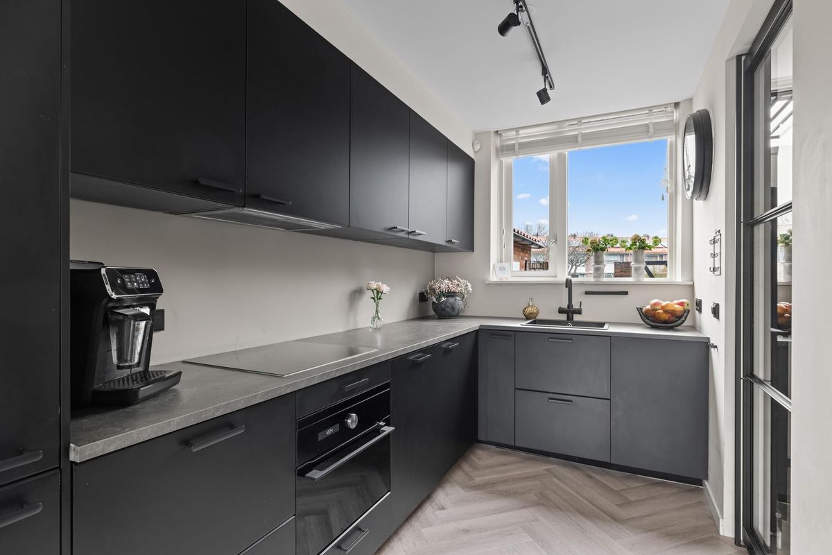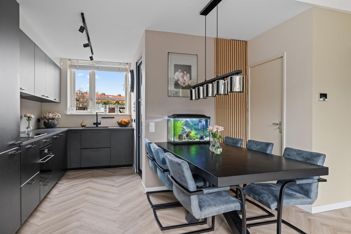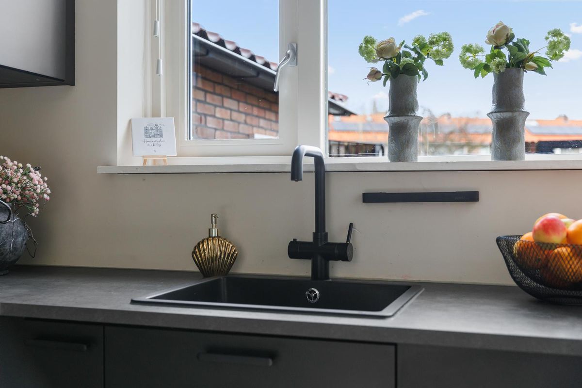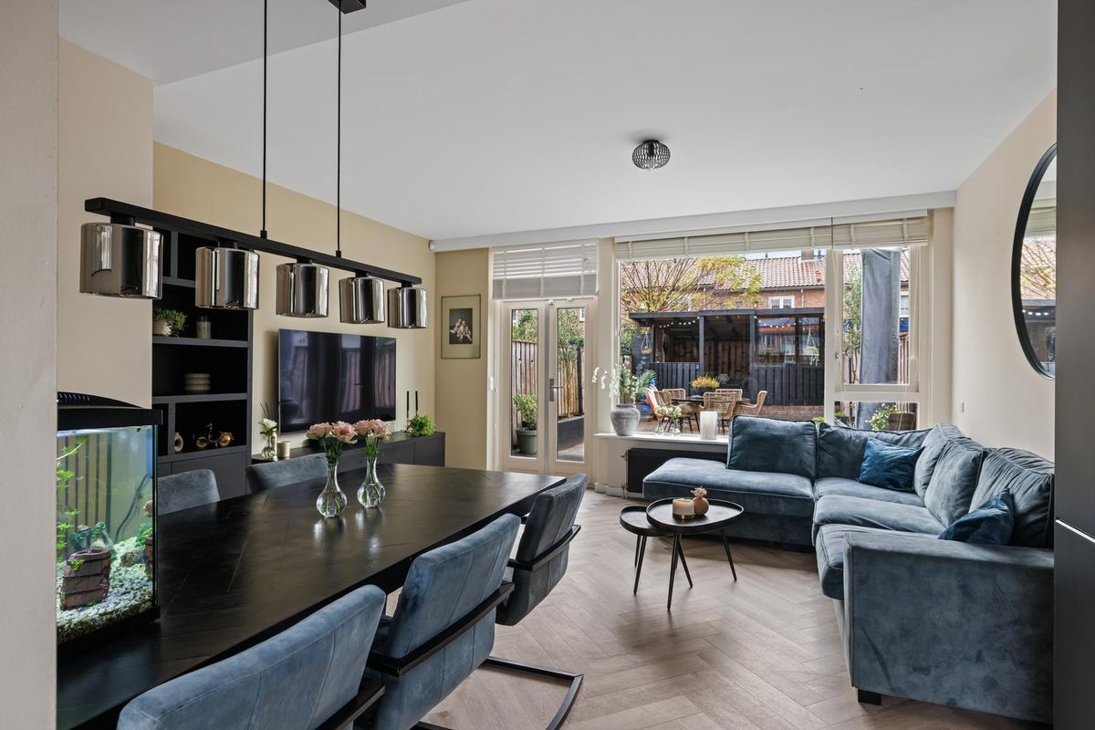 Je komt binnen in de hal waar je toegang vindt tot het toilet en de meterkast. Via een strakke stalen deur stap je de keuken in. De keuken is een praktische L keuken en strak afgewerkt in zwart. Deze moderne keuken uit 2020 is voorzien van diverse inbouwapparatuur zoals een inductiekookplaat met afzuigkap, een koel vriescombinatie, een vaatwasser, een combioven en een Quooker. De keuken ligt aan de voorzijde waardoor je prettig naar buiten kijkt. In het midden van de woning bevindt zich het eetgedeelte. Aan de achterzijde vind je een uitnodigende zithoek waar je heerlijk tot rust komt. De dubbele openslaande deuren zorgen voor veel licht en geven toegang tot de achtertuin. Achter het eetgedeelte vind je een ruime trapkast die ideaal is voor extra opbergmogelijkheden.