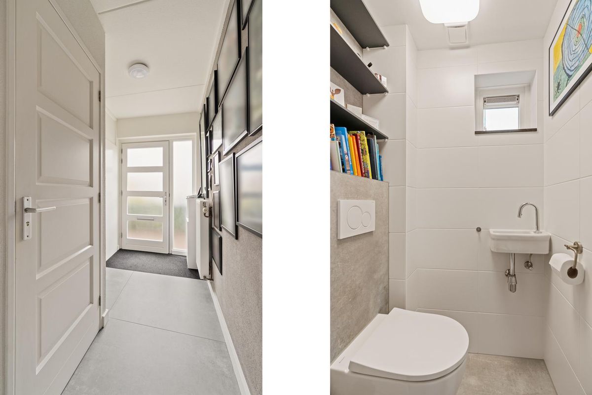 Bij binnenkomst in de woning valt direct de lichte en ruime entree op, die toegang biedt tot de woonkamer met open (vernieuwde) trap. In de hal bevinden zich de moderne toiletruimte en de meterkast.