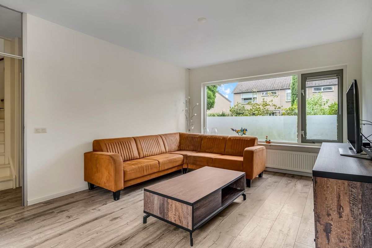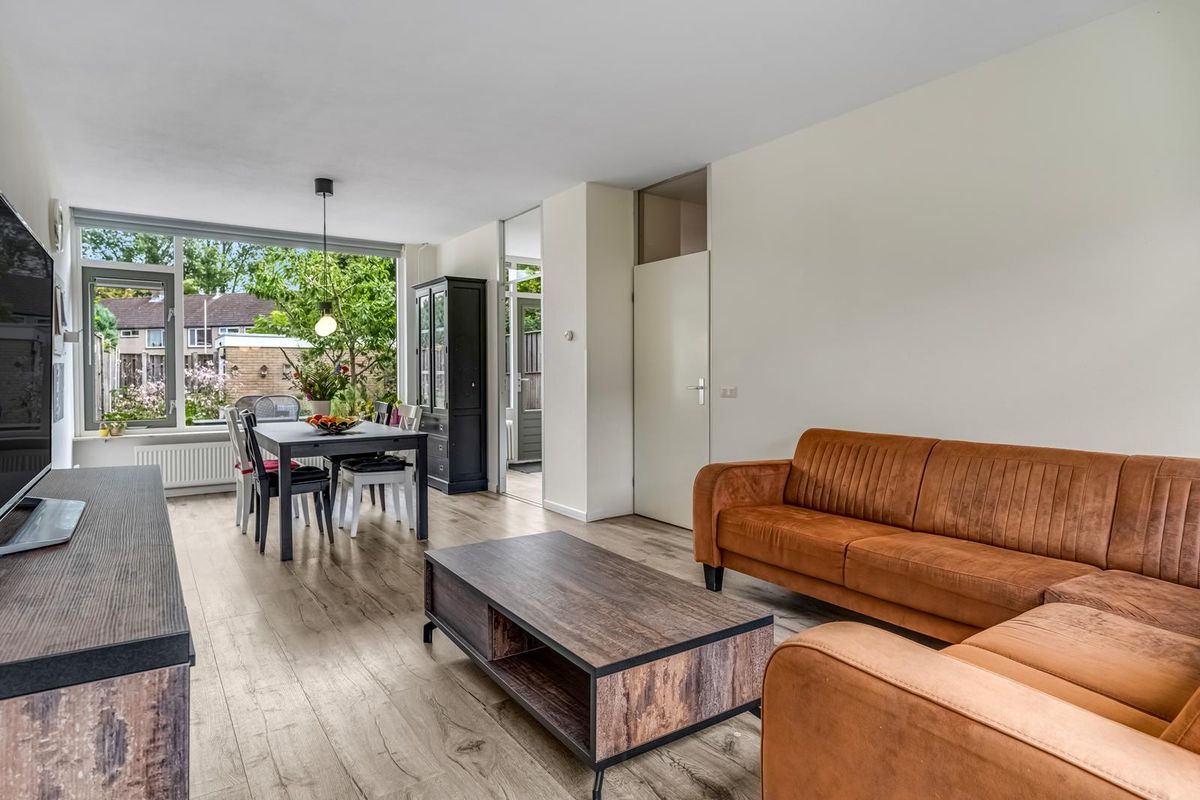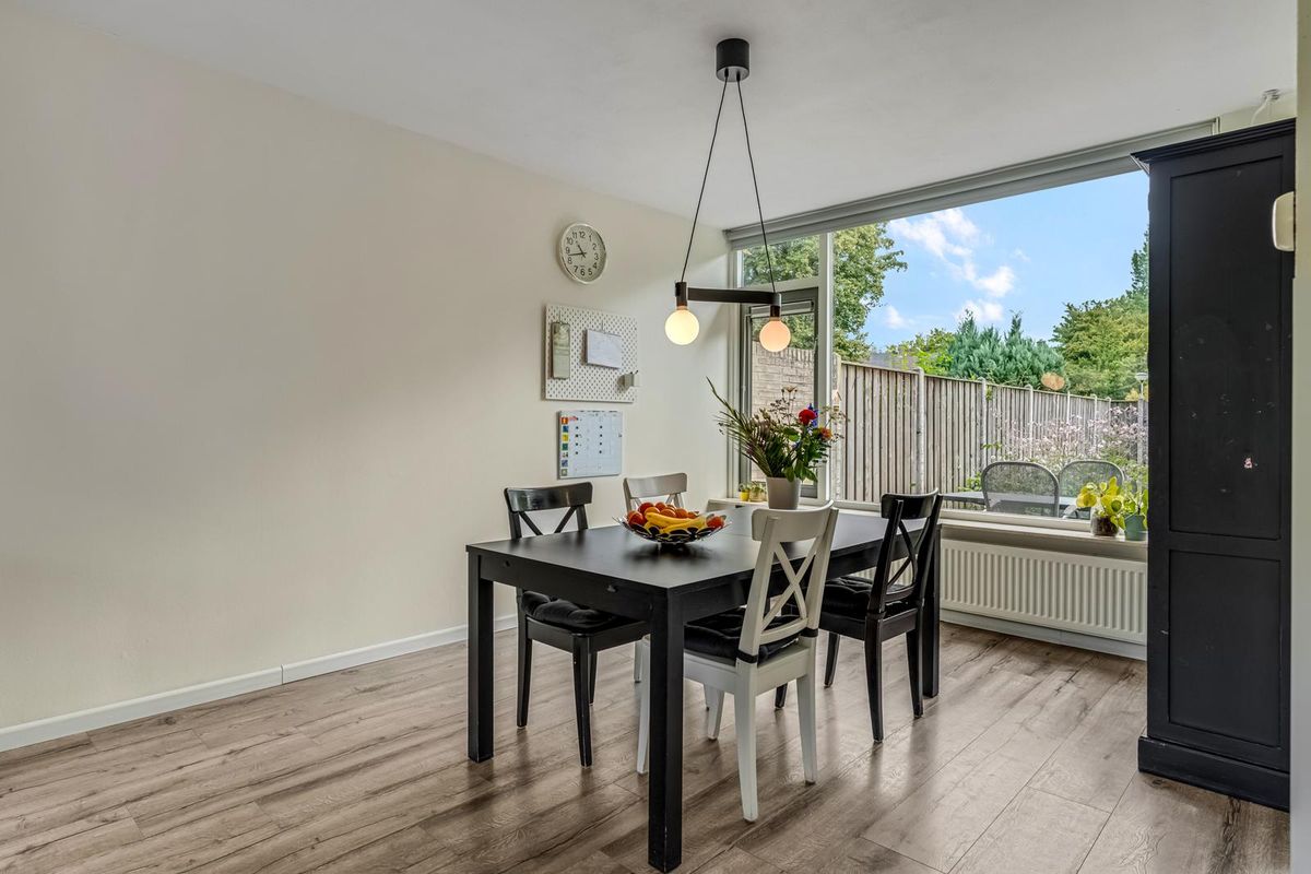De woonkamer is licht en gezellig, met ramen aan de voor- en achterkant. Vanuit de zithoek kijk je leuk de straat in, terwijl de eethoek bij de keuken weer uitzicht biedt op de tuin. Het is zo’n ruimte die meteen vertrouwd aanvoelt, met genoeg mogelijkheden om er je eigen draai aan te geven.