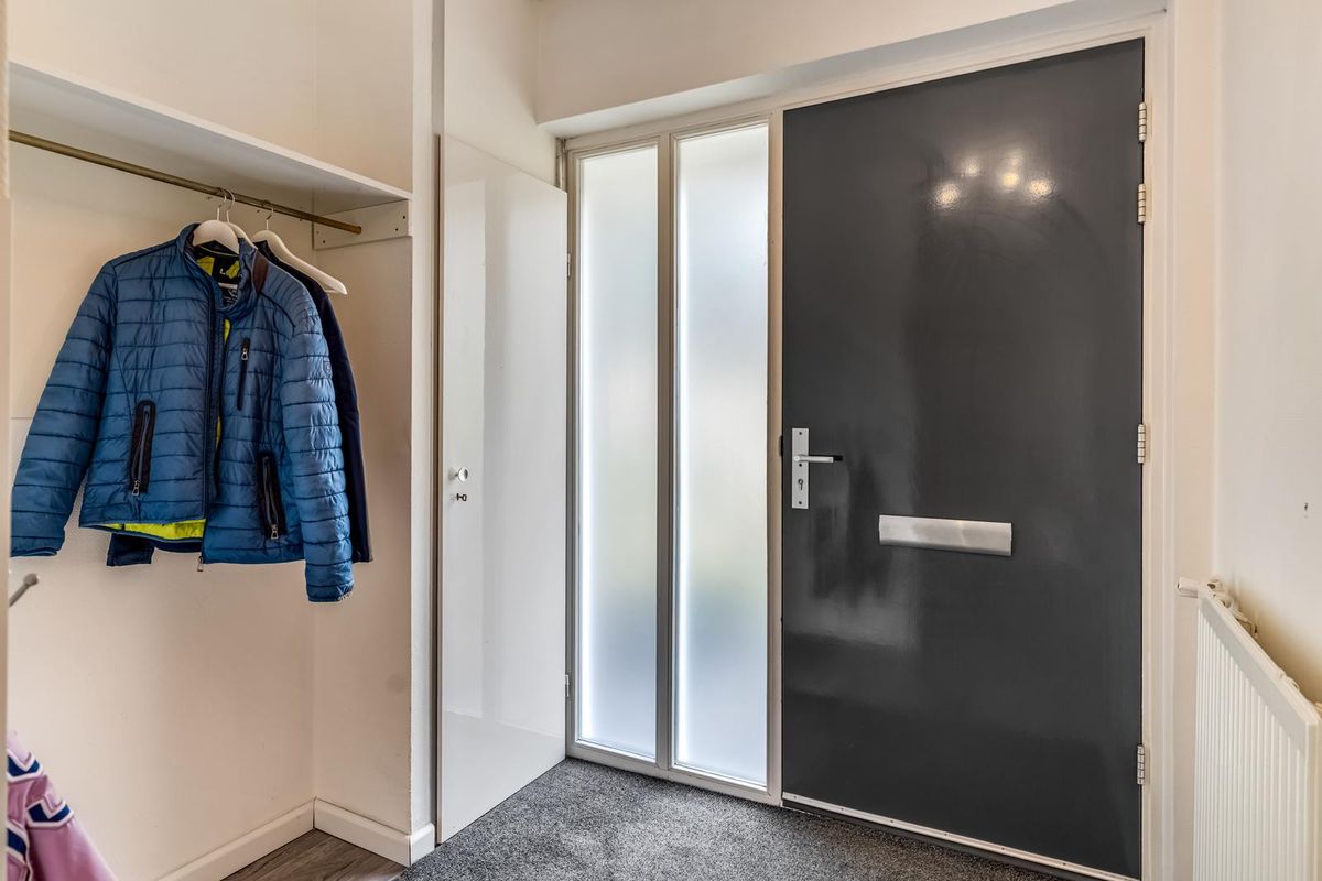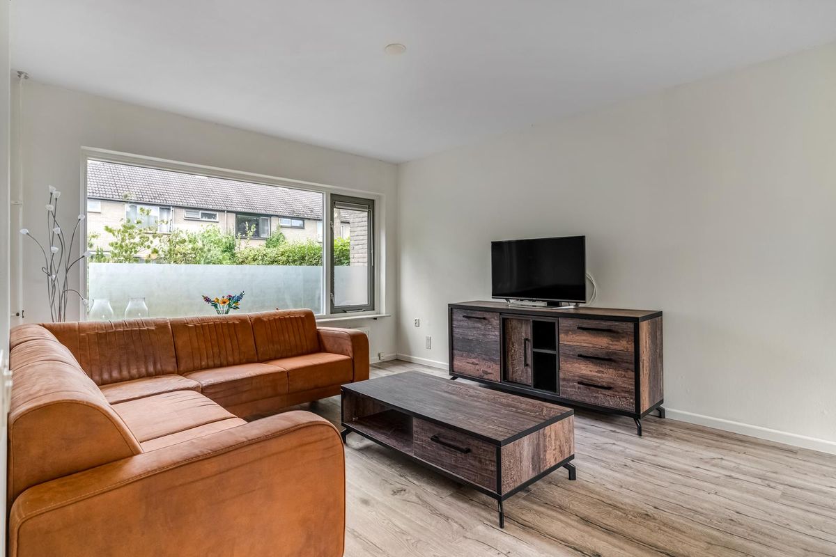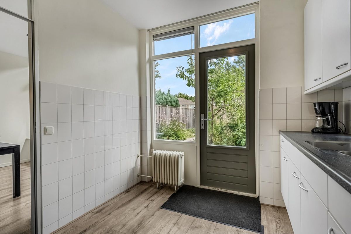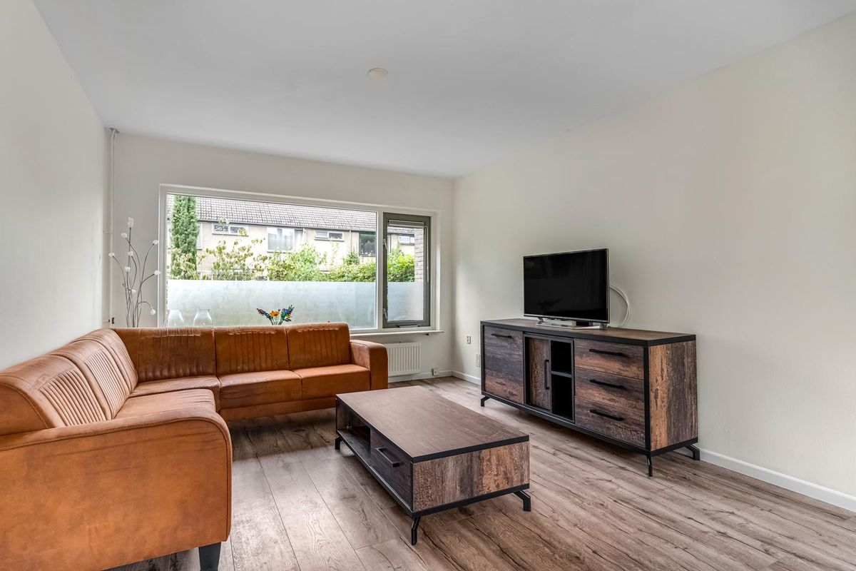 De woonkamer is licht en gezellig, met ramen aan de voor- en achterkant. Vanuit de zithoek kijk je leuk de straat in, terwijl de eethoek bij de keuken weer uitzicht biedt op de tuin. Het is zo’n ruimte die meteen vertrouwd aanvoelt, met genoeg mogelijkheden om er je eigen draai aan te geven.
