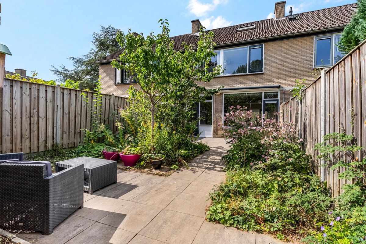 De tuin grenst aan een gezellig pleintje met genoeg parkeerruimte. Je auto staat dus altijd dichtbij, terwijl jij zelf volop privacy hebt. Er is genoeg plek voor een loungebank én een eettafel, perfect voor relaxen of etentjes met vrienden en familie. Fietsen zet je handig in de berging en via de achterom ben je zo weg.