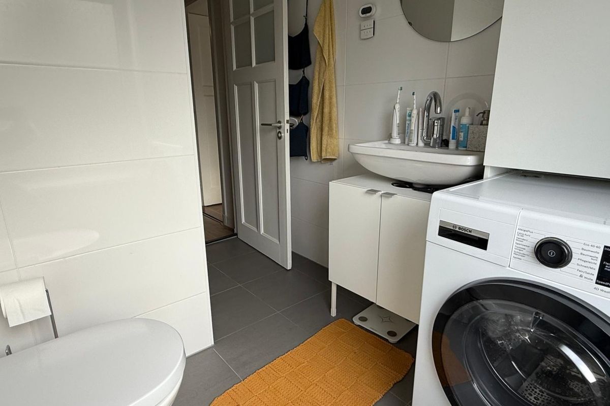 Via de eigen entree op de begane grond bereik je middels een trap de eerste verdieping. De lichte overloop biedt toegang tot alle vertrekken. Aan de achterzijde bevindt zich een royale woonkamer van ca. 29 m² met openslaande deuren naar het zonnige balkon op het zuiden. Aan de voorzijde ligt een compacte slaap- of studeerkamer van ca. 4 m². De moderne keuken is voorzien van diverse inbouwapparatuur, waaronder een gaskookplaat, afzuigkap, oven, koel-/vriescombinatie en vaatwasser. Daarnaast is er een separaat (zwevend) toilet op deze verdieping.