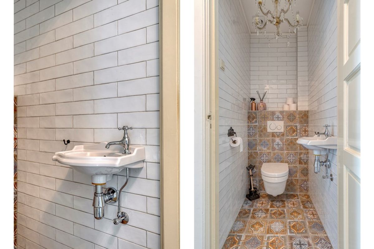 De smaakvolle badkamer is een echte blikvanger, met fraaie tegels, een ruime inloopdouche en een elegant wastafelmeubel – een plek waar sfeer en comfort samenkomen.