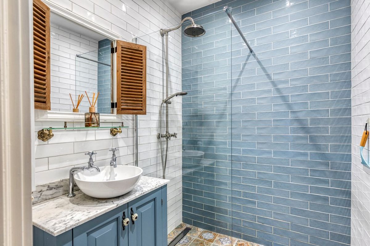 The elegant bathroom is a true eye-catcher, featuring beautiful tiles, a generous walk-in shower, and a refined vanity unit — a space where style meets comfort.