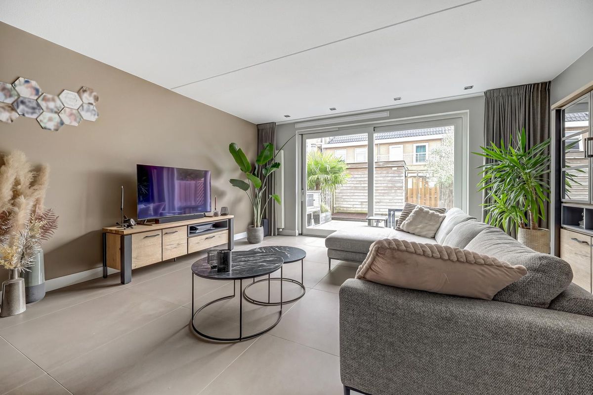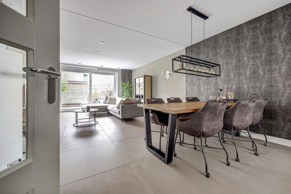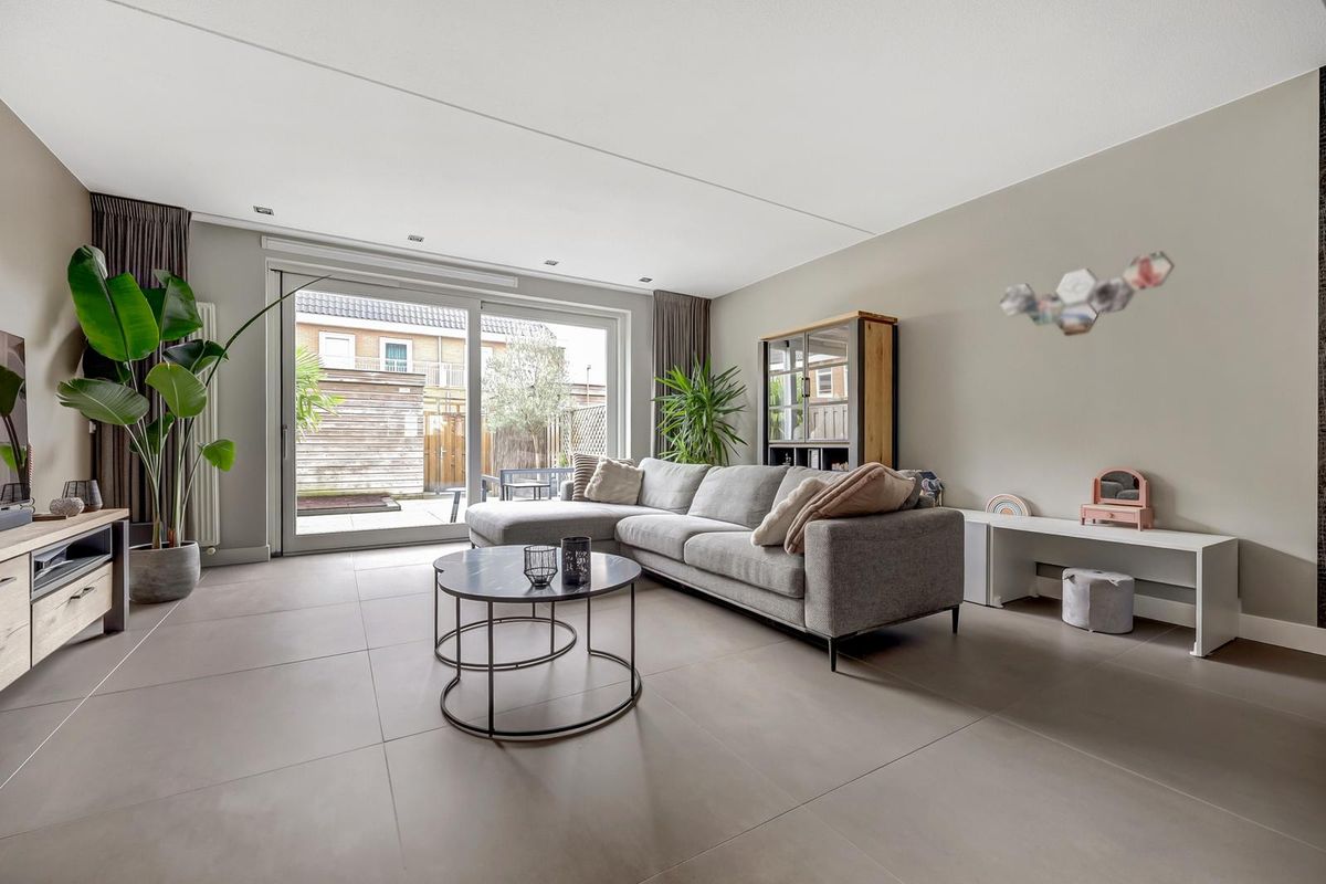De schuifpui in de woonkamer geeft direct toegang tot de zonnige achtertuin, waar je volop kunt genieten van lange zomeravonden en gezellige momenten met familie en vrienden. De tuin heeft een vrijstaande houten berging en een achterom. Op warme dagen biedt het elektrische zonnescherm een fijne schaduwplek.