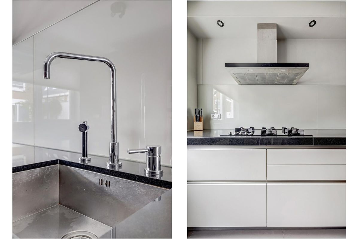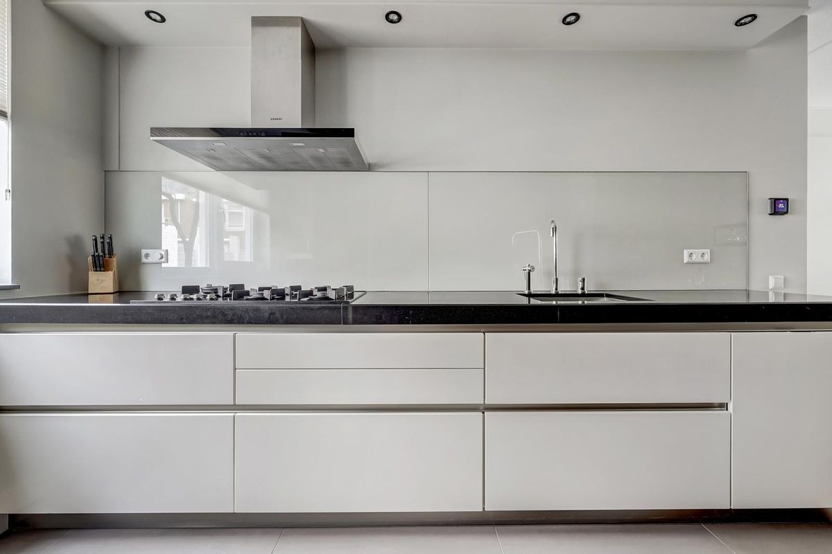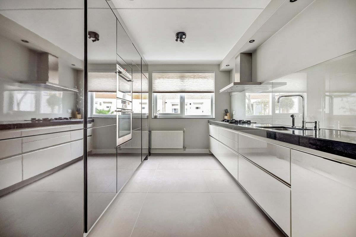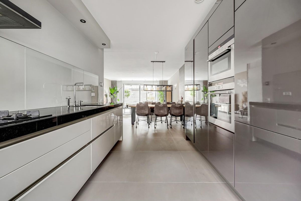 De open keuken, gelegen aan de voorzijde, is modern en praktisch ingericht en van alle gemakken voorzien: een 5-pits gaskookplaat, een afzuigkap, een vaatwasser, een combi-magnetron, een oven en een royale koel-/vriescombinatie.
