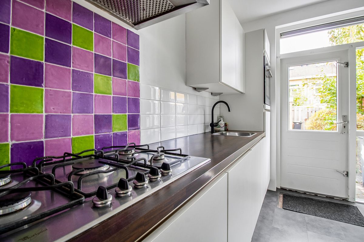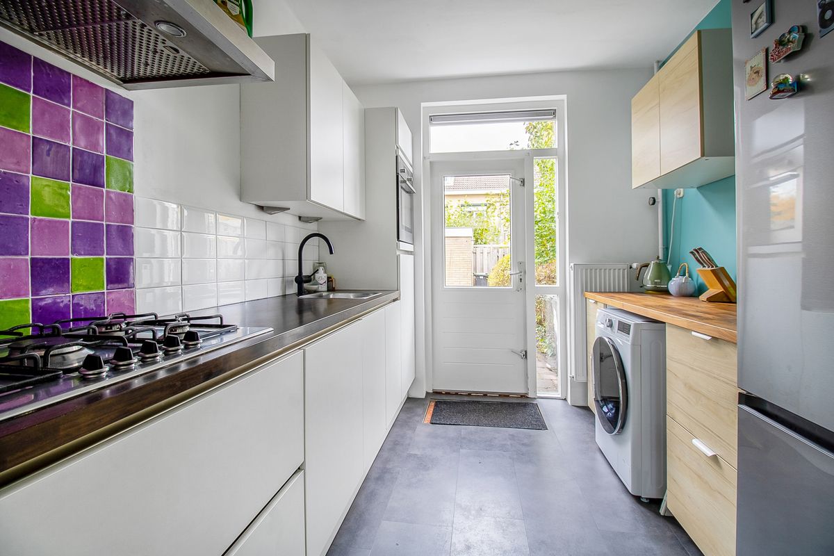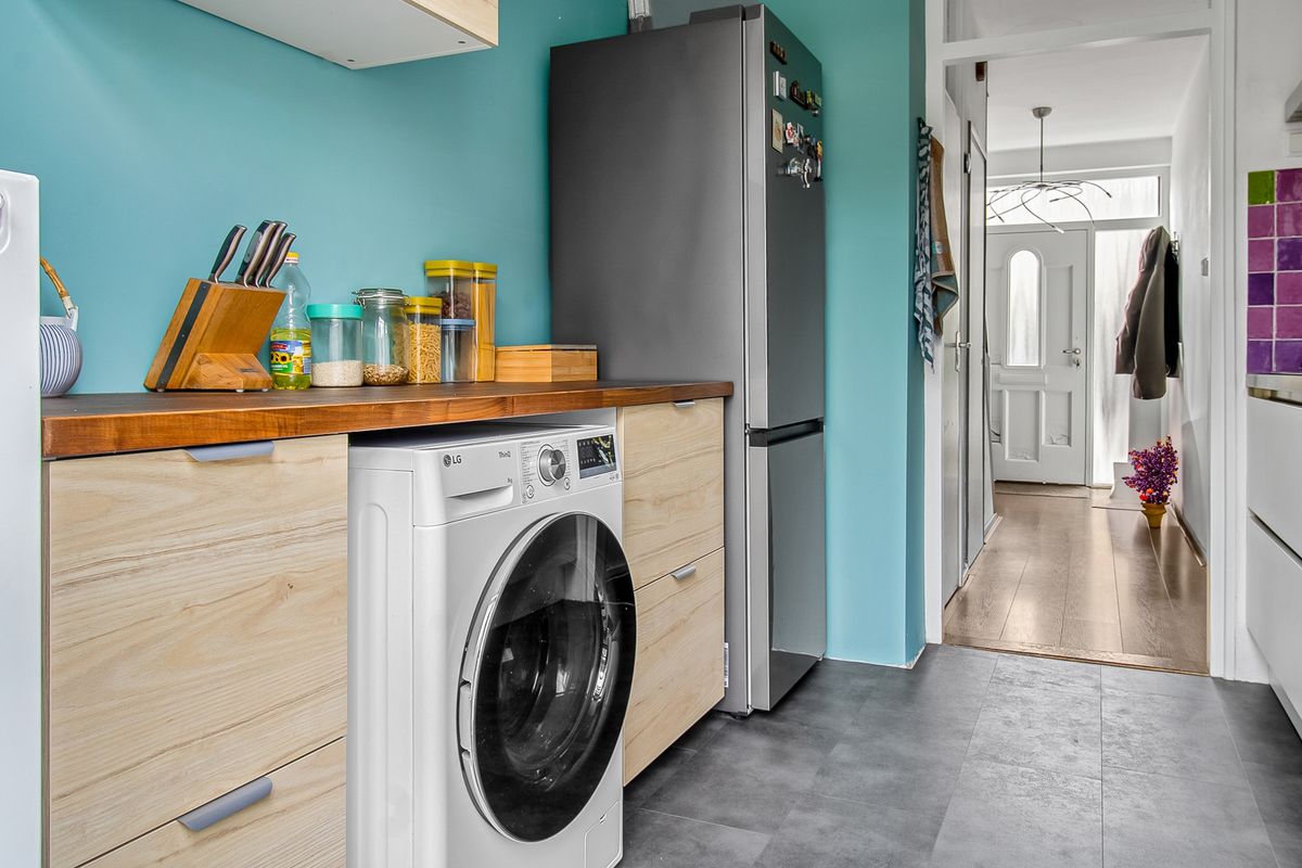 Entree woning: ruim entree met toegang tot nieuwe meterkast, trapkast, toilet met fonteintje en toegang tot de ruime en lichte woonkamer; bij binnenkomst vallen direct de grote ramen; heerlijk al dat licht! Op de vloer ligt laminaat. De keuken is aan de achterzijde van de woning gelegen en beschikt over een 5 pits gaskookplaat, vaatwasser (2023), koelkast en een oven. Hier treft u ook de aansluiting van de wasmachine aan.