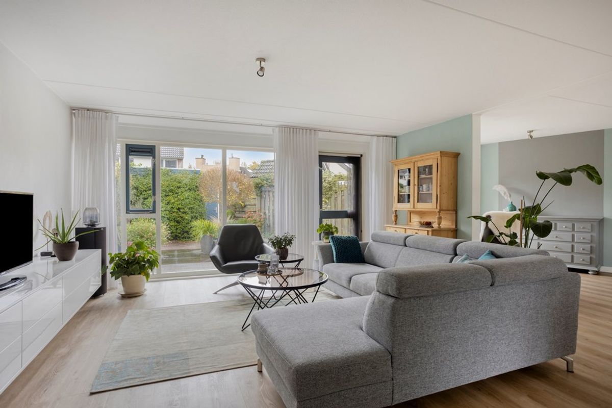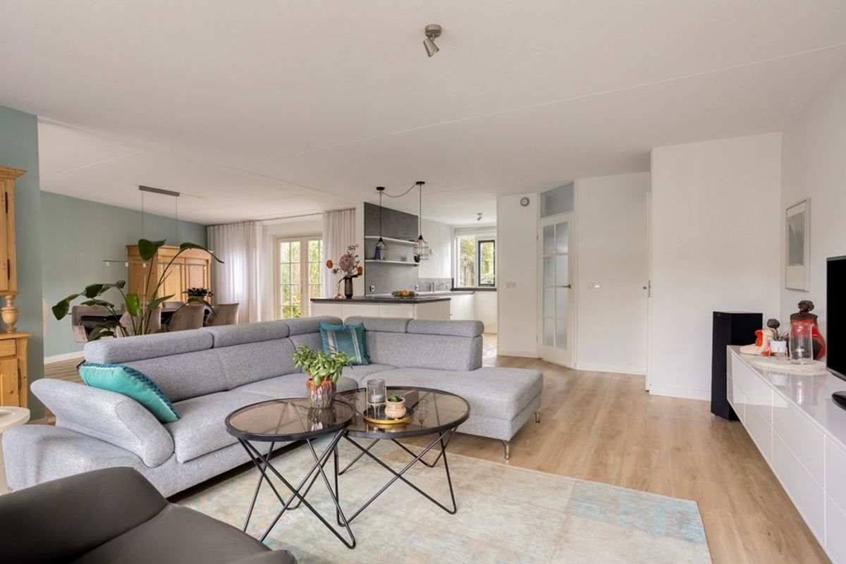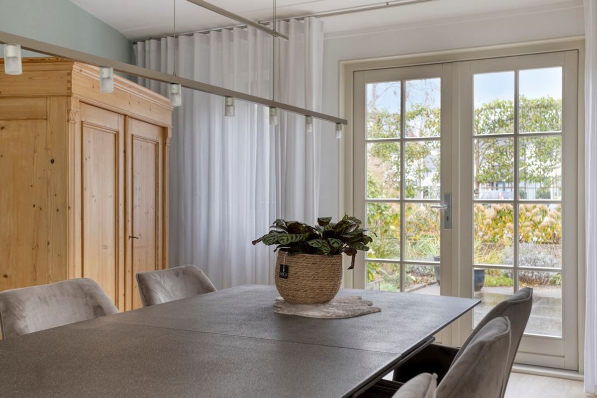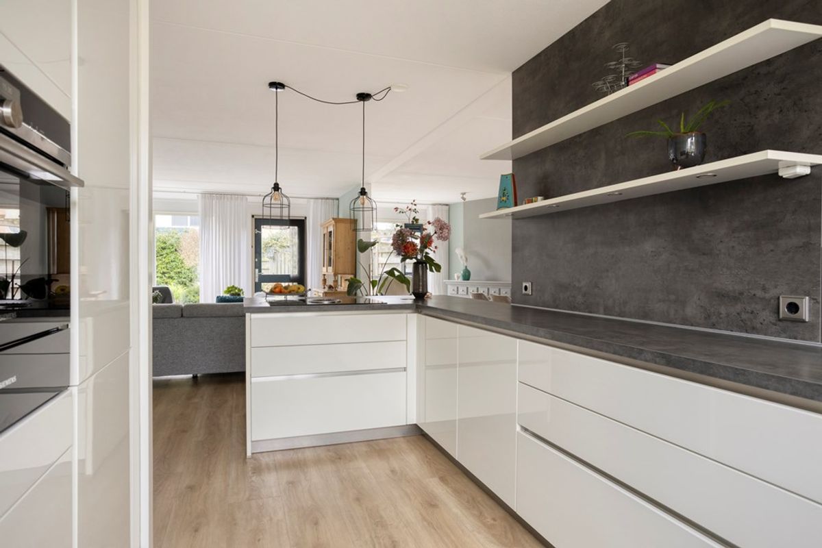 Bij binnenkomst valt direct de brede woonkamer op, waar de grote raampartijen zorgen voor een overvloed aan daglicht en een prettig uitzicht op zowel de voor- als de achtertuin. De woonkamer biedt volop ruimte voor een gezellige zithoek en een grote eettafel. De centraal gelegen keuken vormt het hart van de woning en is uitgerust met diverse inbouwapparatuur. Dankzij de open verbinding met de woonkamer ontstaat een sfeervol geheel waarin koken, eten en samenzijn naadloos in elkaar overlopen.