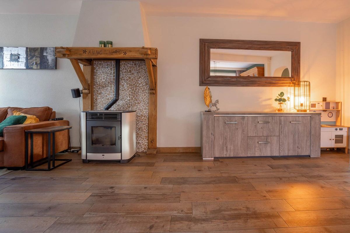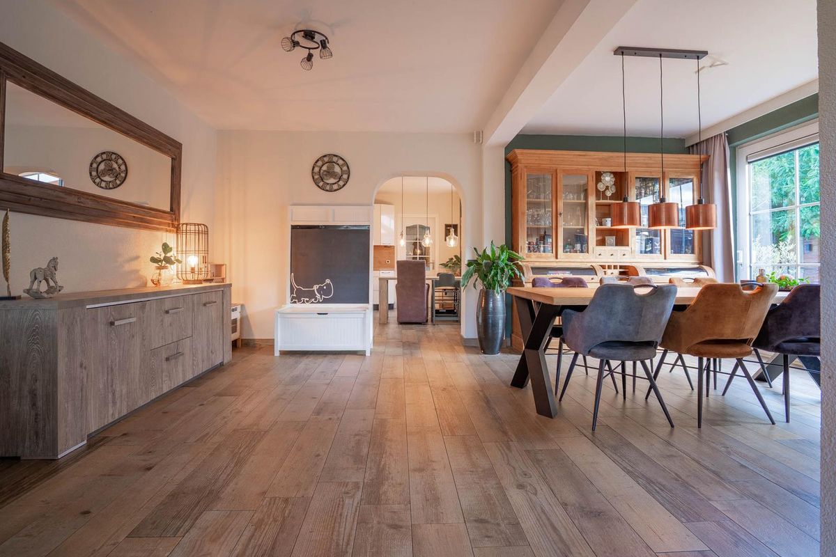 De woonkamer is een heerlijke plek om te ontspannen: houten vloer, gestuukte wanden en plafond, een royale raampartij voor veel lichtinval, airco en een gezellige palletkachel. Aansluitend vindt u de eetruimte, eveneens met veel licht en ruimte – ideaal voor lange avonden met familie of vrienden.