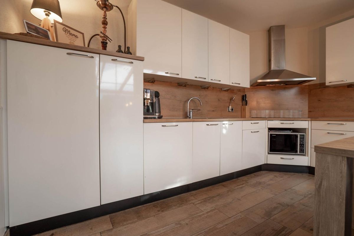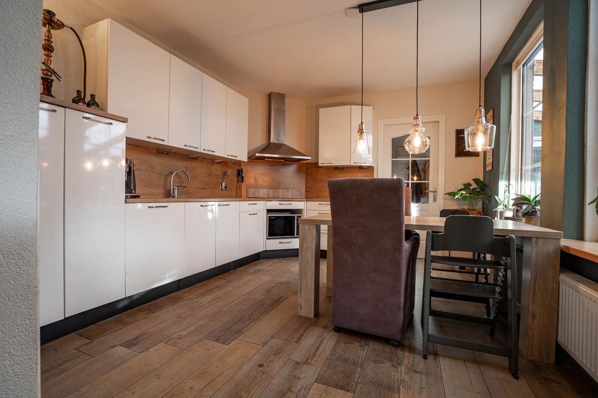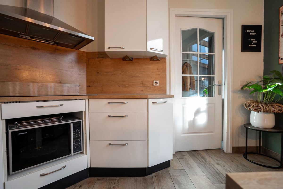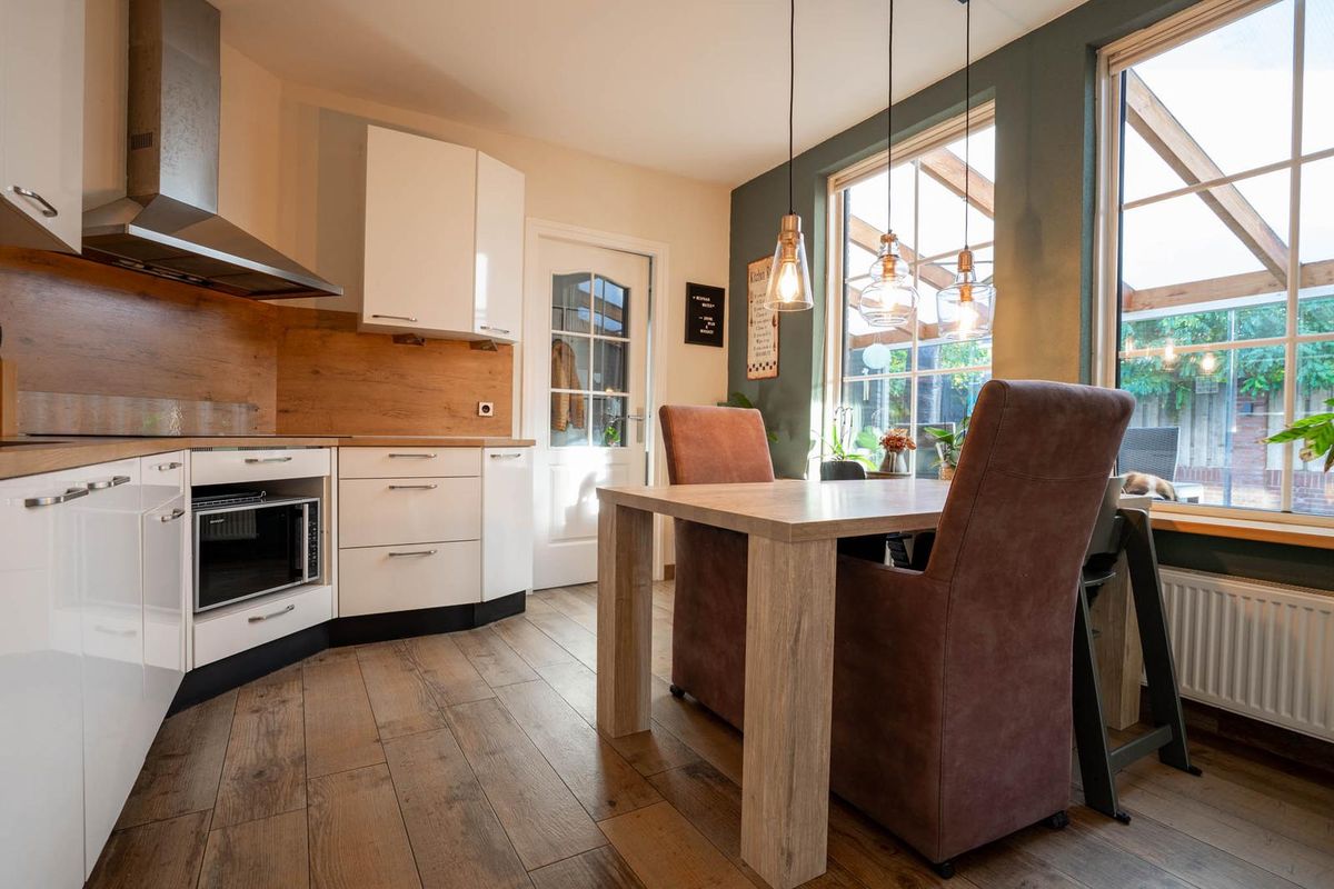 De keuken is strak en modern uitgevoerd in wit, voorzien van inductiekookplaat, vaatwasser, koelkast en oven. Vanuit de keuken heeft u toegang tot de praktische bijkeuken met witgoedaansluiting en doorgang naar de serre en berging.