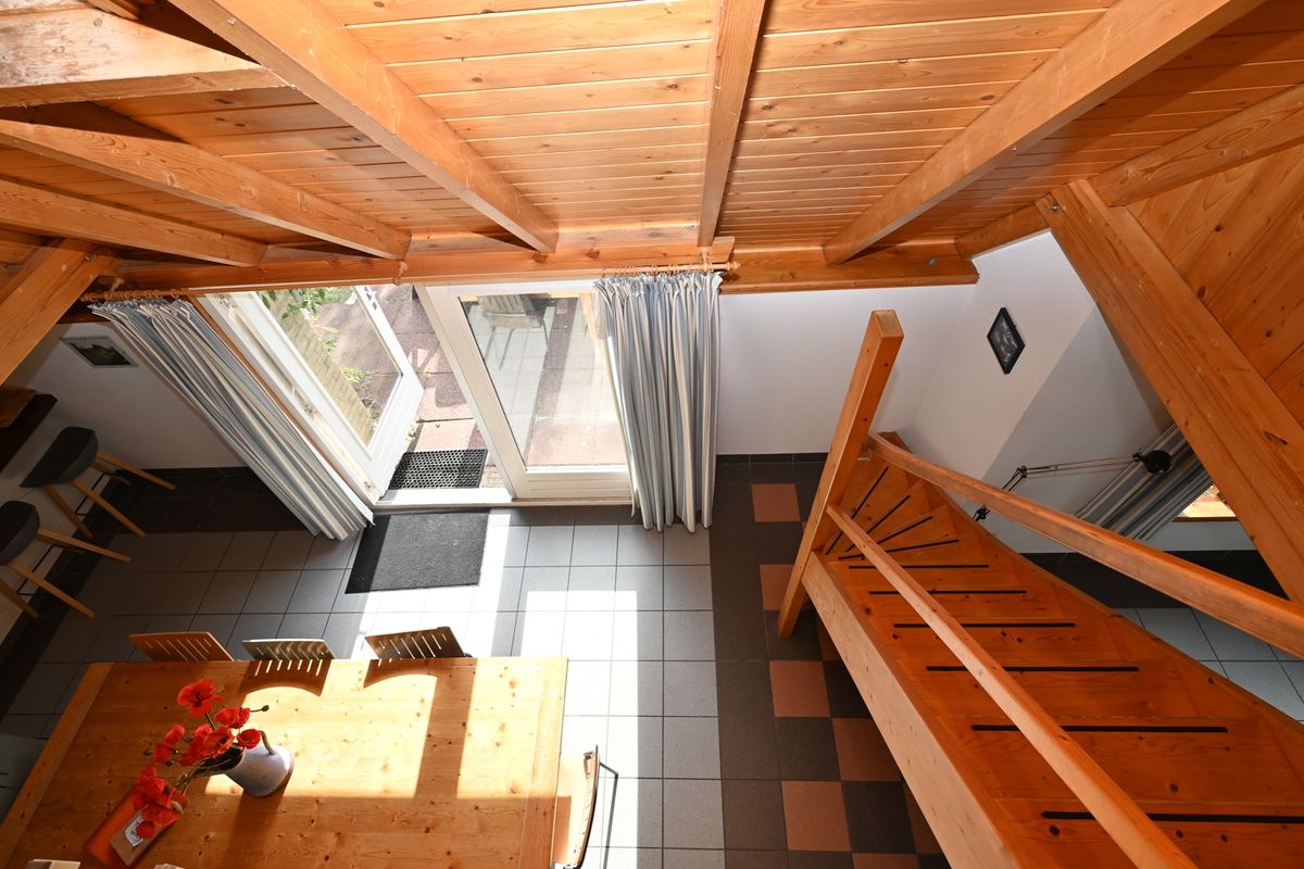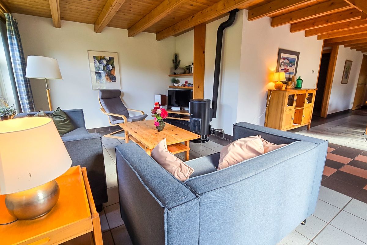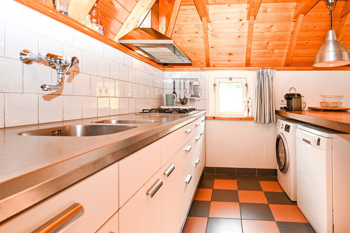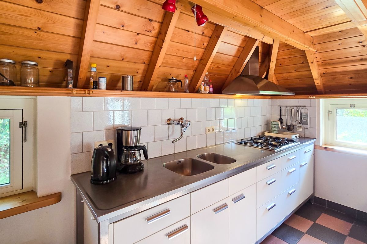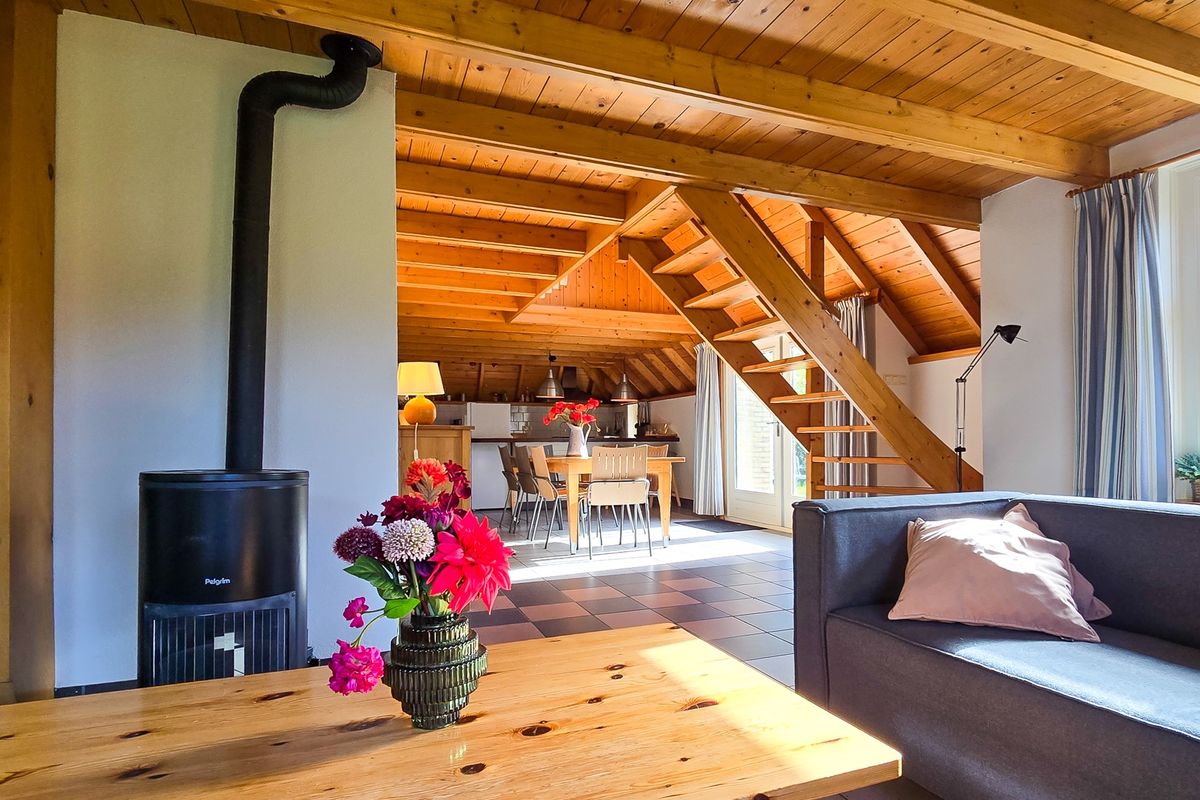 De sfeervolle woonkamer loopt over in de open keuken met eethoek, waar het gezellig samenkomen en tafelen is. Op de begane grond bevinden zich tevens een slaapkamer en een badkamer met douche, wastafel en toilet.