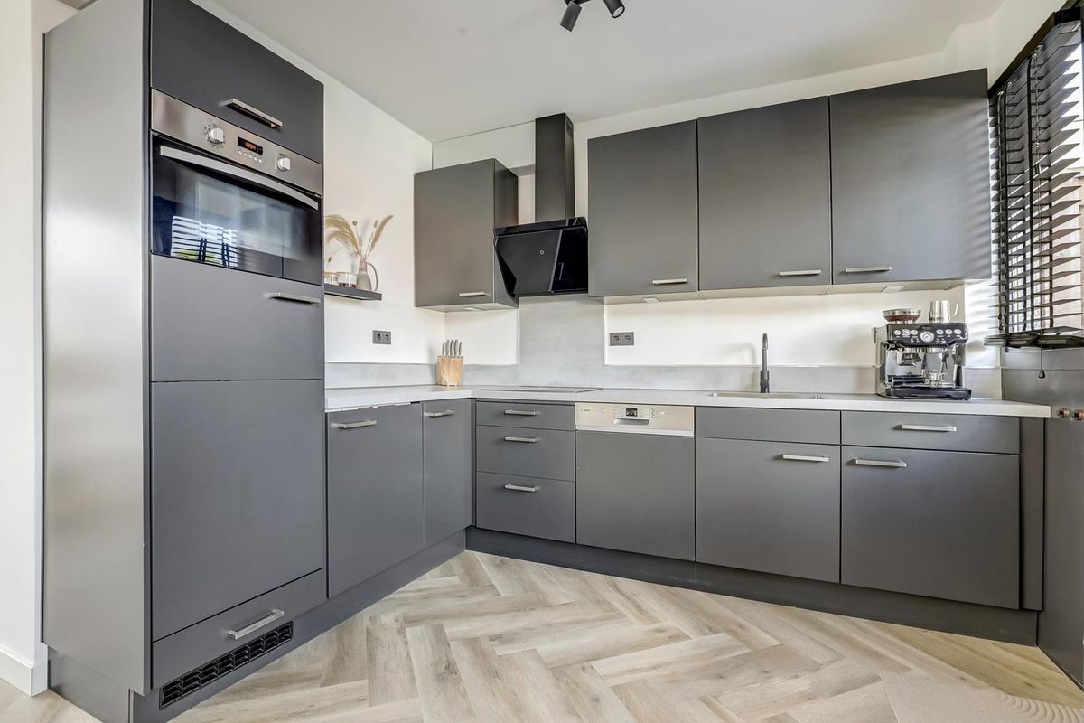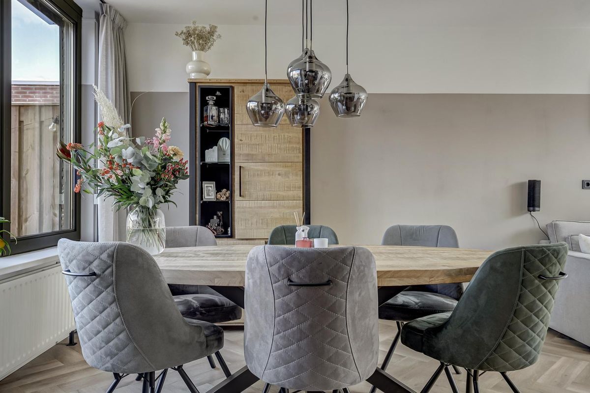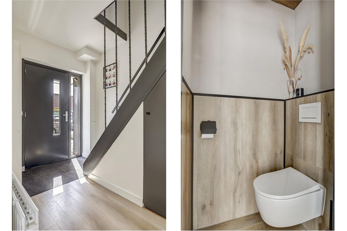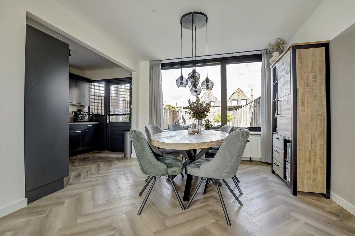 Via de voortuin bereikt u de entree van de woning. De hal geeft toegang tot het toilet, trapopgang en de woonkamer. De woonkamer is ruim opgezet, voorzien van vloerverwarming en afgewerkt met een mooie visgraat PVC-vloer in houtlook. Het grote raam aan de voorzijde zorgt voor veel lichtinval en geeft een prettig uitzicht op de straat. De wanden zijn strak afgewerkt in neutrale tinten, waardoor de ruimte een moderne en rustige uitstraling heeft. Aan de achterzijde bevindt zich de eetkamer met aansluitend de open keuken. Deze keuken is uitgevoerd in een moderne stijl met donkergrijze kasten, een licht werkblad en RVS-accenten. De keuken is voorzien van diverse inbouwapparatuur, waaronder een oven, inductiekookplaat, afzuigkap, vaatwasser en koelkast. Vanuit de keuken heeft u toegang tot de achtertuin. Elektrisch bedienbare rolluiken en houten kozijnen en deuren (geplaatst in 2021) maken het geheel compleet.