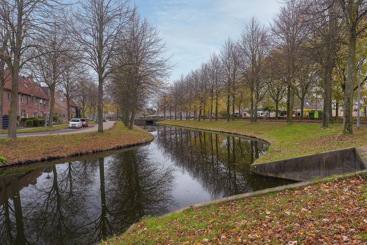 Aan de voorzijde kijk je uit over het water, een rustige groene strook die elke dag opnieuw een moment van ontspanning biedt.
