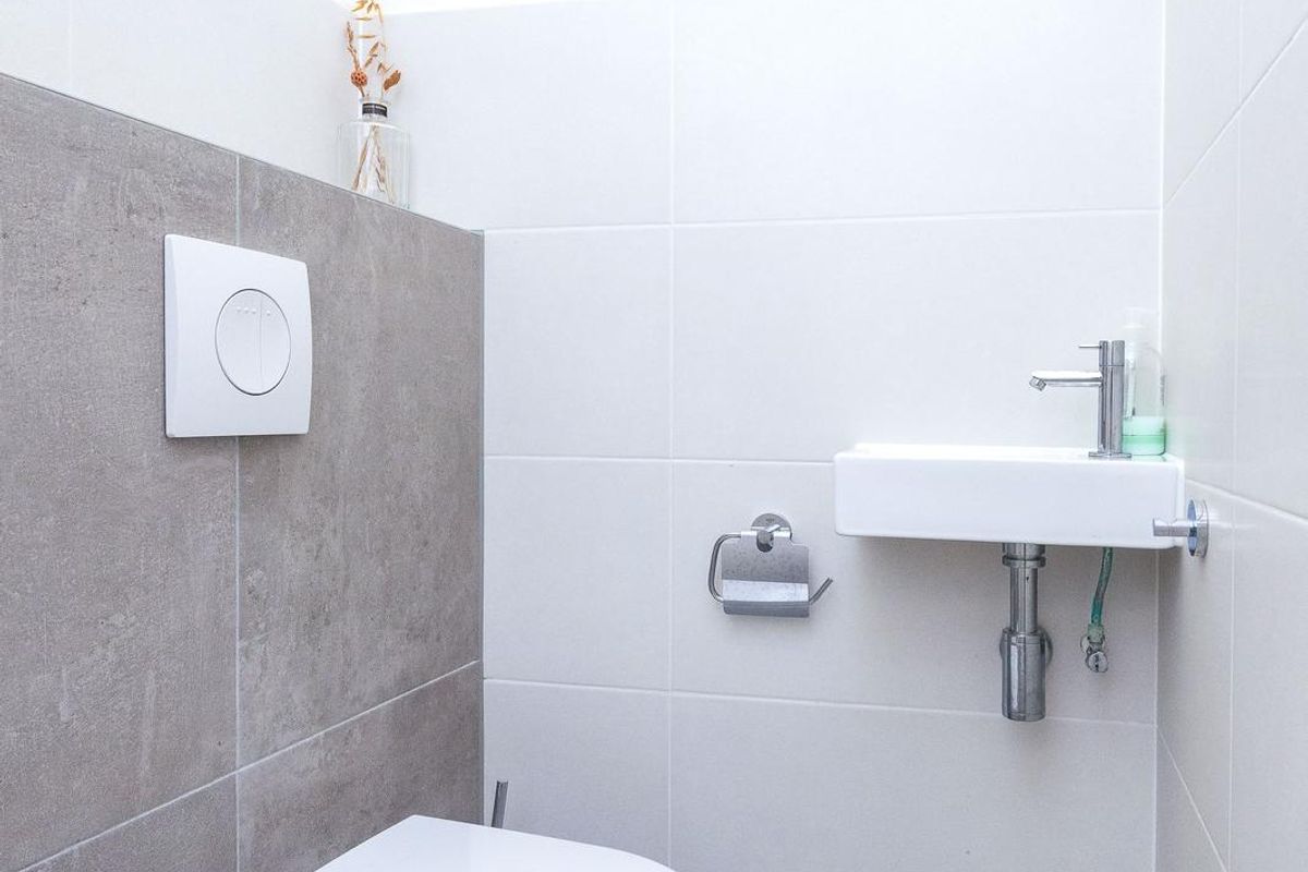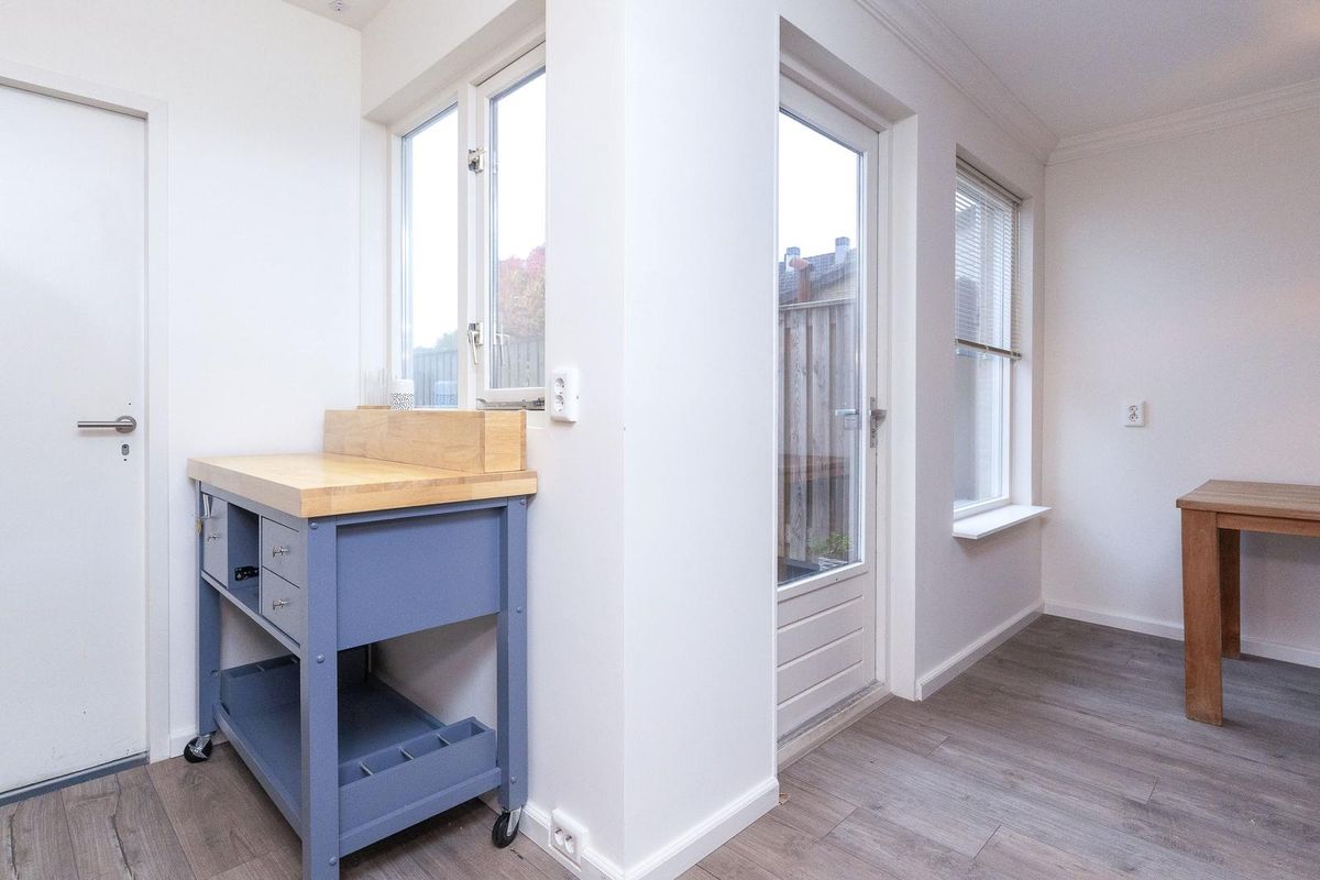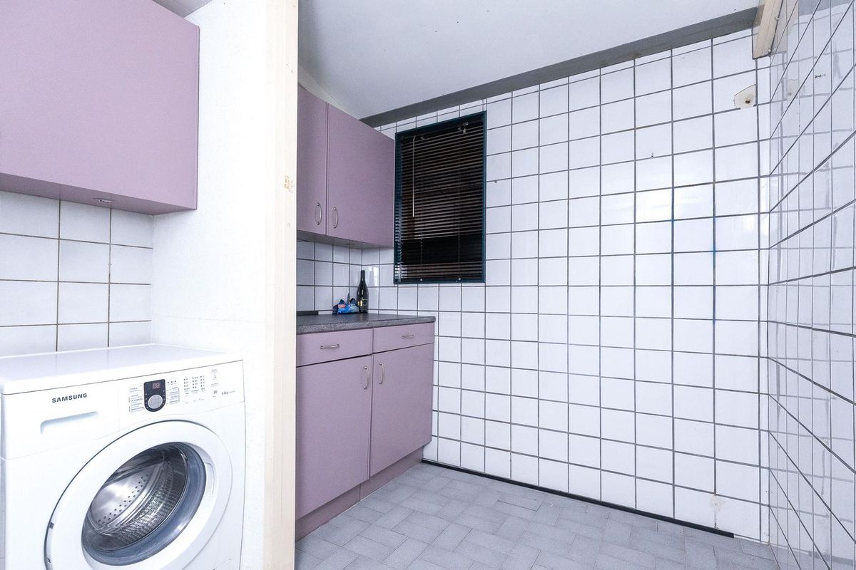 Achter de keuken ligt de betegelde bijkeuken: ideaal voor wasmachine, droger en extra opslag.