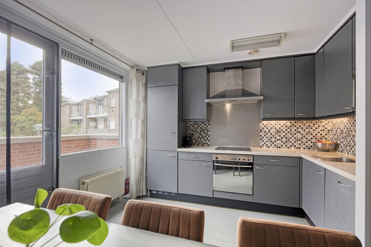 De eerste verdieping vormt het hart van de woning. Hier vind je een sfeervolle en ruime woonkamer, afgewerkt met een mooie vloer en neutrale kleuren. Dankzij de slimme indeling is er plek voor een royale zithoek én een grote eettafel, ideaal voor gezellige etentjes of lange avonden met vrienden en familie. Aangrenzend vind je de moderne keuken. Deze is praktisch ingericht en uitgevoerd in tijdloos grijs met voldoende werk- en kastruimte. De keuken is voorzien van een koelkast, oven, vaatwasser en vriezer, alles wat je nodig hebt voor een fijne kookervaring. Bonus: via de keuken stap je zó het balkon op. Een heerlijke plek om ’s ochtends rustig je koffie te drinken of even wat frisse lucht te pakken tijdens het koken.