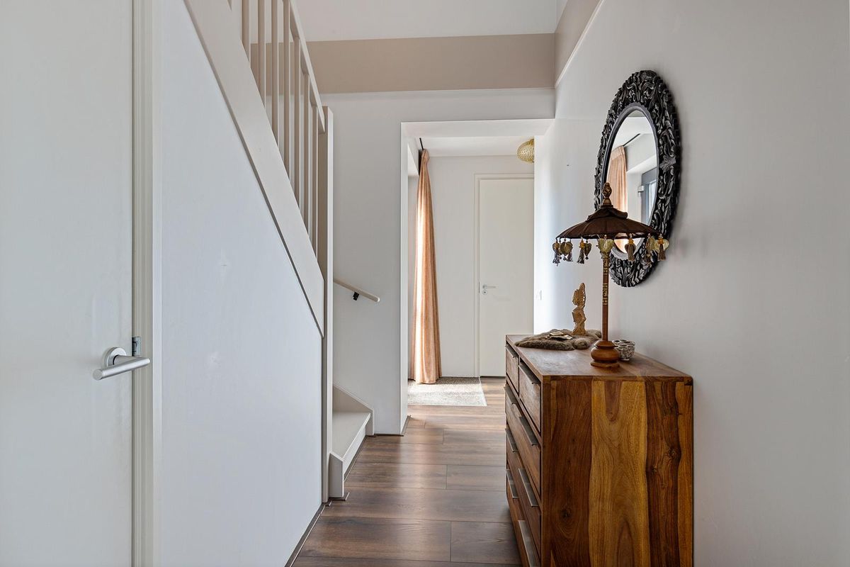 Via de ruime entree bereikt u de hal met stijlvol extra royaal gastentoilet, trapopgang met vide en toegang tot zowel de bijkeuken als de living.