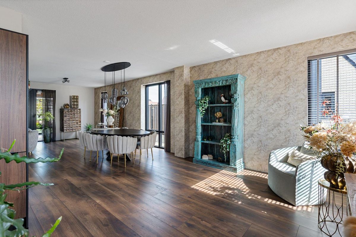 De bijkeuken herbergt de warmtepompinstallatie met 190 liter boiler, aansluitingen voor wasapparatuur en een waterontharder. De fluisterstille luchtwarmtepomp is zorgvuldig buiten de woning geplaatst.De gehele begane grond is voorzien van een stijlvolle laminaat-vloer en wordt verwarmd en gekoeld middels vloerverwarming.