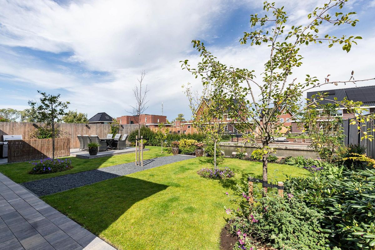Het royale perceel is met veel zorg en smaak professioneel ingericht. Rondom de woning ligt een fraai aangelegde tuin met volwassen beplanting, sfeervolle terrassen en een brede oprit voor twee auto’s. Via de afsluitbare poort bereikt u de achtertuin en het water.