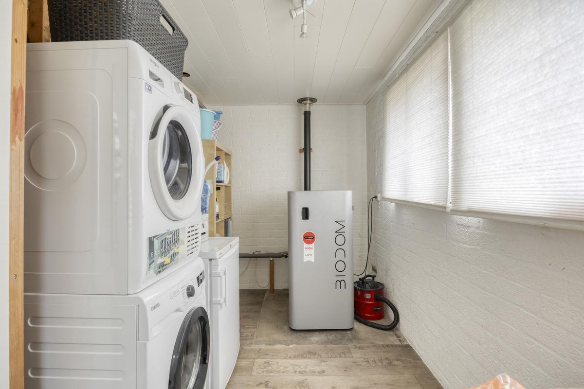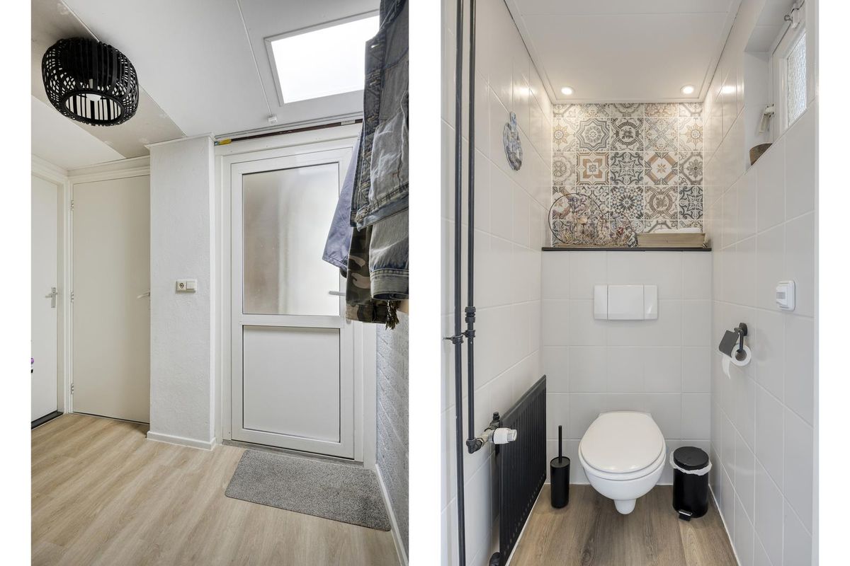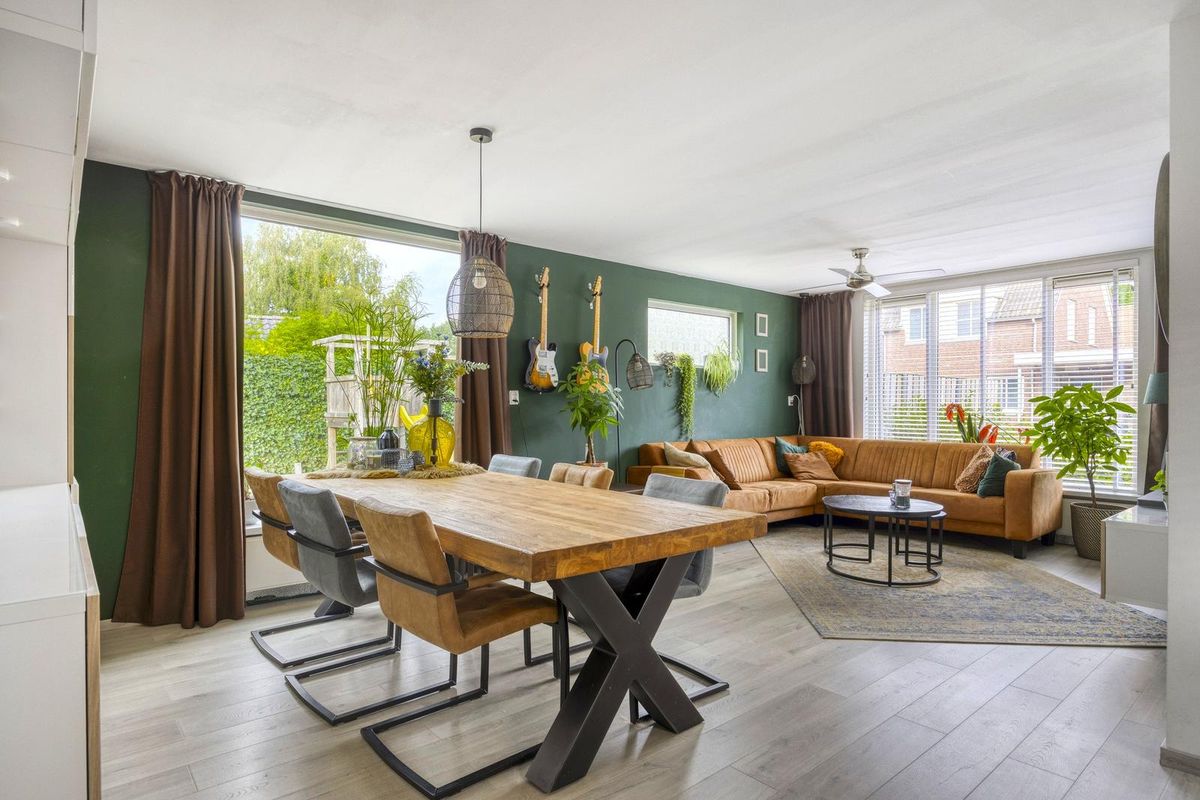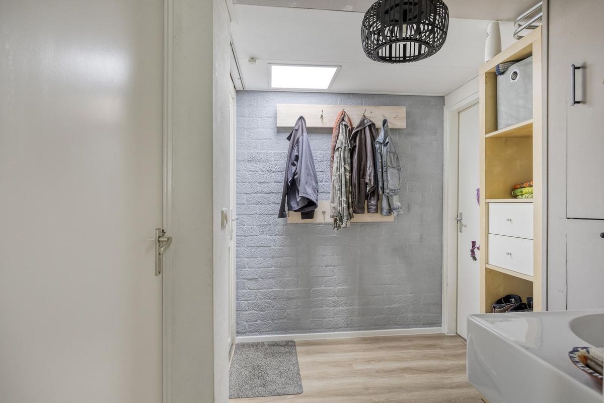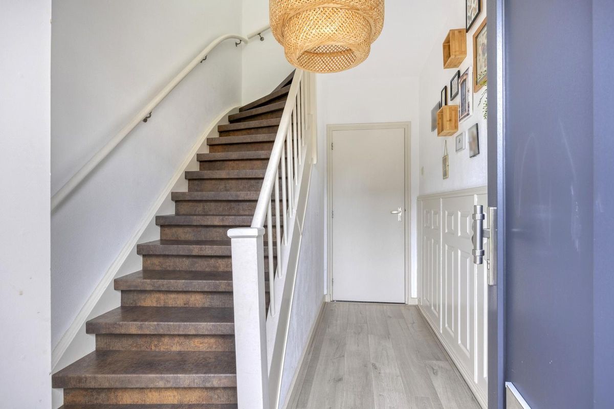 De hal, met trapopgang naar de eerste verdieping, geeft direct toegang tot de woonkamer. De ruime L-vormige woonkamer is licht en sfeervol en vormt samen met de woonkeuken het hart van de woning. De woonkeuken grenst aan de woonkamer, heeft een hoekopstelling en is voorzien van een loopdeur naar de tuin. Vanuit de keuken is er toegang tot het tweede portaal, dat beschikt over een toilet en toegang biedt tot de masterbedroom. De masterbedroom is voorzien van een schuifpui aan de voorzijde en geeft toegang tot de berging, waar zich de witgoedaansluitingen bevinden. Vanuit hier is er ook een loopdeur naar de tuin.