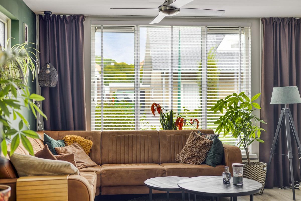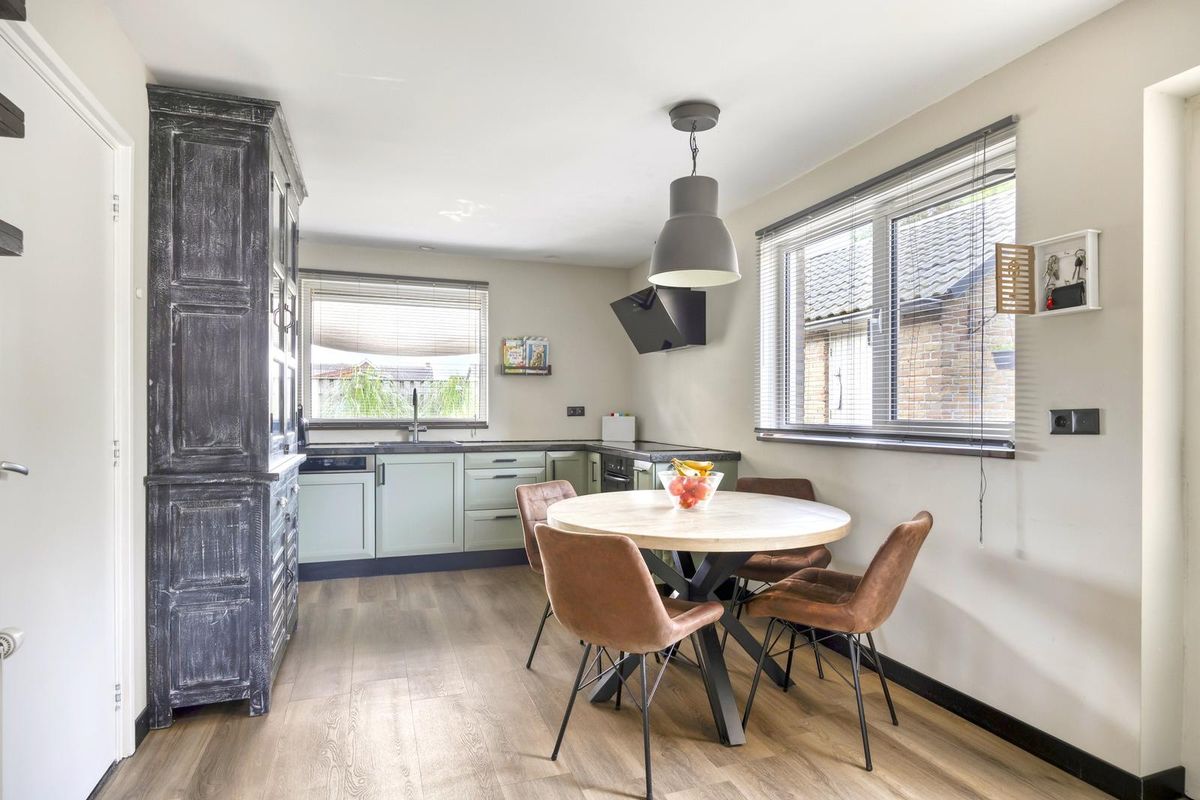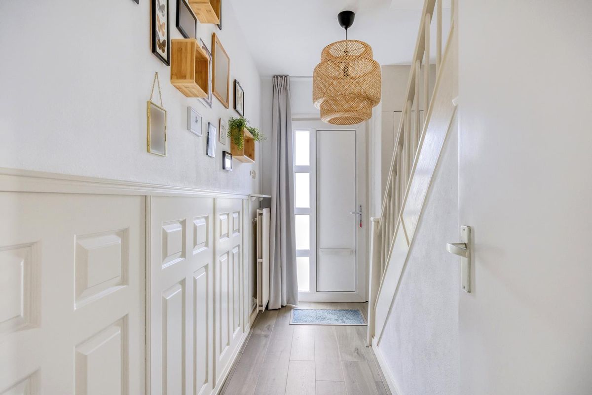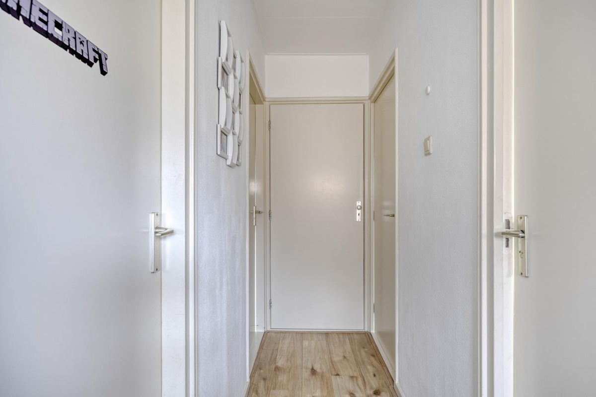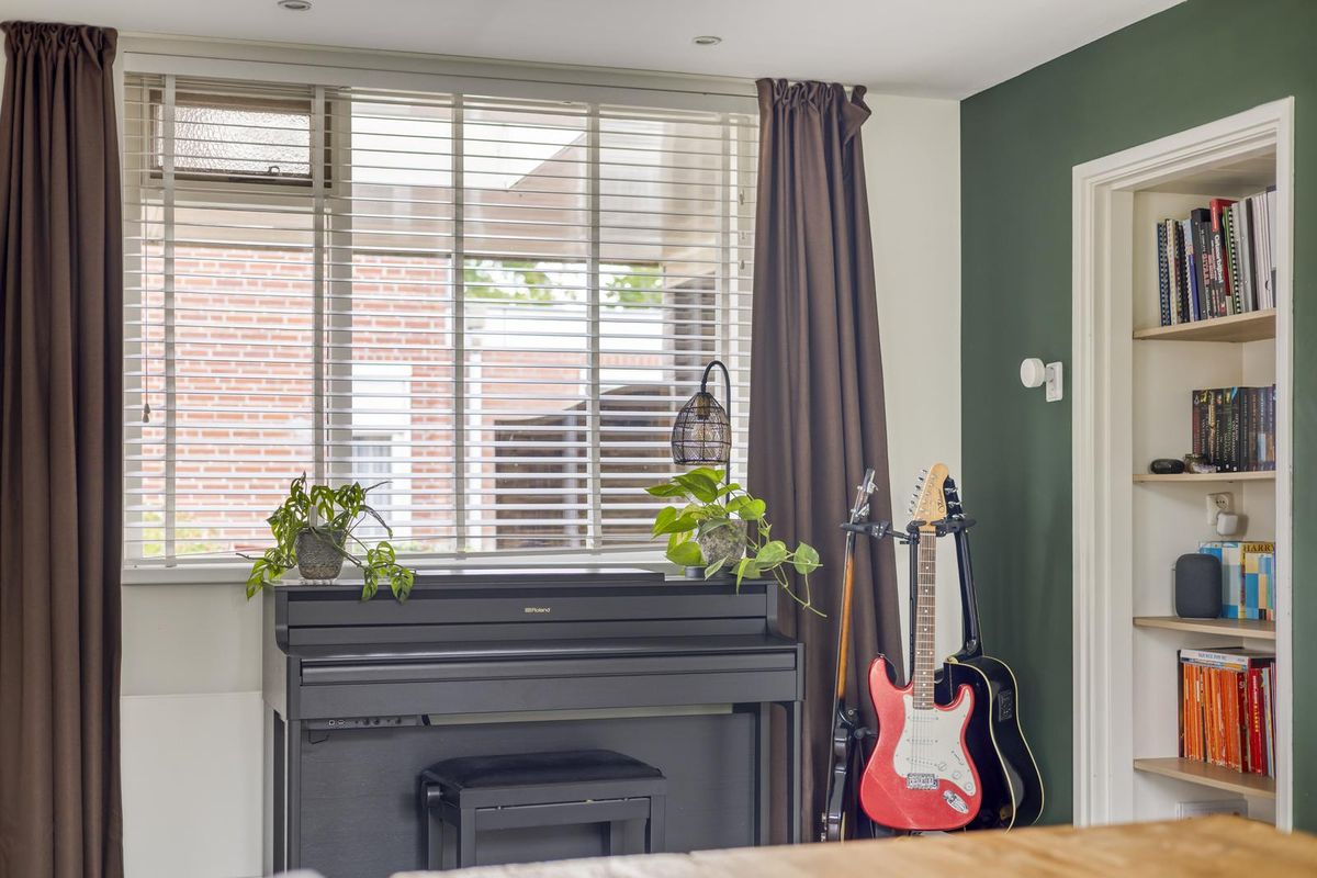 De hal, met trapopgang naar de eerste verdieping, geeft direct toegang tot de woonkamer. De ruime L-vormige woonkamer is licht en sfeervol en vormt samen met de woonkeuken het hart van de woning. De woonkeuken grenst aan de woonkamer, heeft een hoekopstelling en is voorzien van een loopdeur naar de tuin. Vanuit de keuken is er toegang tot het tweede portaal, dat beschikt over een toilet en toegang biedt tot de masterbedroom. De masterbedroom is voorzien van een schuifpui aan de voorzijde en geeft toegang tot de berging, waar zich de witgoedaansluitingen bevinden. Vanuit hier is er ook een loopdeur naar de tuin.