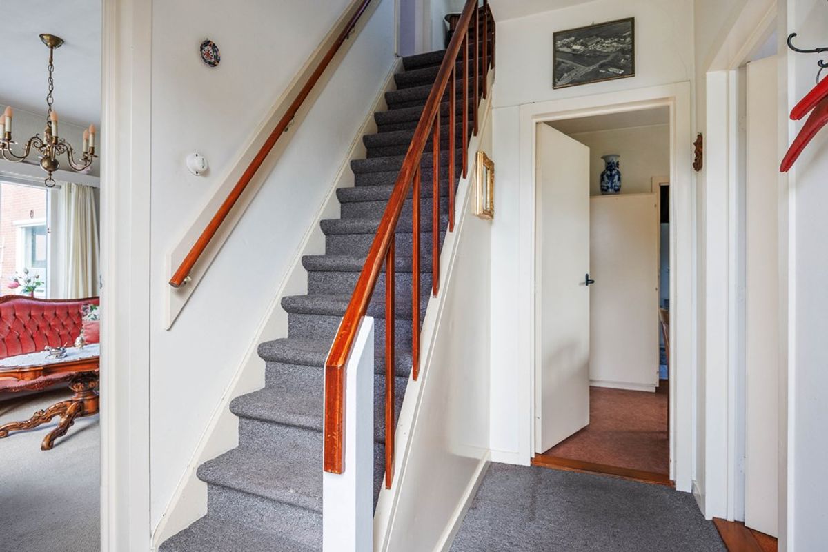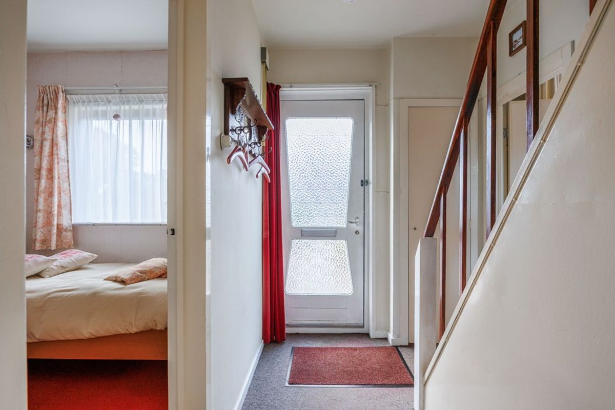 Entree/hal met trapopgang en meterkast. Aan de rechterzijde bevindt zich een slaapkamer op de begane grond – praktisch voor wie gelijkvloers wil wonen.