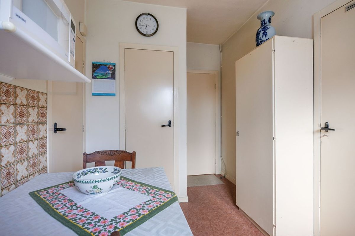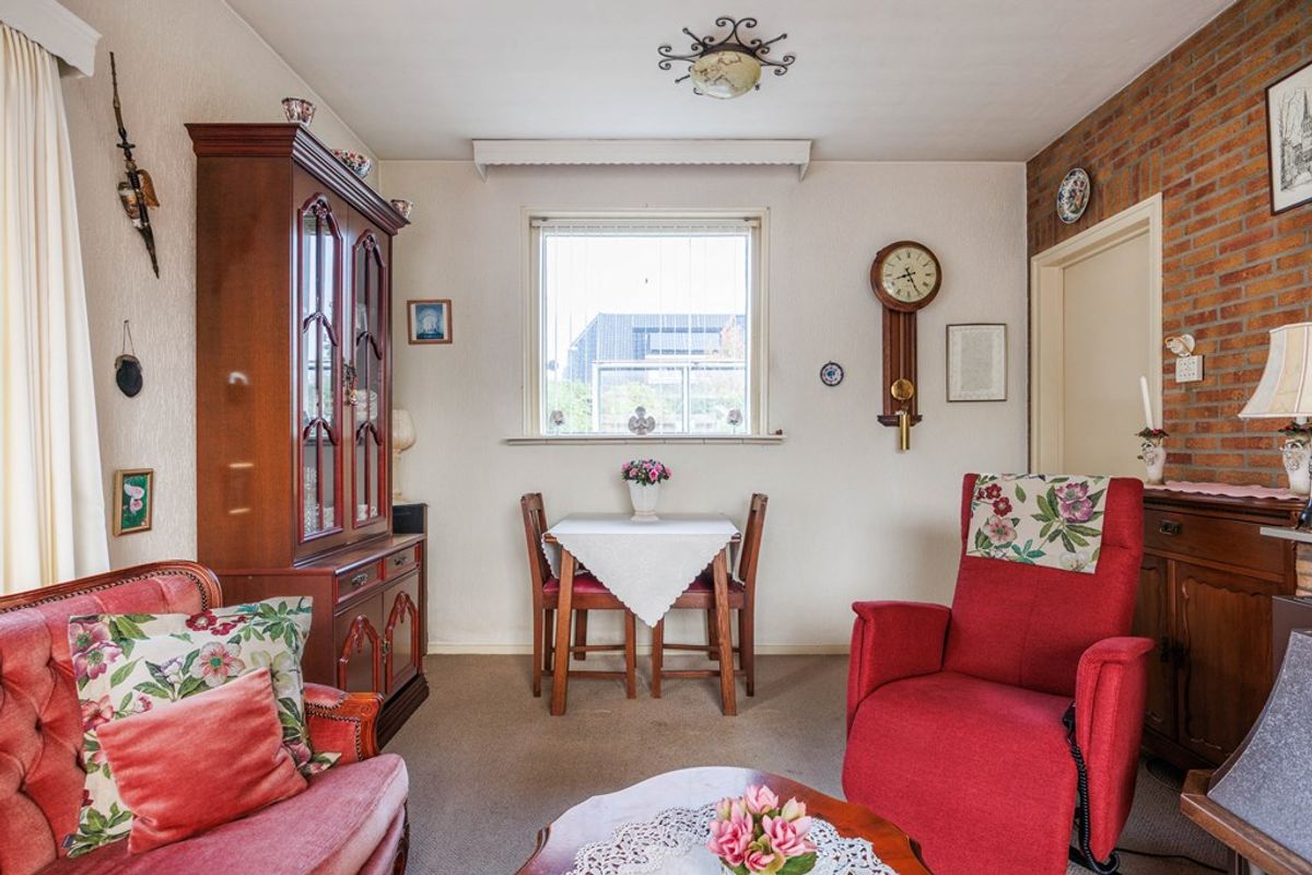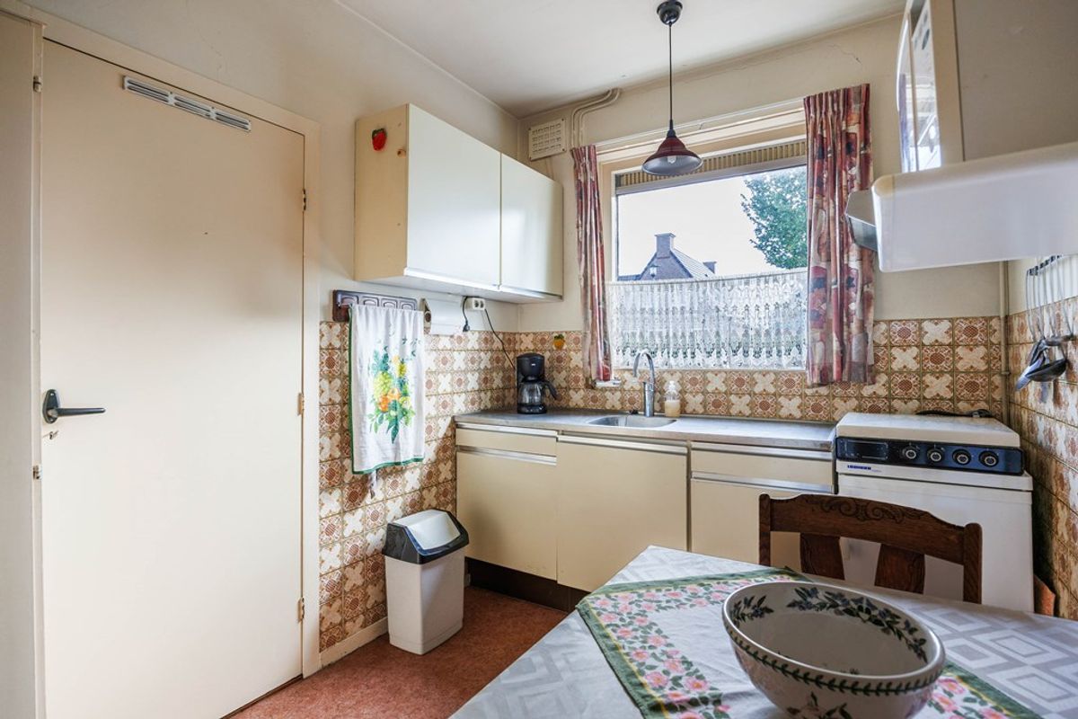 De lichte woonkamer met haardpartij biedt uitzicht op de straat en directe verbinding met de gesloten keuken. De keuken beschikt over een ruime kelderkast voor voorraad en keukenbenodigdheden.