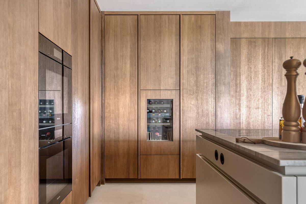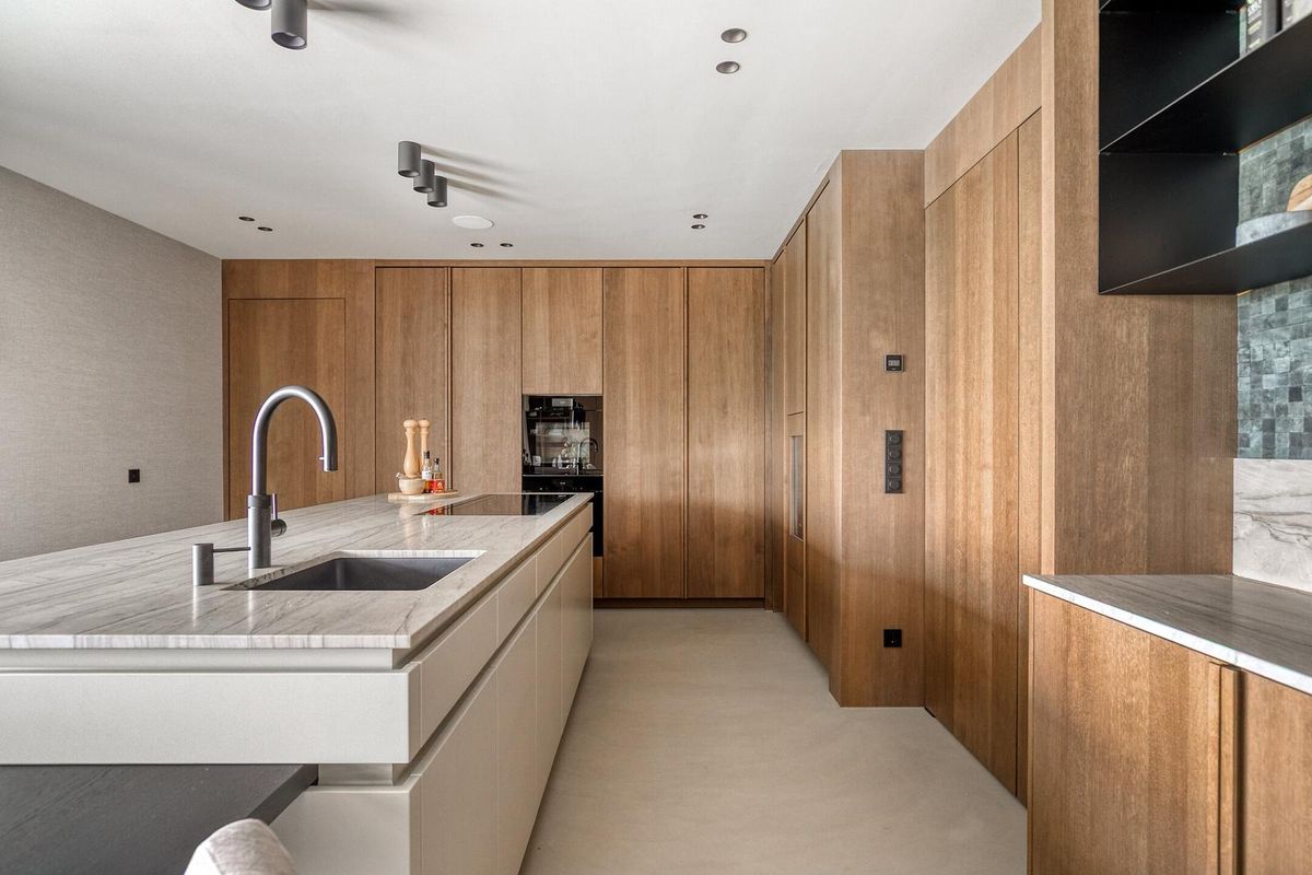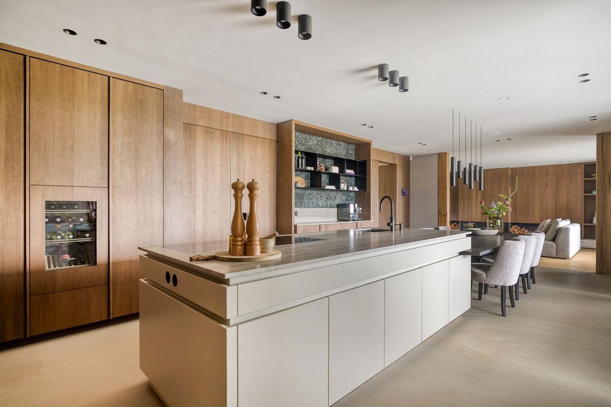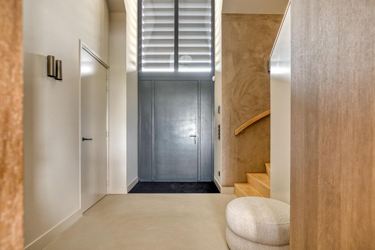Binnenkomen doet u in stijl: een imposante hal van ruim 5 meter hoog, met massief houten Z-trap, suedine wandbekleding en elektrische louvre panelen van Livium. Dubbele fineerhouten taatsdeuren geven toegang tot de leefkeuken.