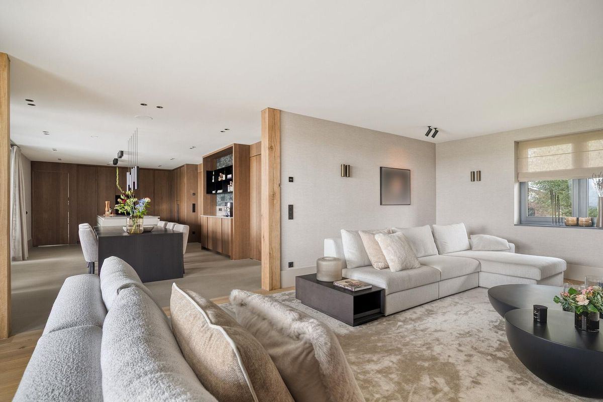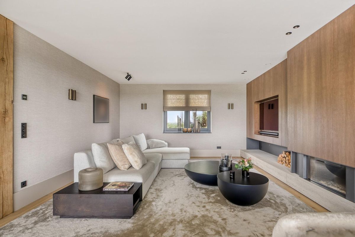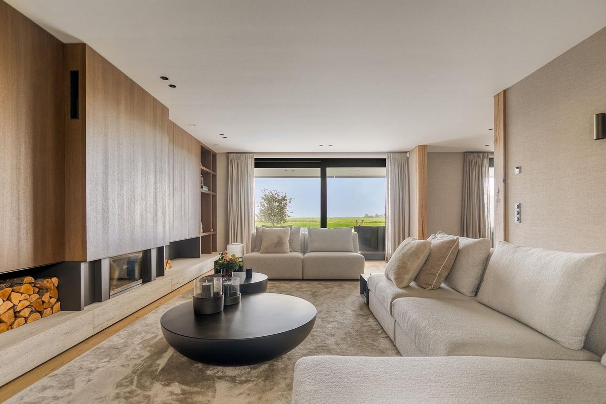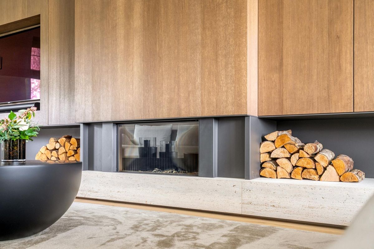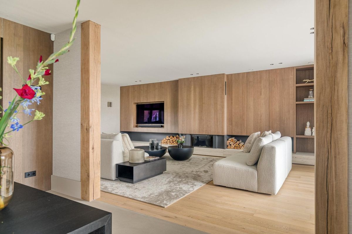 De woonkamer ademt klasse. Een maatwerk wandmeubel met travertin accenten, een houtgestookte designhaard van Kalfire en een prachtige eiken vloer zorgen voor warmte en sfeer. De ruimte wordt omlijst door massieve eiken staanders en subtiel verlichte bronzen inbouwspots.