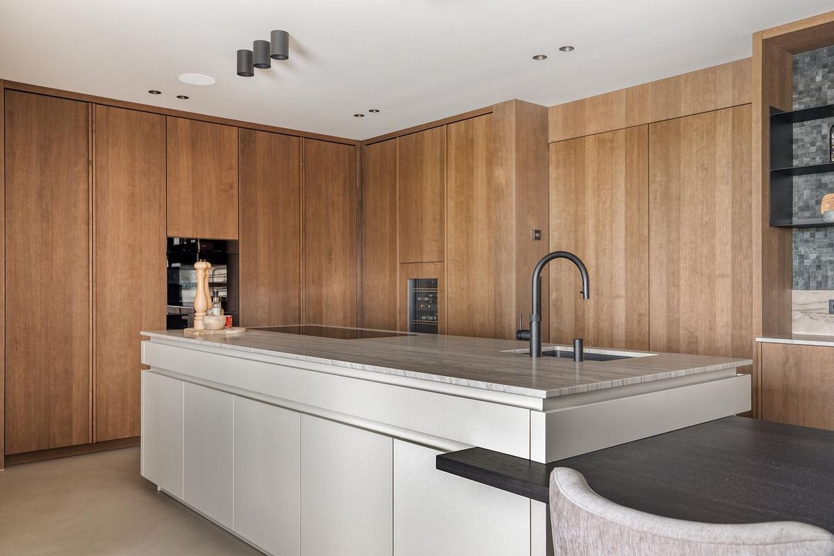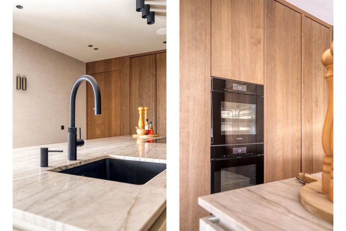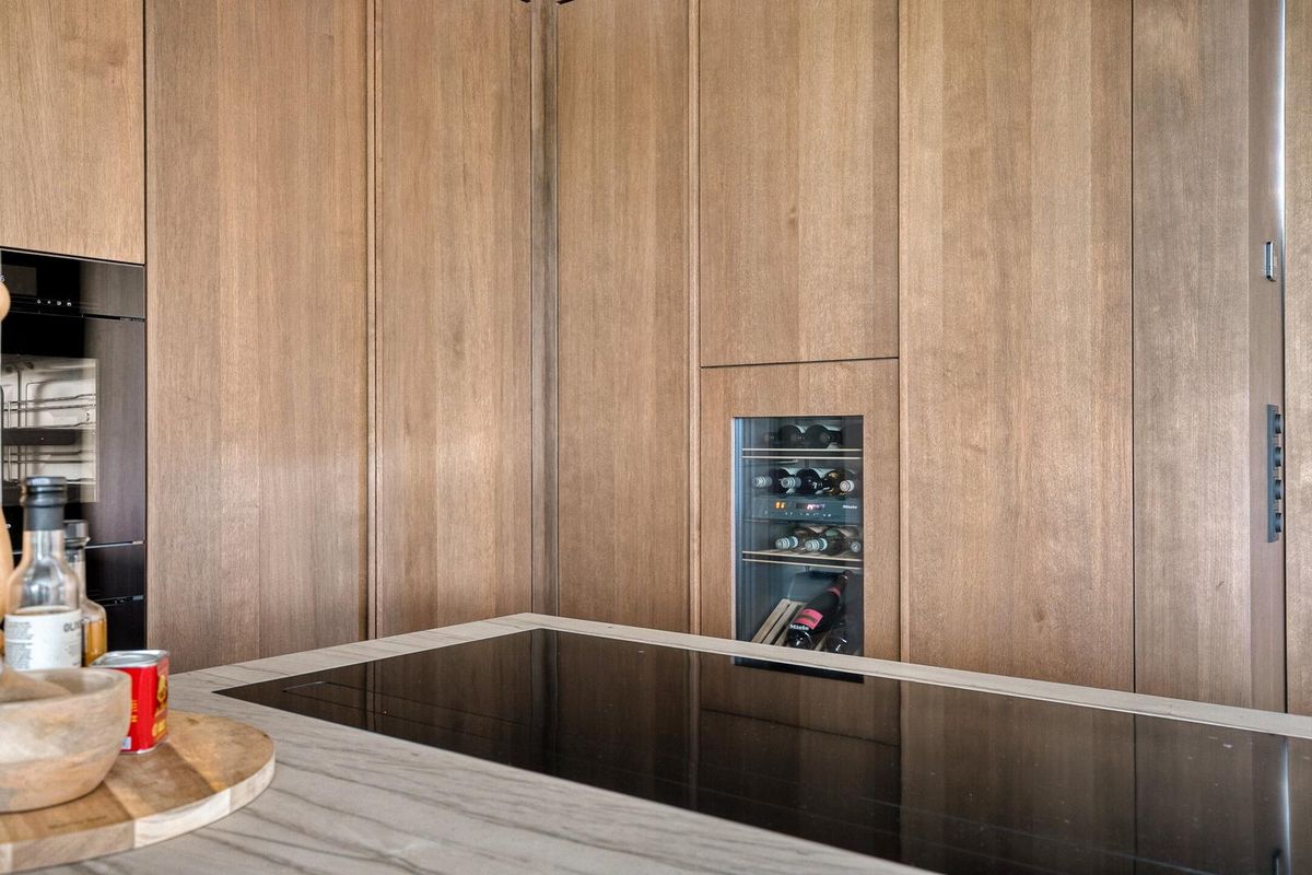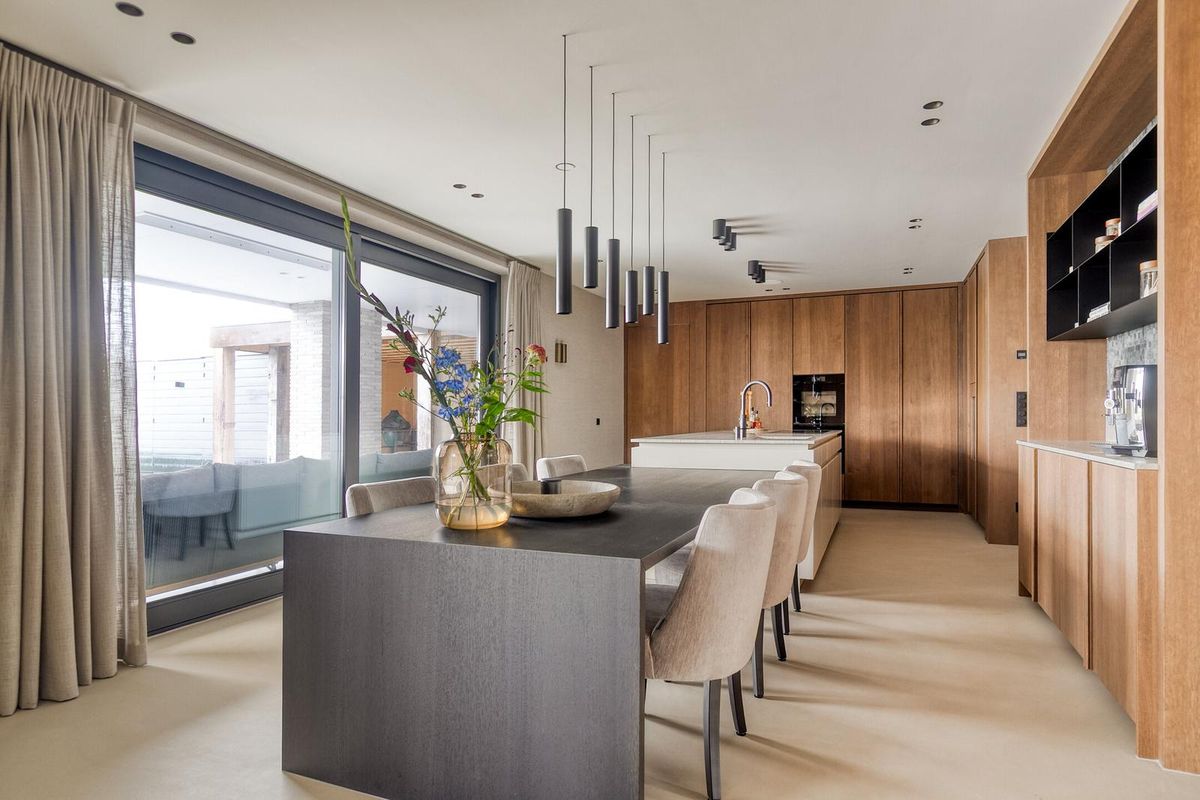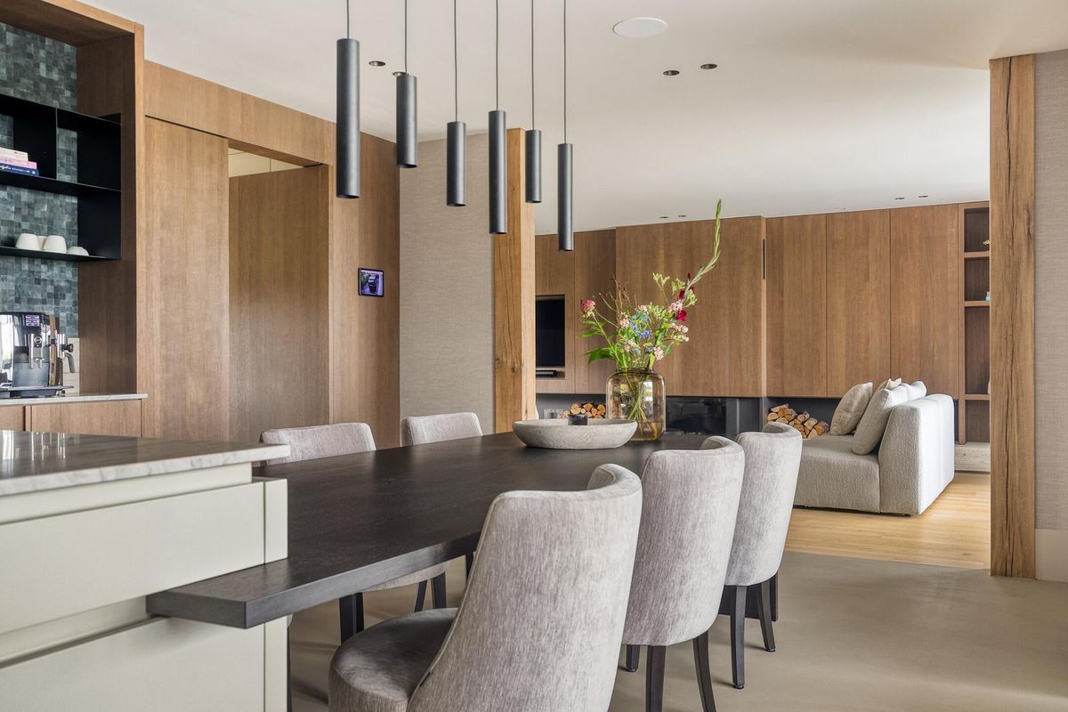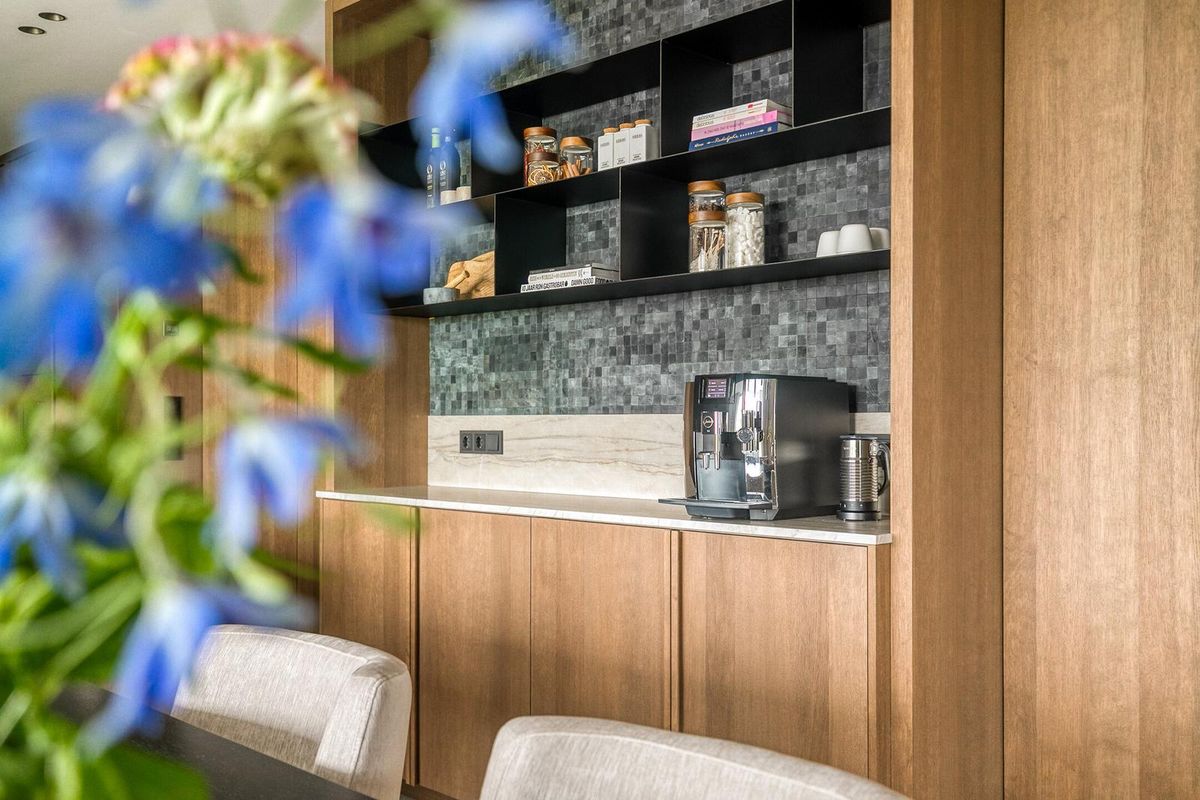 Het hart van de woning is deze high-end leefkeuken. Een imposant kookeiland in uniek Braziliaans kwartsiet, luxe inbouwapparatuur van Miele (stoomoven, wijnklimaatkast, dubbele koelkasten), Quooker en geïntegreerde afzuiging. De op maat gemaakte eiken tafel en koffiecorner met Alphenberg lederen mozaïek maken het geheel af. Grote schuifpuien van vier meter breed zorgen voor een naadloze verbinding met de tuin.